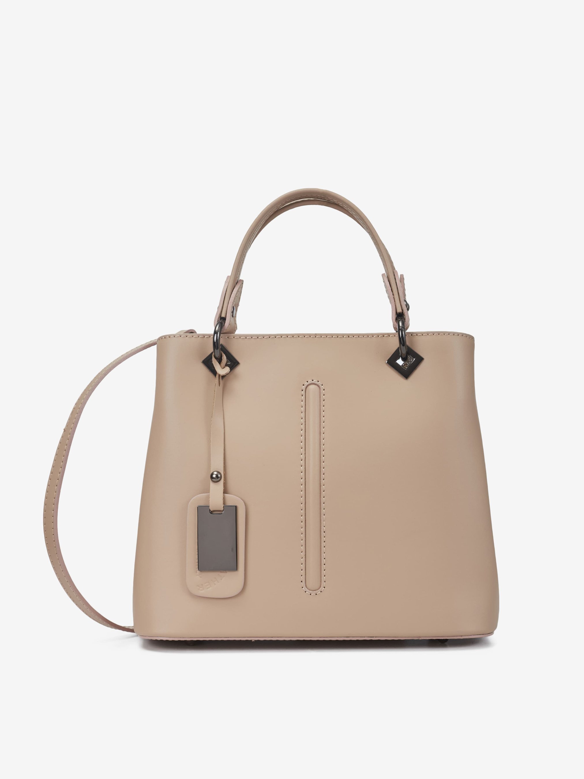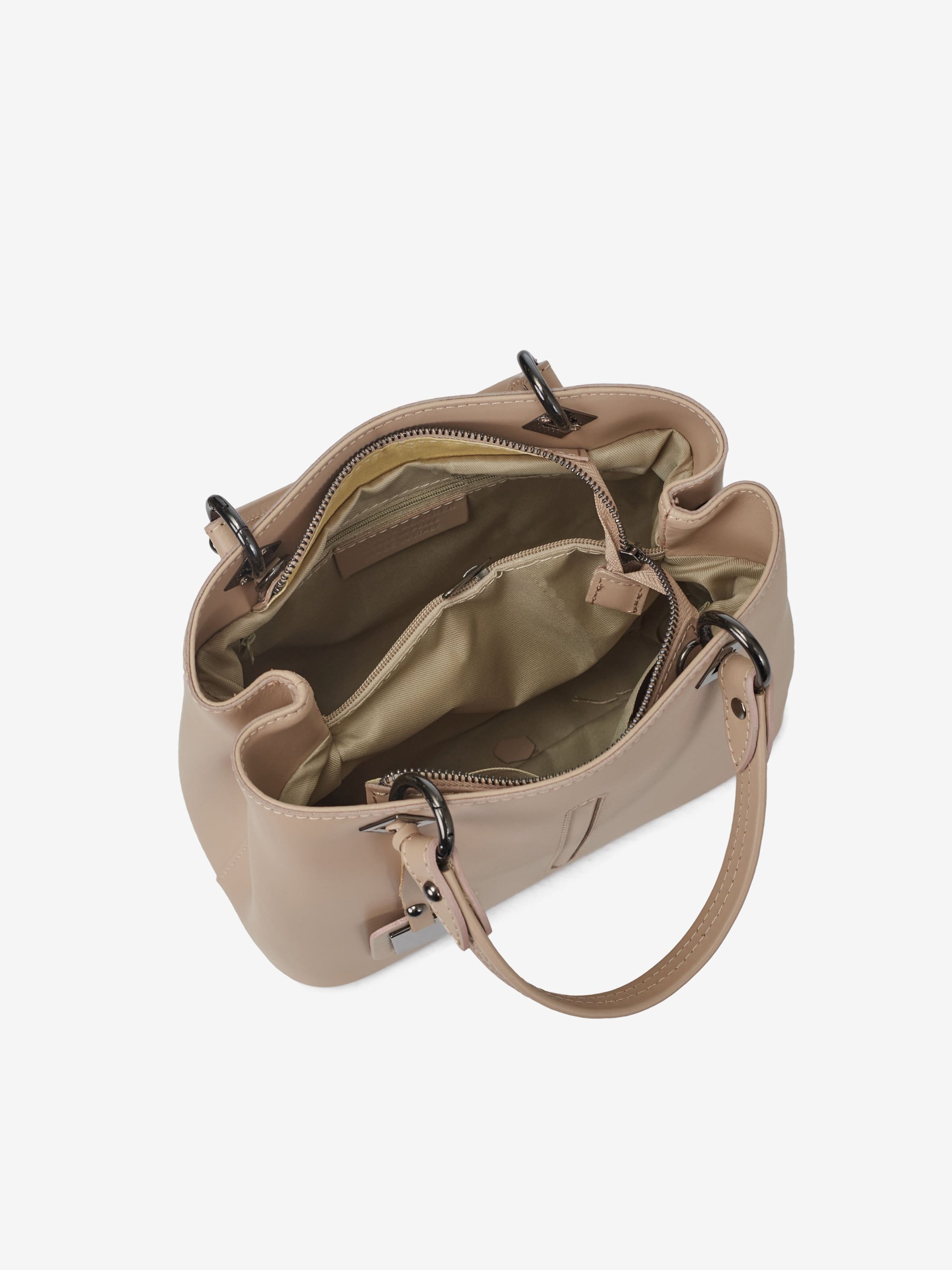 Деталі: Матеріал: 100% натуральна шкіра Шкіра має гладку фактуру Фурнітура чорного кольору Розміри (Ш x В x Г) - 25 x 20 x 14 см Усередині 2 відділення розділені кишенею на блискавці та 3 кишеньки для дрібниць, одна з них на блискавці Позаду горизонтальна кишеня на блискавці З боків знаходяться кліпси для зміни розміру та форми сумки Ручки знімні на карабінах Висота ручок 10 см У комплекті знімний ремінець на карабінах не регулюється, довжина 95 см Застібка: блискавка Підкладка бавовна