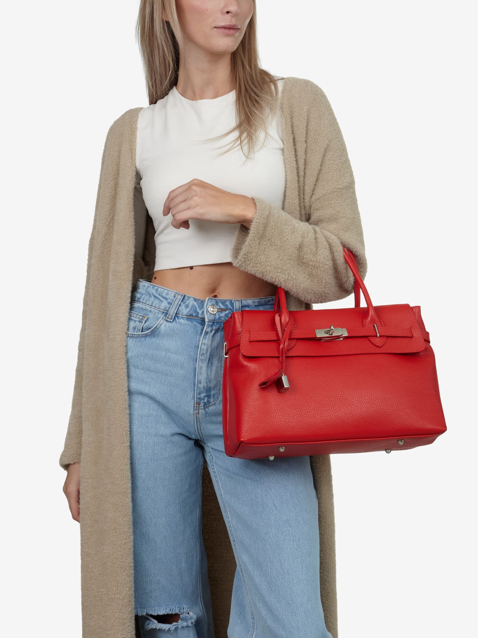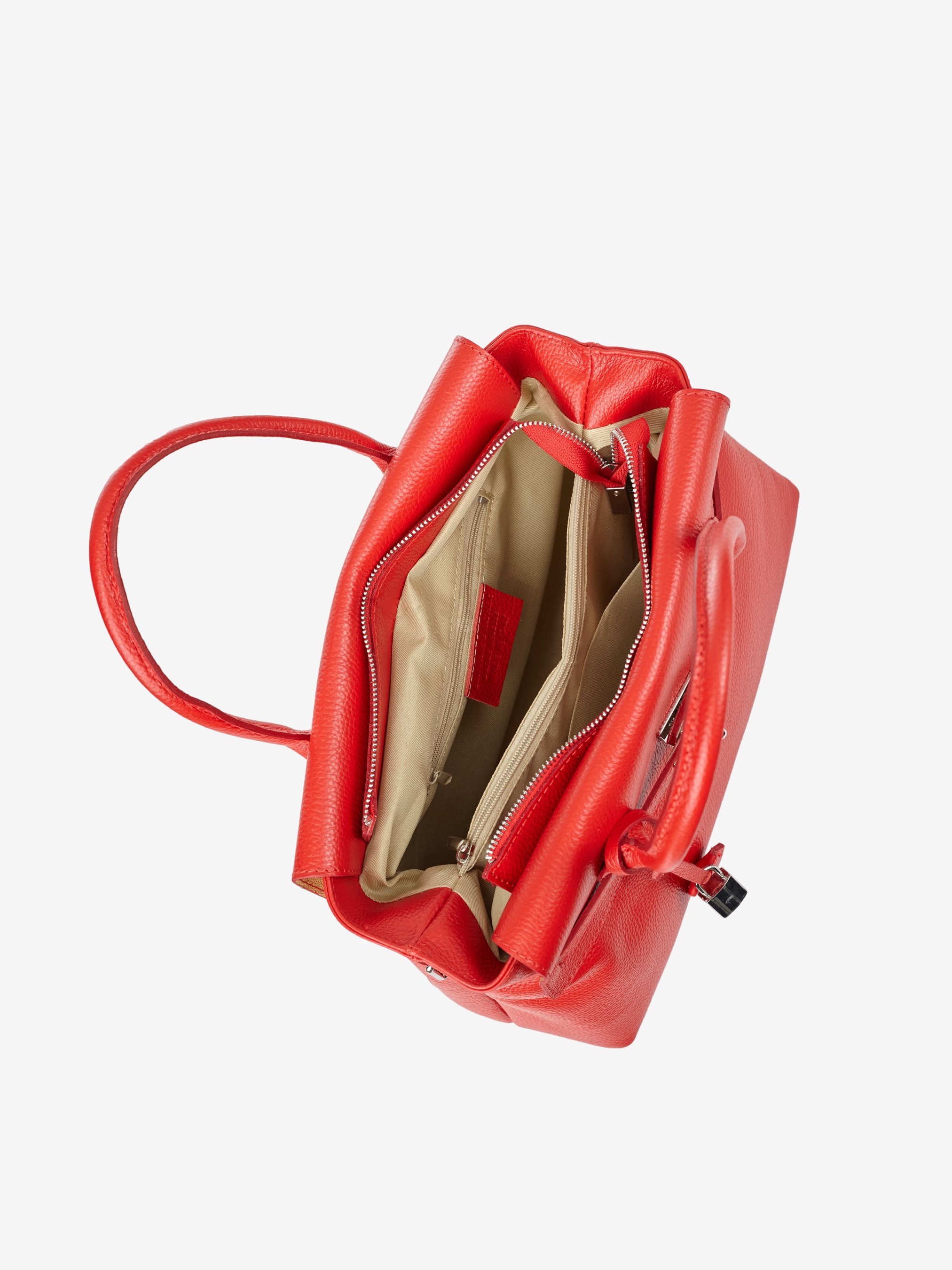 Деталі: Матеріал: 100% натуральна шкіра флотар Фурнітура сріблястого кольору Розміри (Ш x В x Г) – 34 x 22 x 14 см Усередині 2 відділення, розділені кишенею на блискавці та 2 кишеньки для дрібниць, одна з них на блискавці Позаду кишенька на блискавці Підкладка: 100% бавовна Застібка: блискавка Ремінець шкіряний, регулюється, знімний, максимальна довжина 110 см Висота ручок 14 см