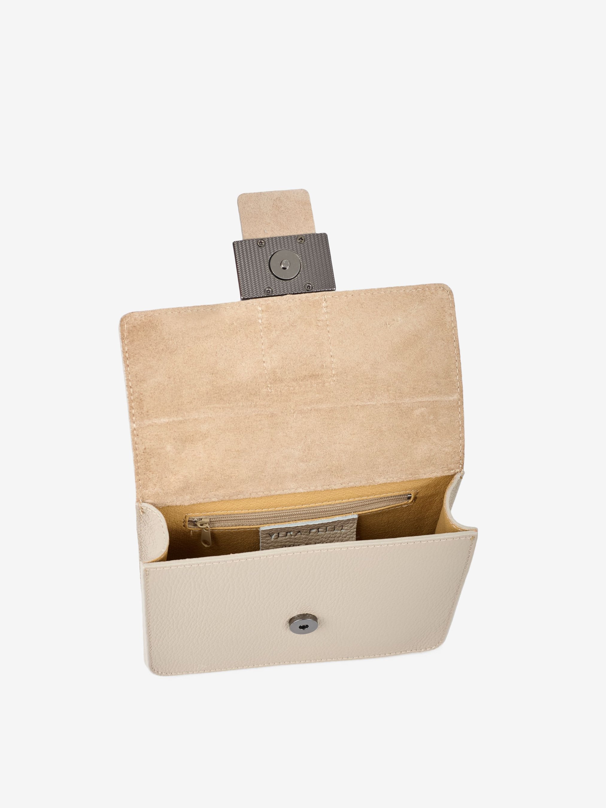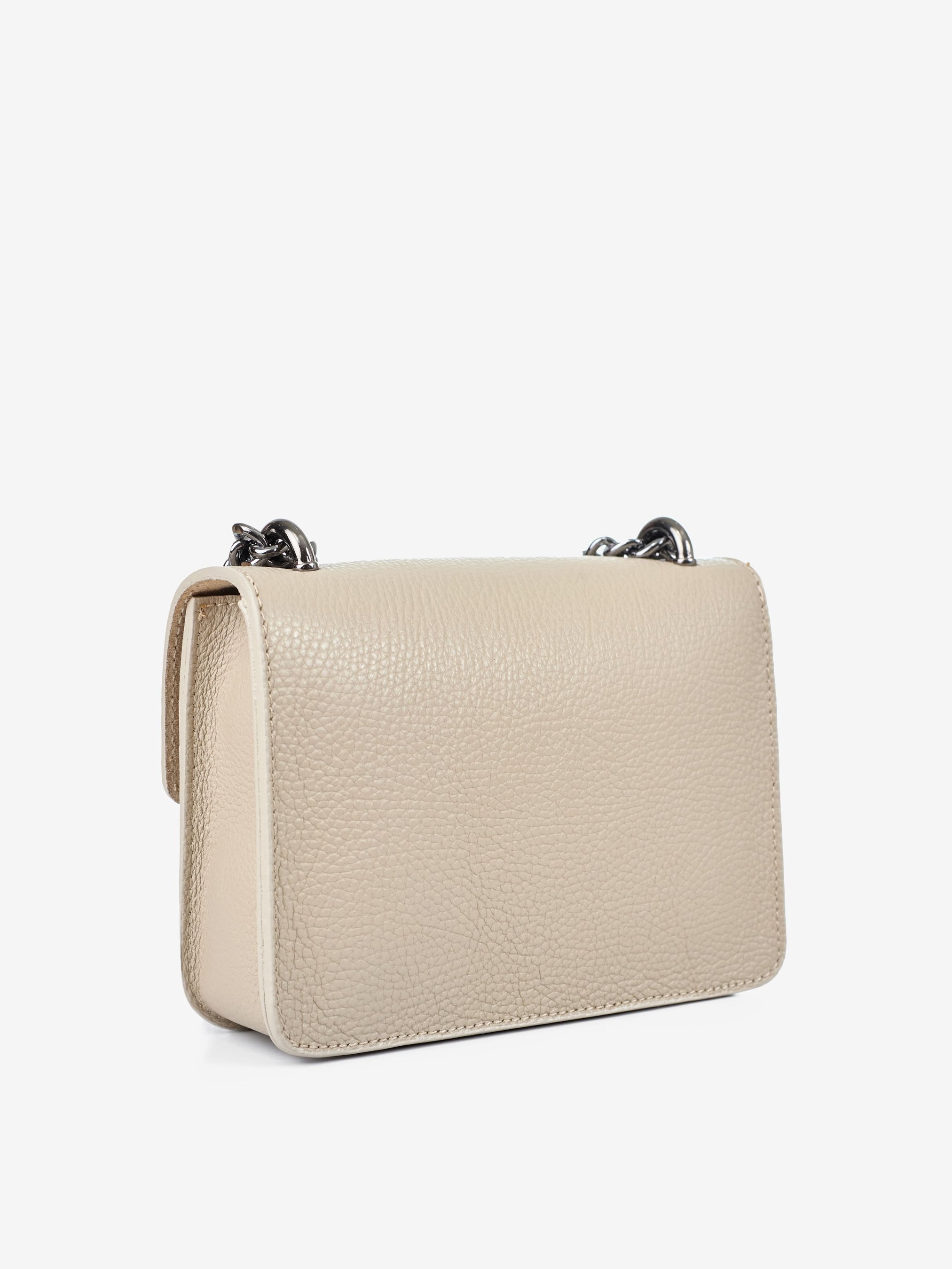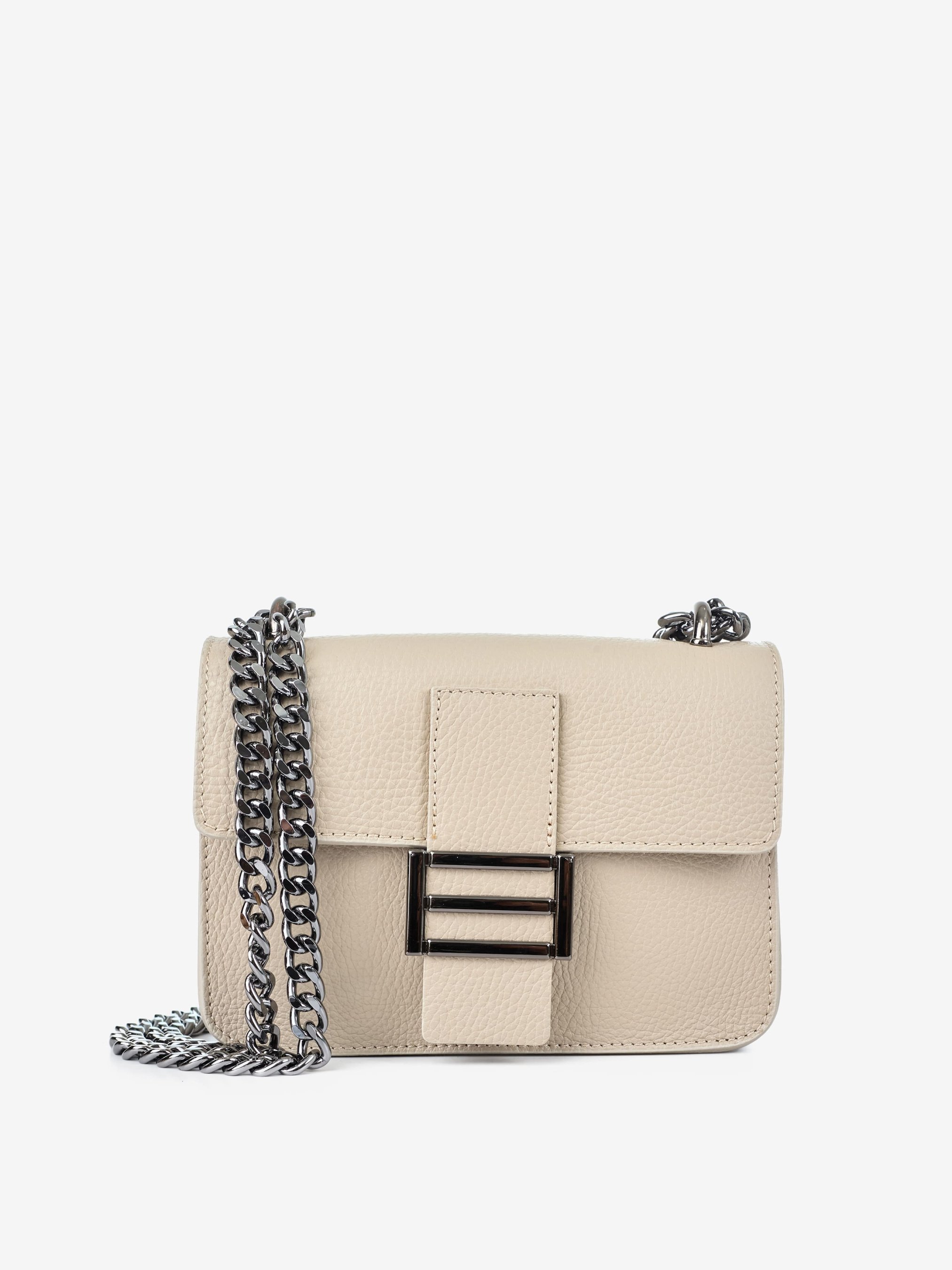 Деталі: Матеріал: 100% натуральна шкіра Шкіра має фактуру флотар Фурнітура чорного кольору Розміри (Ш x В x Г) - 20 х 14 х 6 см Усередині 1 відділення та 1 кишенька для дрібниць на блискавці Підкладка: без підкладки Застібка: клапан на магніті Ремінець-ланцюжок, не регулюється, незнімний, максимальна довжина 115 см Висота ручок-ланцюжків 31 см