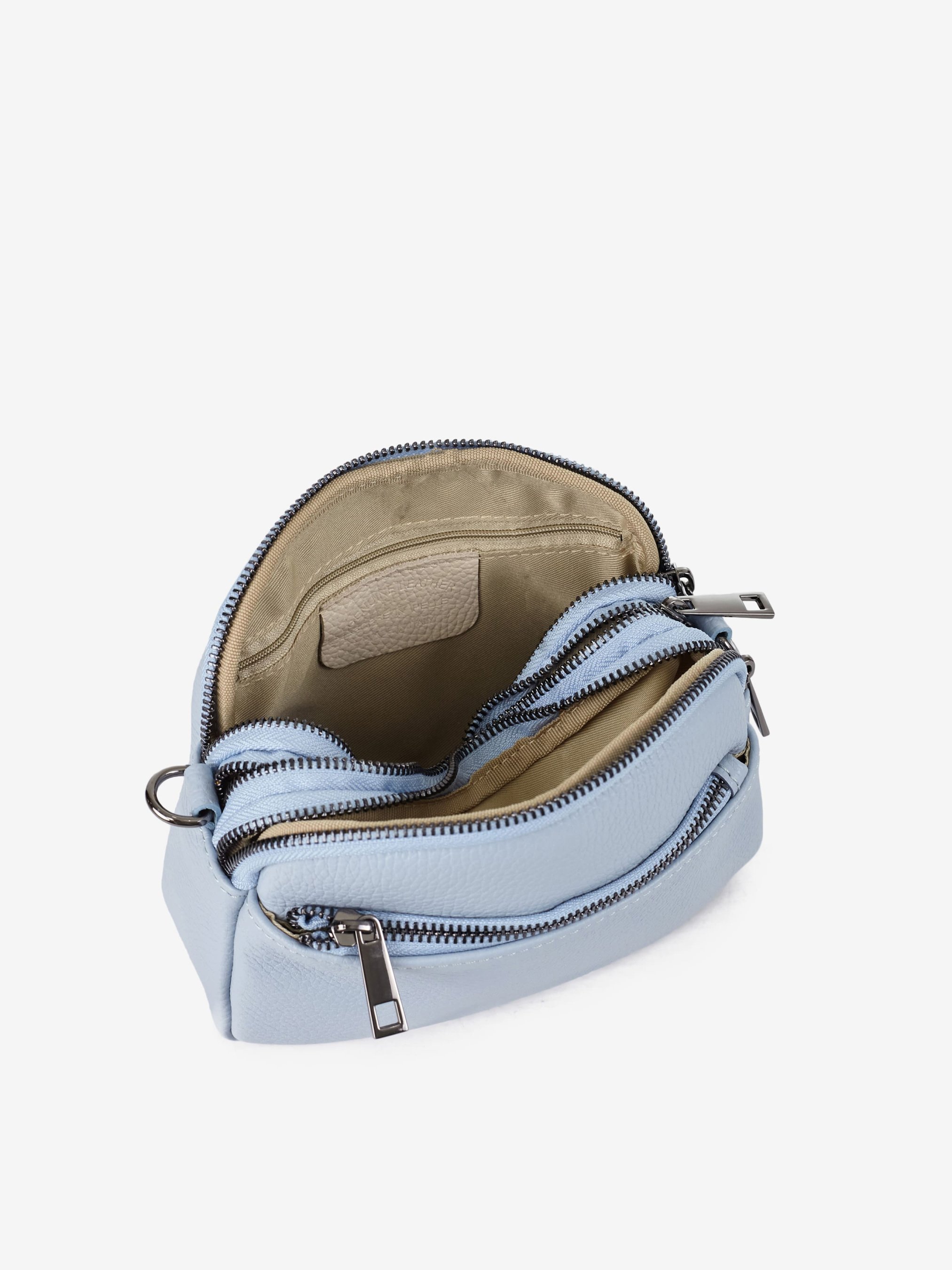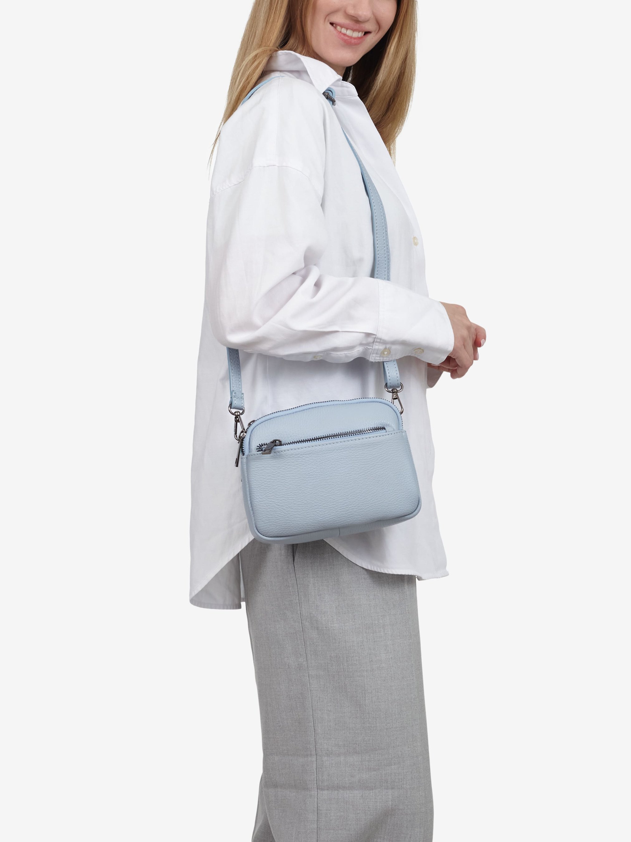 Деталі: Матеріал: 100% натуральна шкіра флотар Фурнітура чорного кольору Розміри (Ш x В x Г) – 20 x 14 x 6 см Усередині 3 відділення на блискавці, та кишенька для дрібниць на блискавці Спереду кишенька на блискавці Підкладка: бавовна Застібка: блискавка Ремінець шкіряний, знімний, регулюється, максимальна довжина 120 см