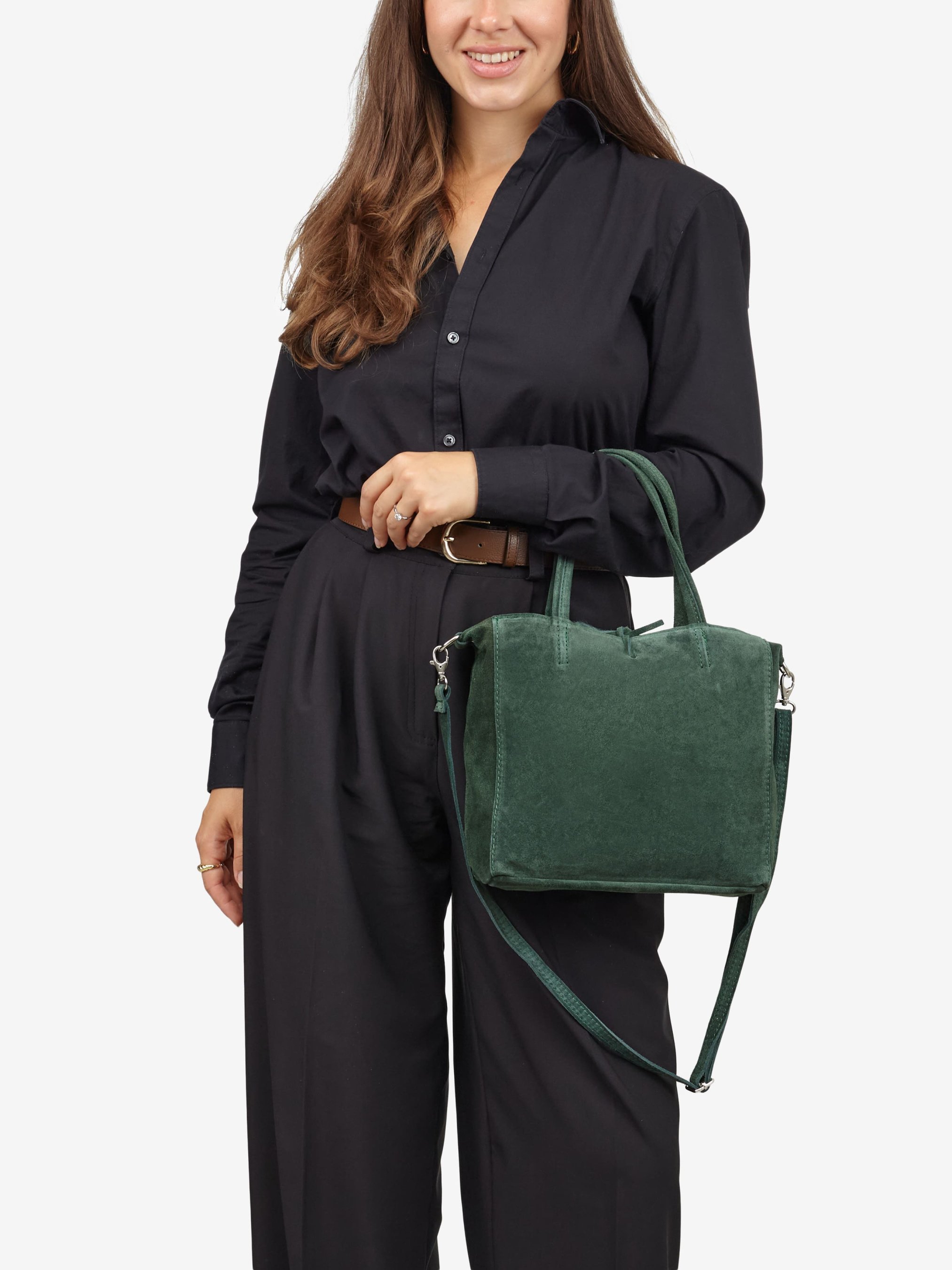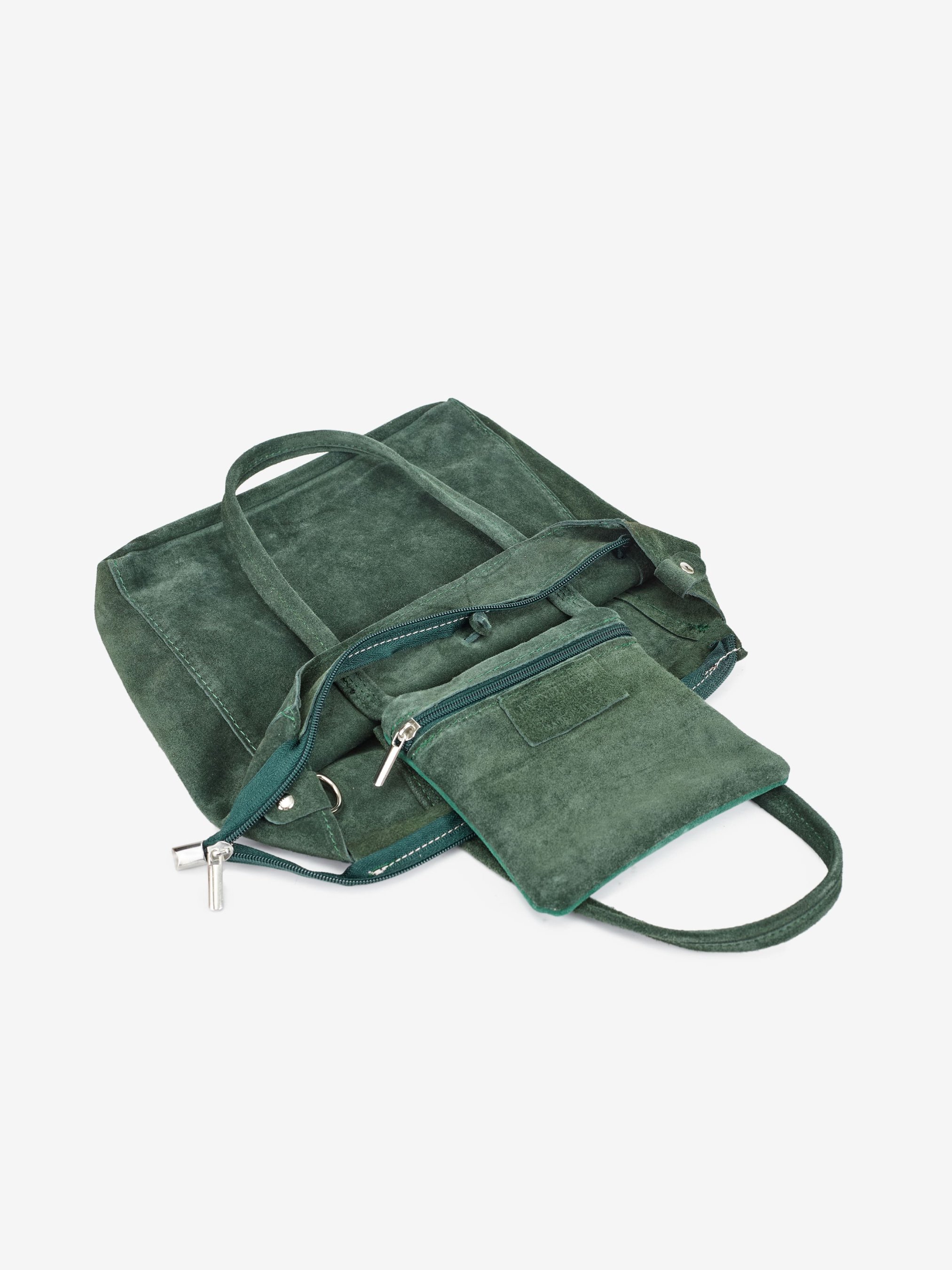 Деталі: Матеріал: 100% натуральна замша Фурнітура сріблястого кольору Розміри (Ш x В x Г) - 24 х 22 х 8 см Всередині 1 відділення та кишенька для дрібниць на блискавці Підкладка: відсутня Застібка: блискавка, зав'язки Висота ручок 17 см Ремінець замшевий, регулюється, знімний, максимальна довжина 115 см