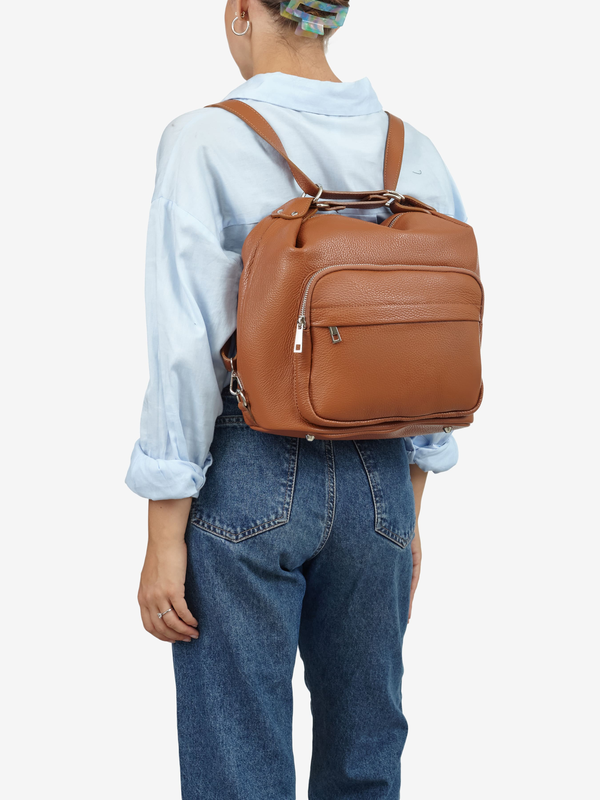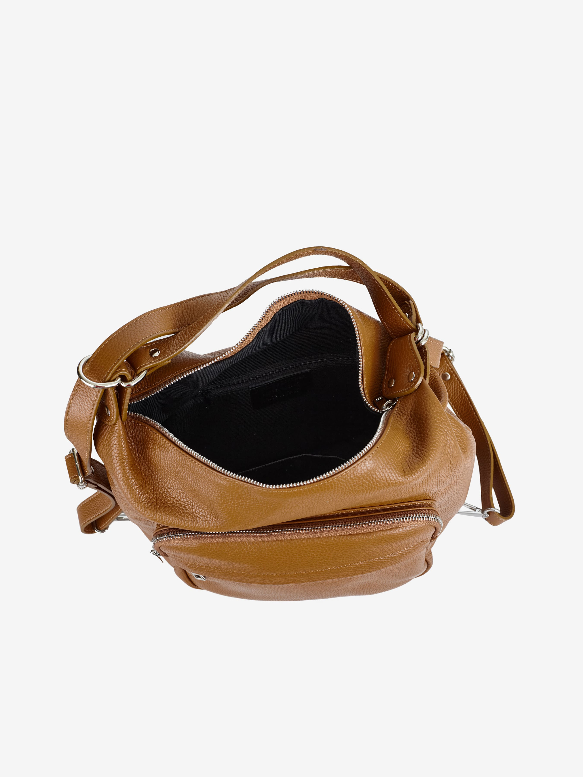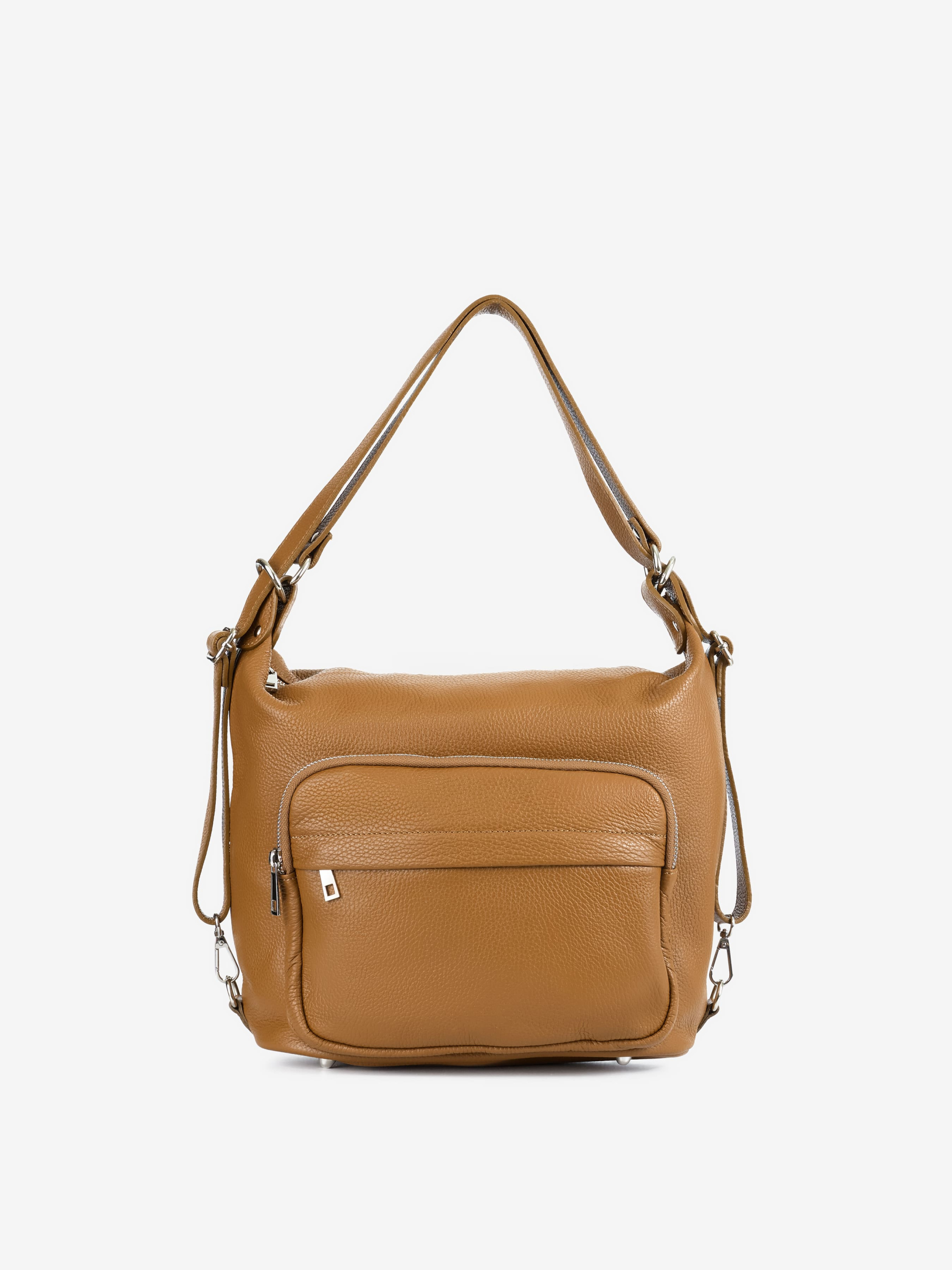 Деталі: Матеріал: 100% натуральна шкіра флотар Фурнітура сріблястого кольору Розміри (Ш x В x Г) - 35 х 27 х 13 см Усередині 1 відділення та 2 кишеньки для дрібниць, одна з них на блискавці Позаду кишенька на блискавці Спереду 2 кишеньки на блискавці Підкладка: бавовна Застібка: блискавка Дві лямки-ручки шкіряні, регулюються, незнімні, максимальна висота 45 см