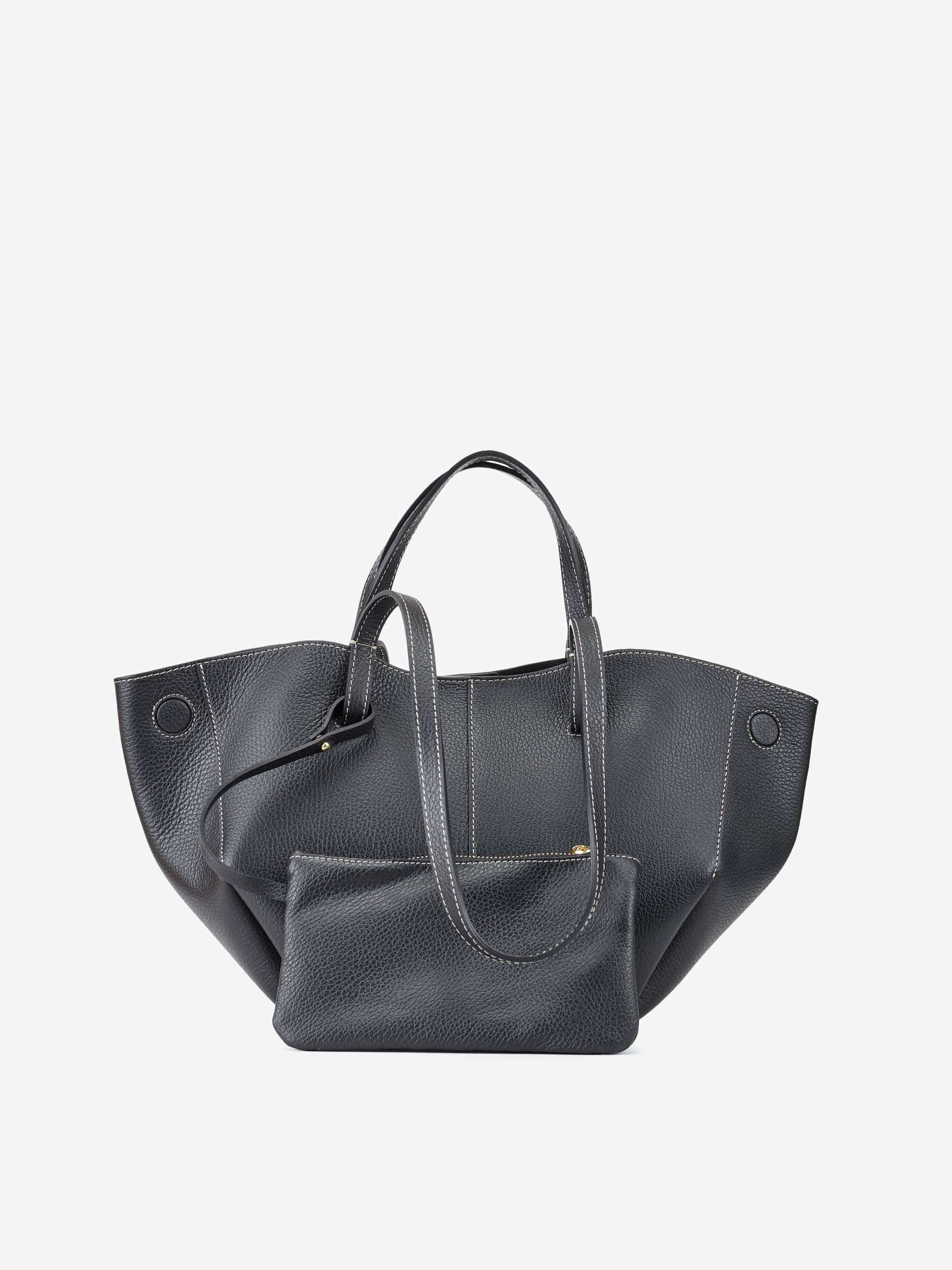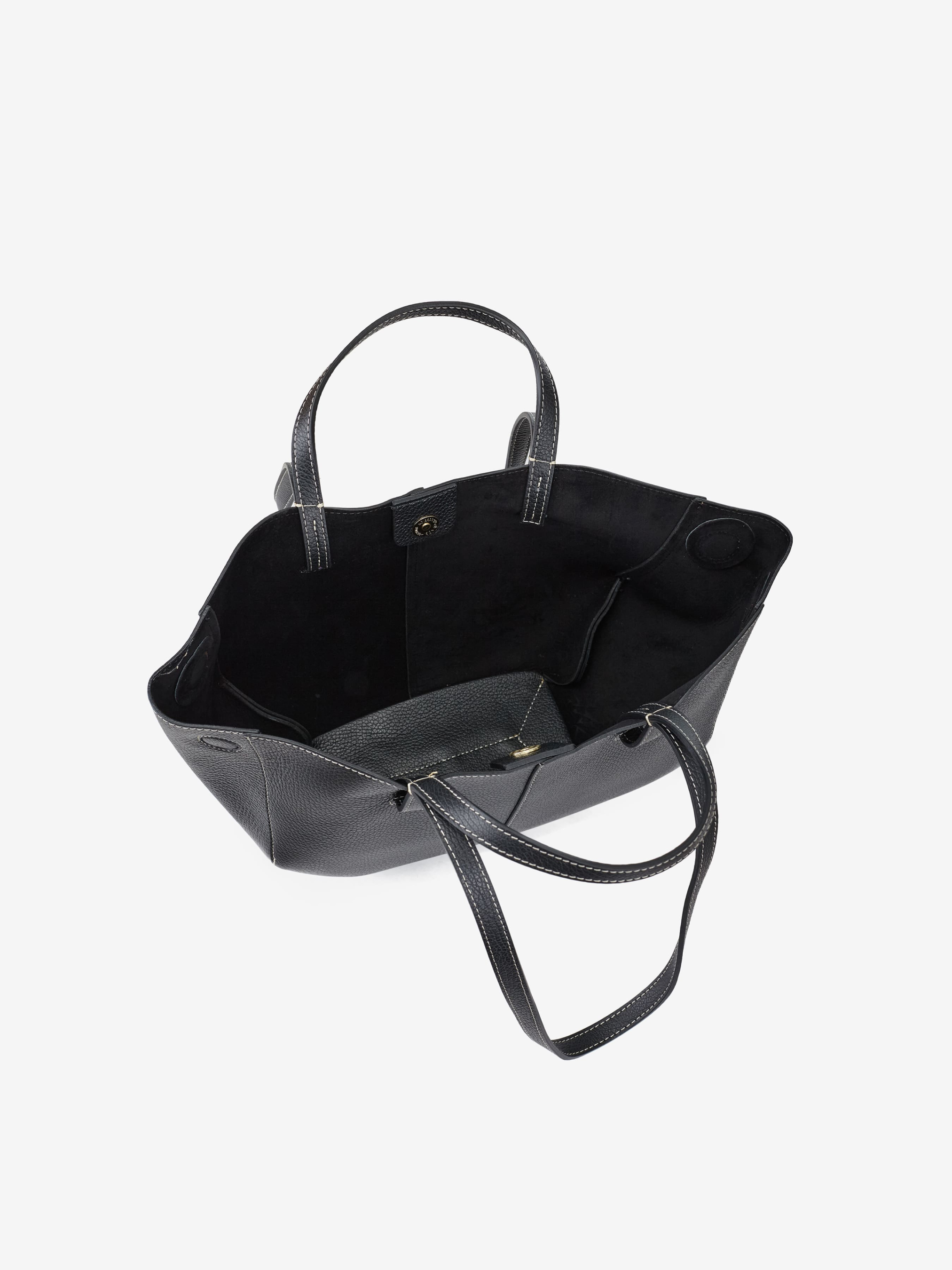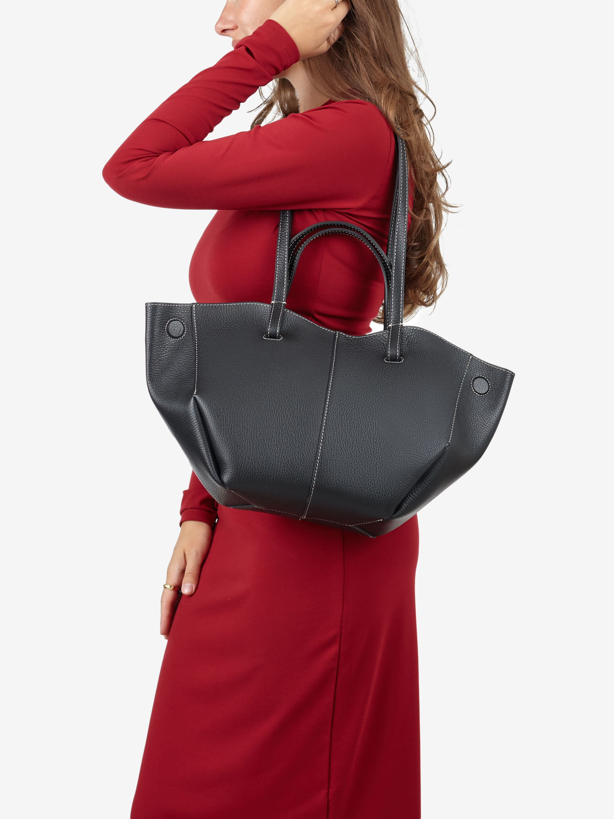 Деталі: Матеріал: 100% натуральна шкіра флотар Фурнітура золотистого кольору Розміри (Ш x В x Г) – 40 x 22 x 10 см Всередині 1 відділення та косметичка на блискавці Підкладка: замша Застібка: магніт Висота ручок коротких 12 см, довгих – 30 см.