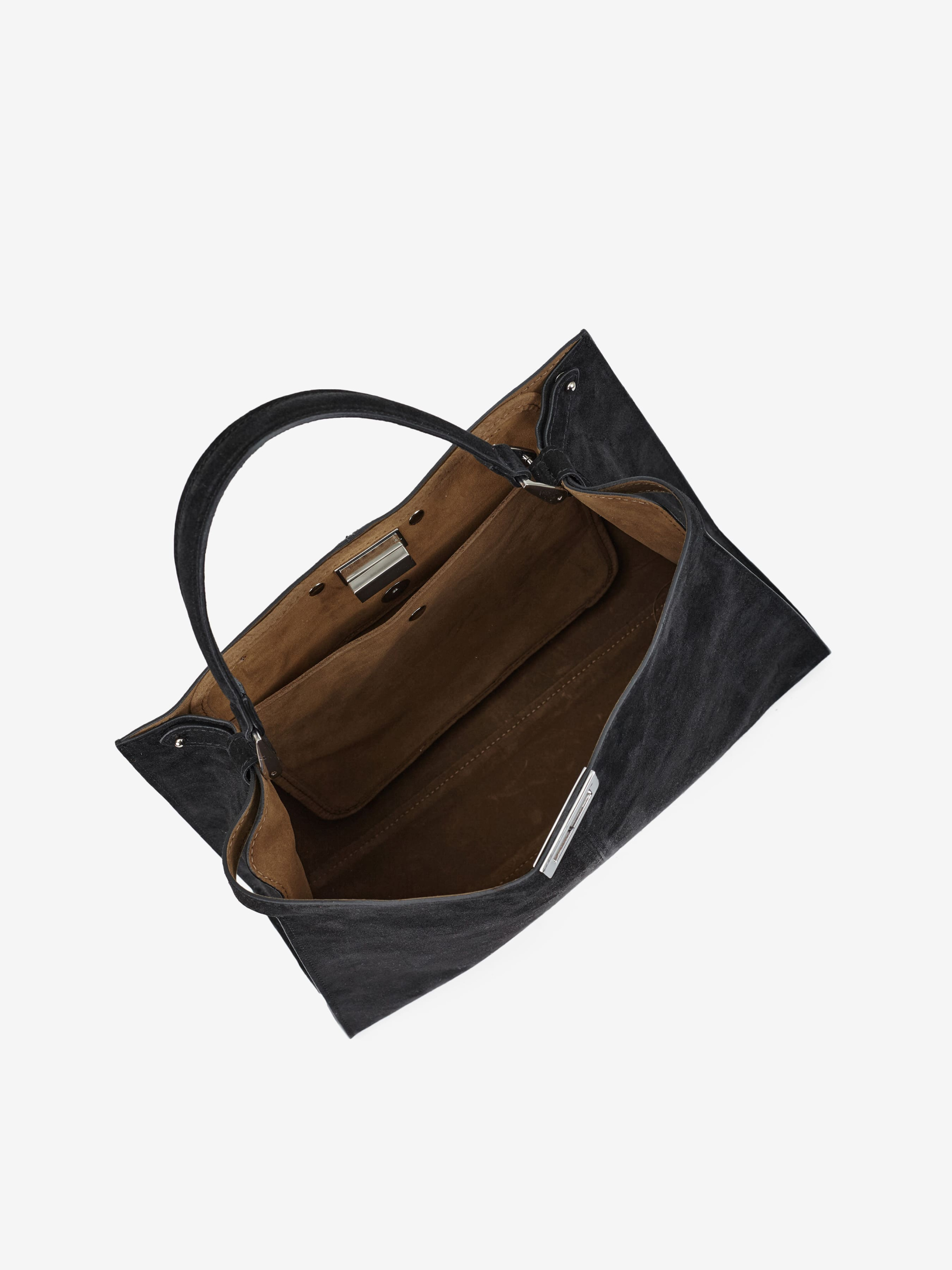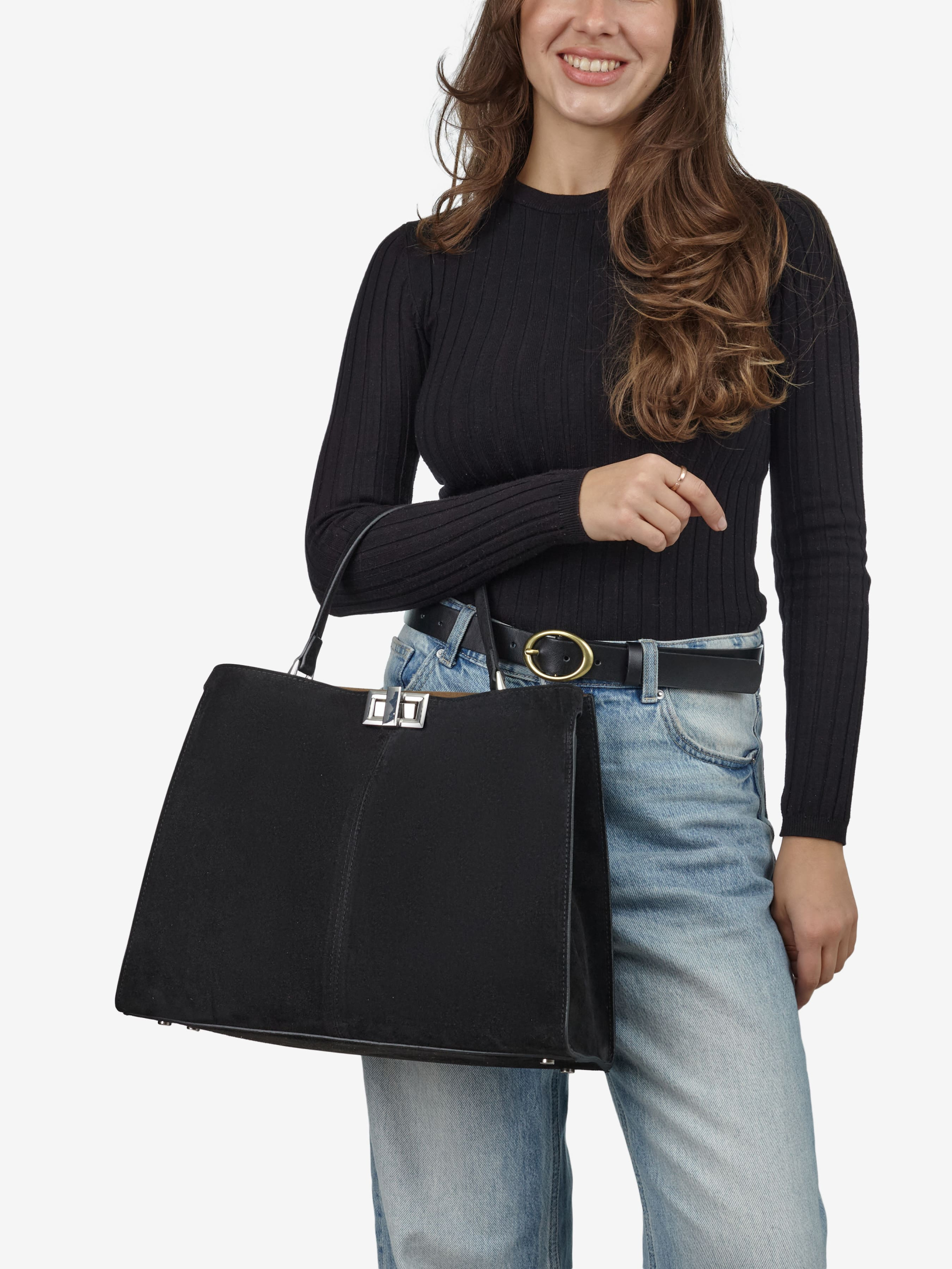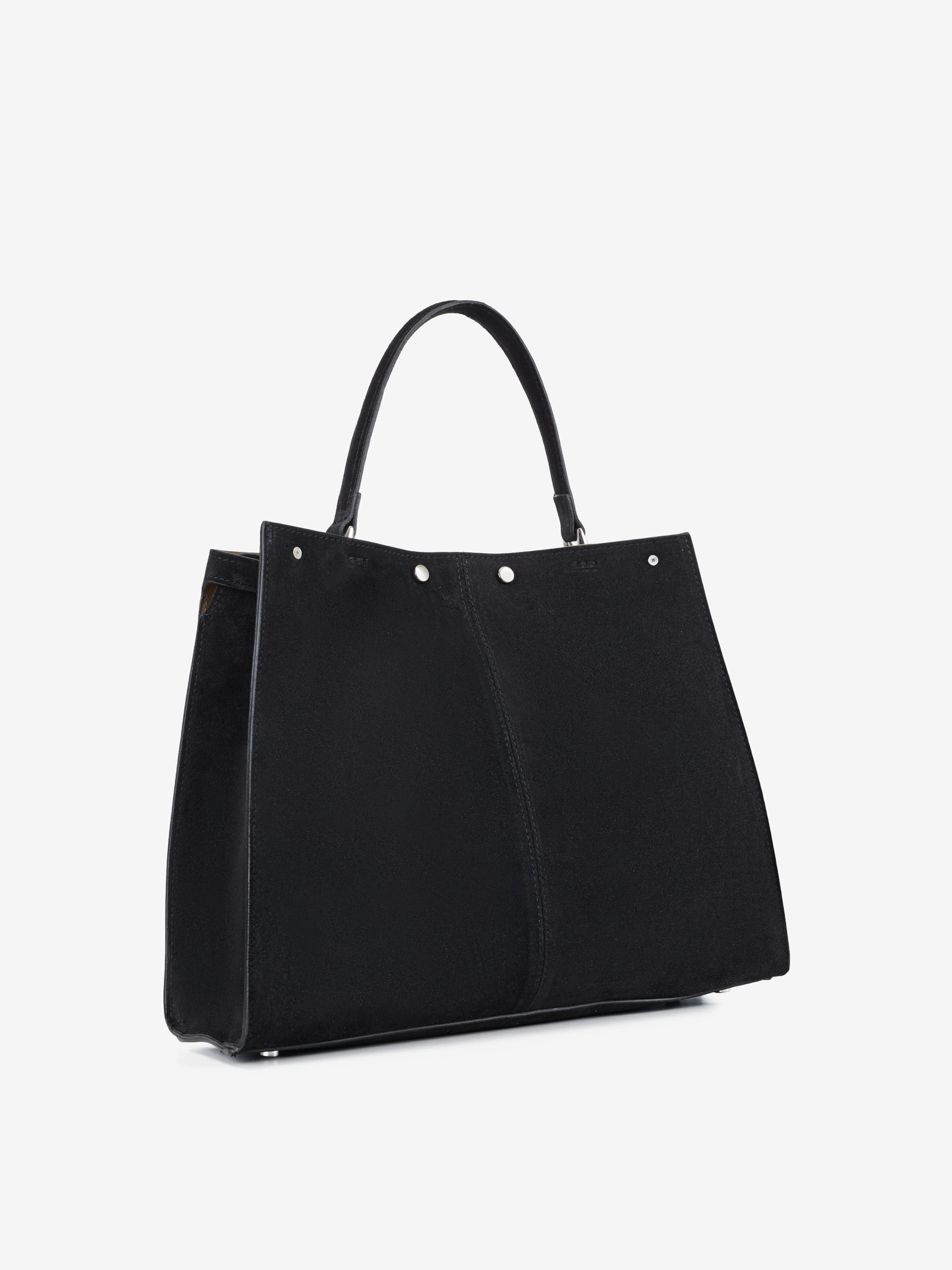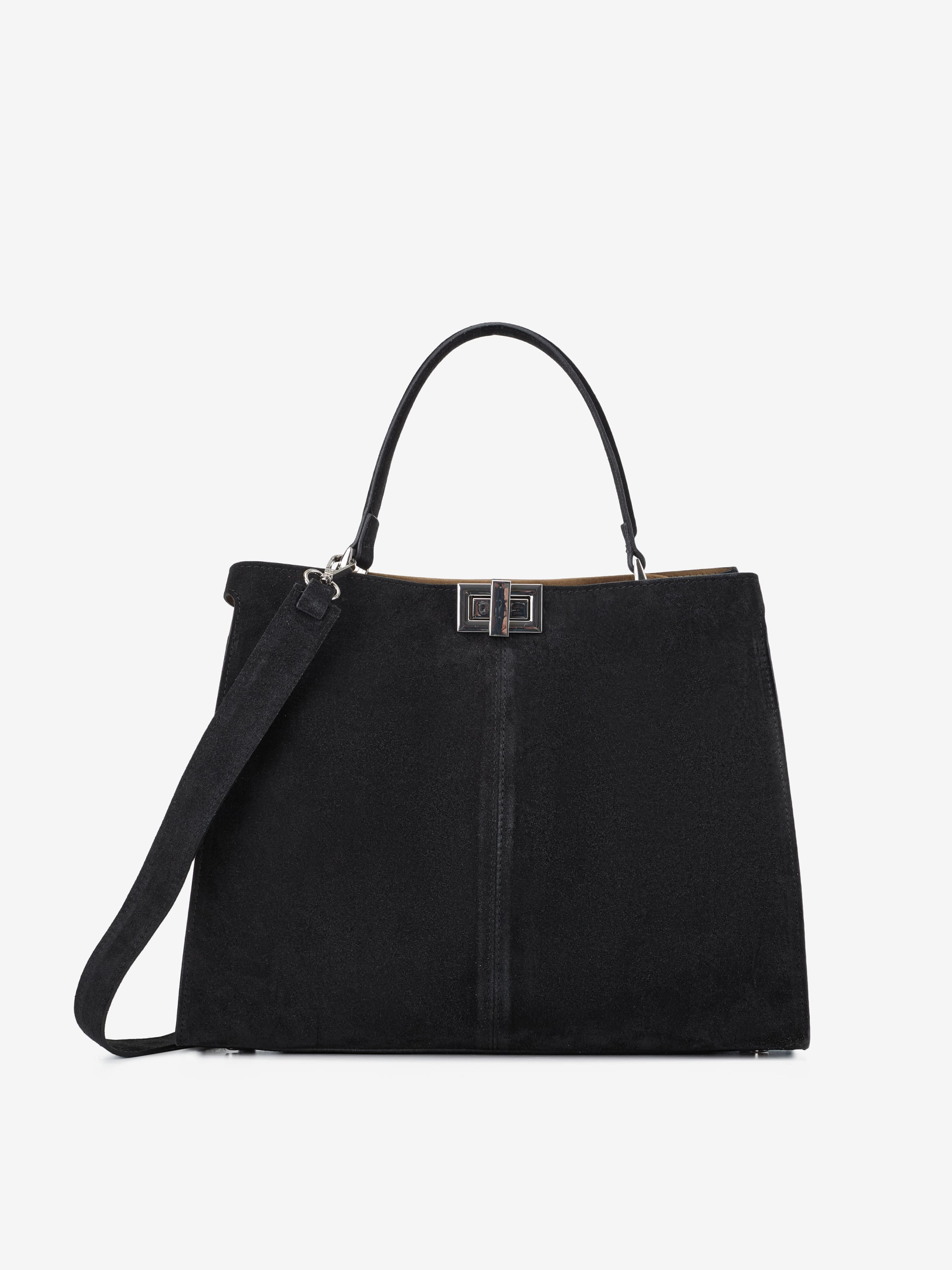Деталі: Матеріал: 100% натуральна замша Фурнітура срібного кольору Розміри (Ш x В x Г) – 37 x 30 x 12 см Усередині 1 відділення та кишенька на кнопці Підкладка: замша Застібка: поворотний замок Замшевий ремінець, знімний, не регулюється, максимальна довжина 80 см Висота ручок маленьких 13 см