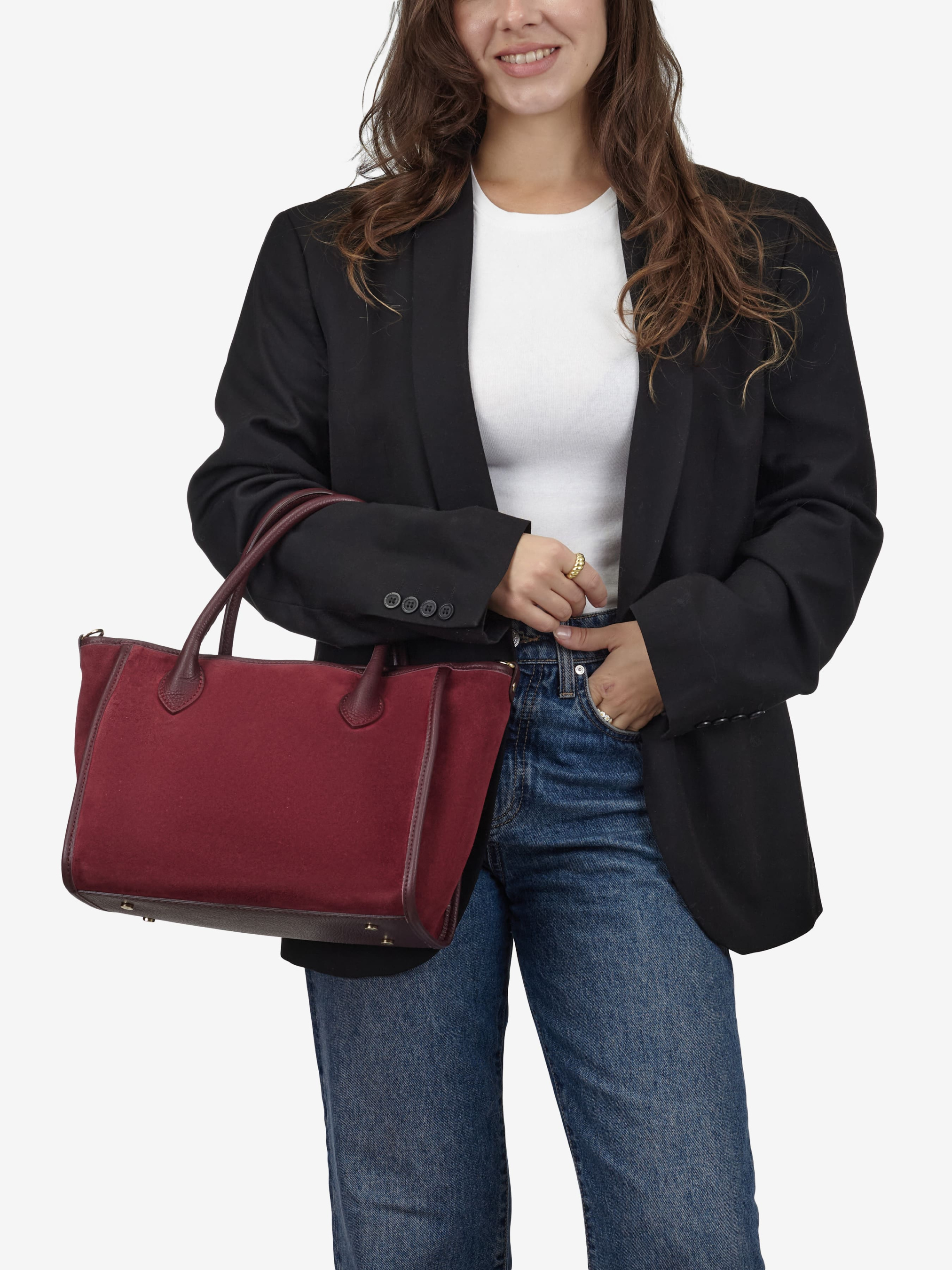 Деталі: Матеріал: 100% натуральна шкіра флотар та замша Фурнітура золотистого кольору Розміри (Ш x В x Г) - 34 х 24 х 14 см Усередині 1 відділення та 2 кишеньки для дрібниць, одна з них на блискавці Підкладка: бавовна Застібка: блискавка Ремінець шкіряний, знімний, регулюється, максимальна довжина 115 см Висота ручок 14 см