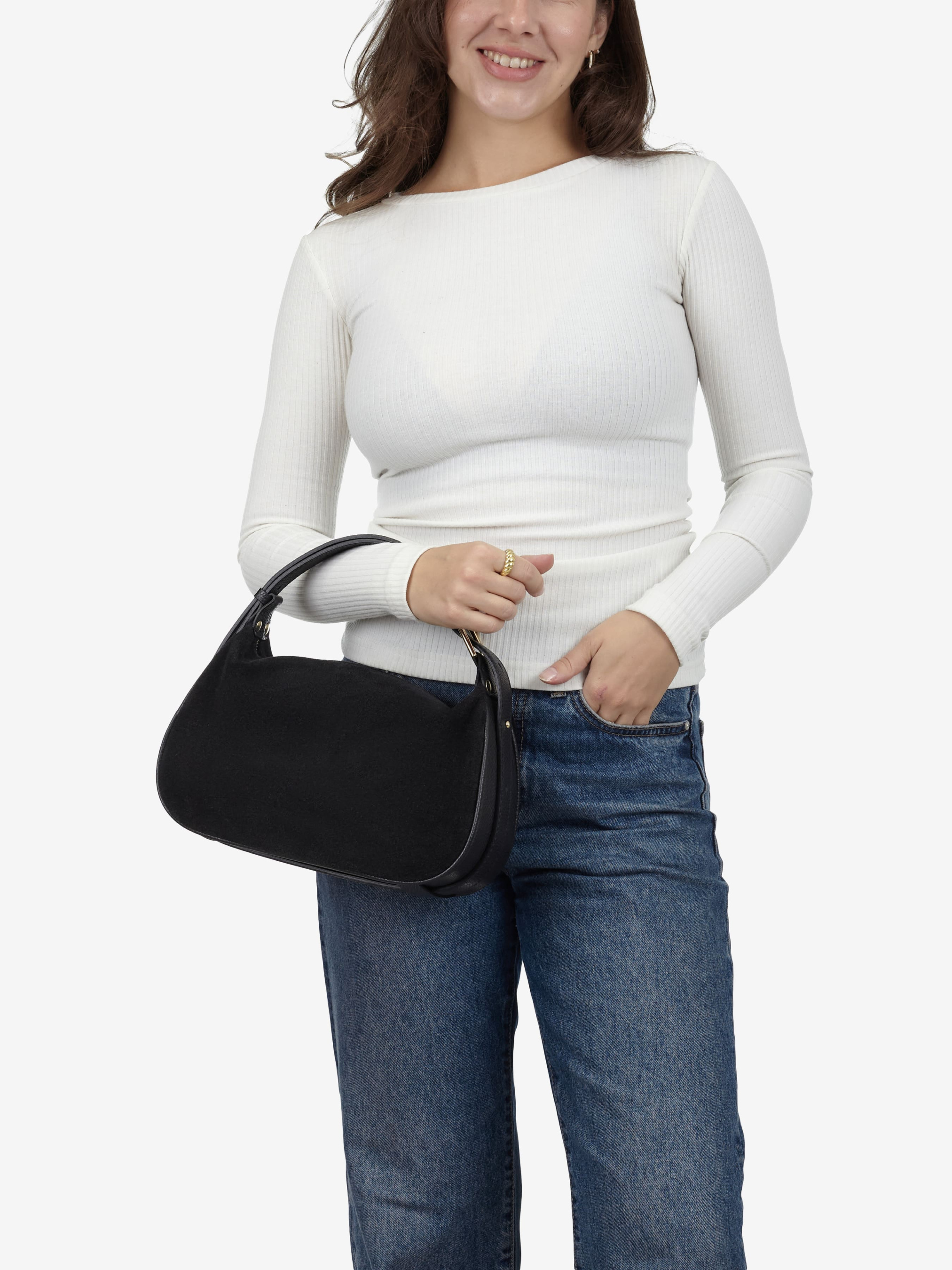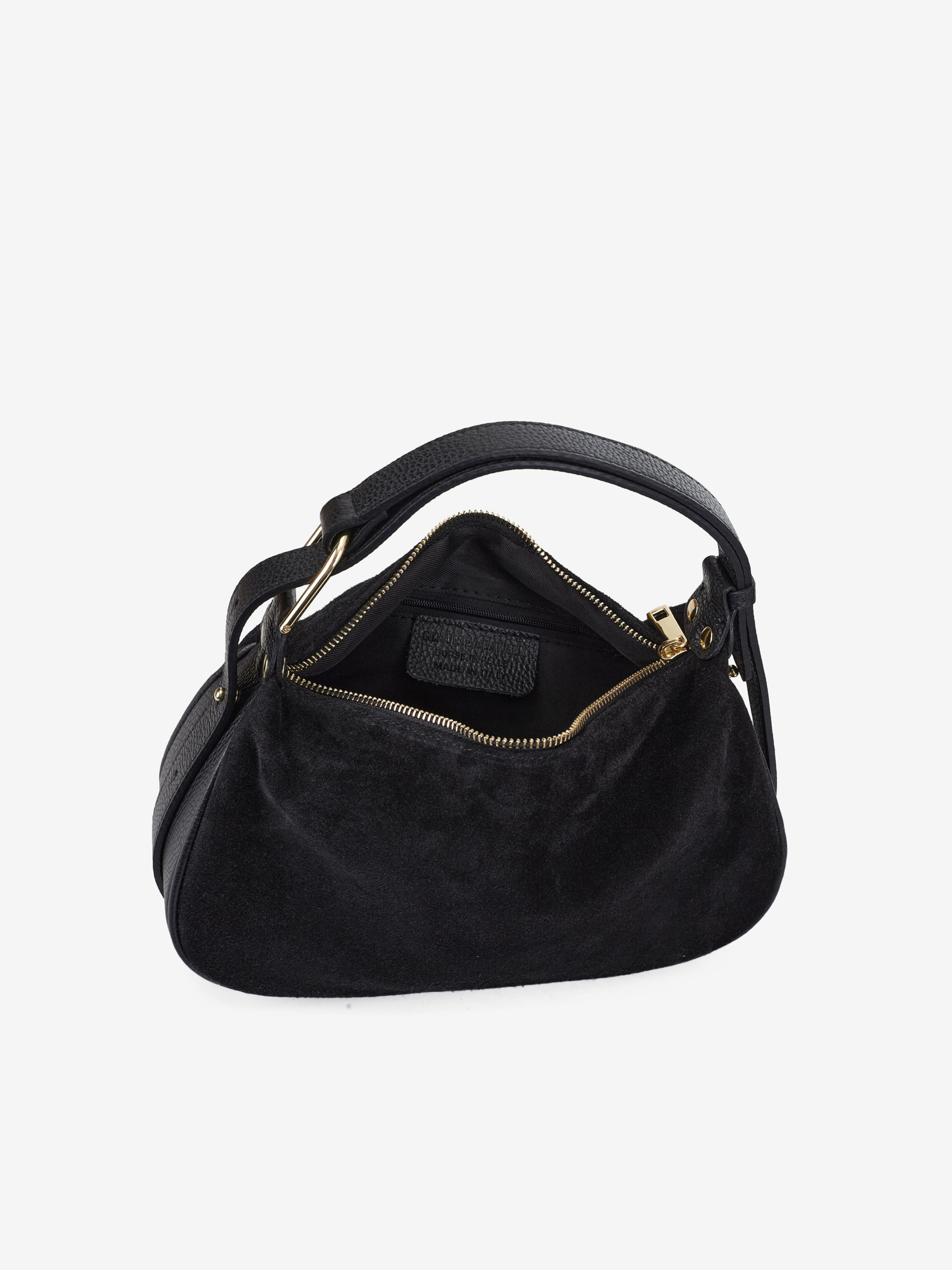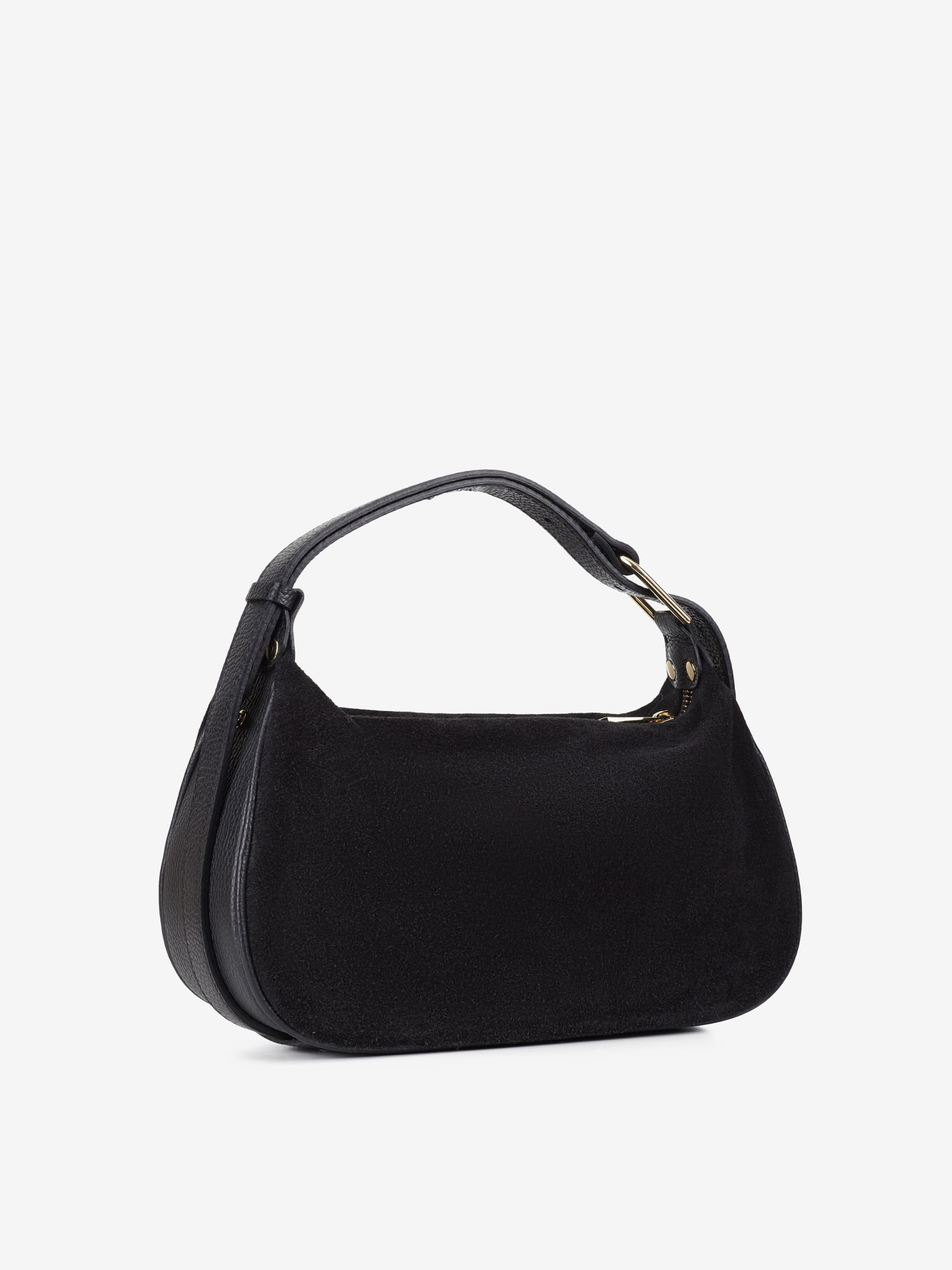 Деталі: Матеріал: 100% натуральна замша та шкіра флотар Фурнітура золотистого кольору Розміри (Ш x В x Г) – 30 x 15 x 10 см Усередині 1 відділення та кишенька на блискавці Підкладка: бавовна Застібка: блискавка Висота ручки 12 см Ремінець шкіряний, незнімний, регулюється, максимальна довжина 120 см