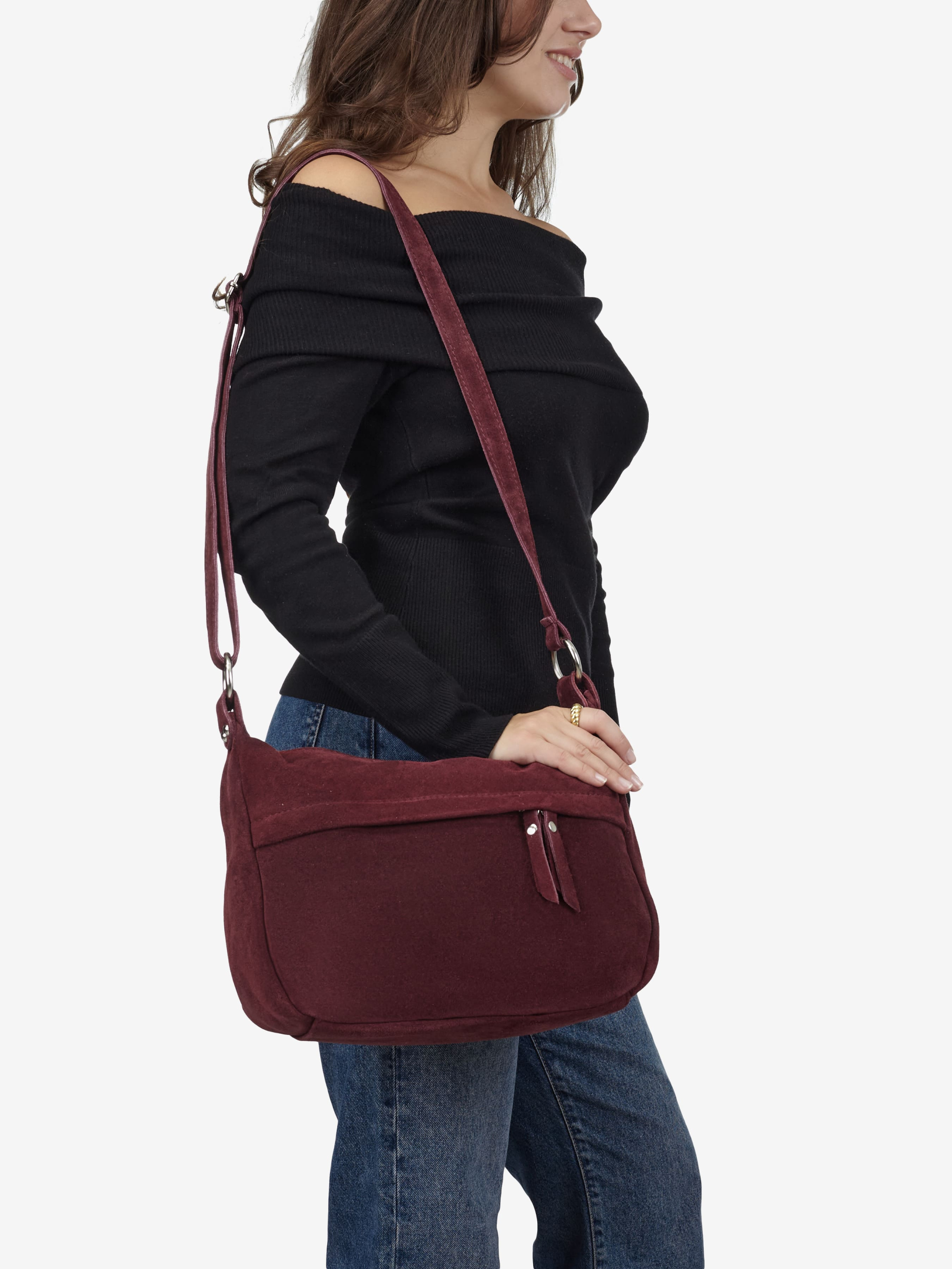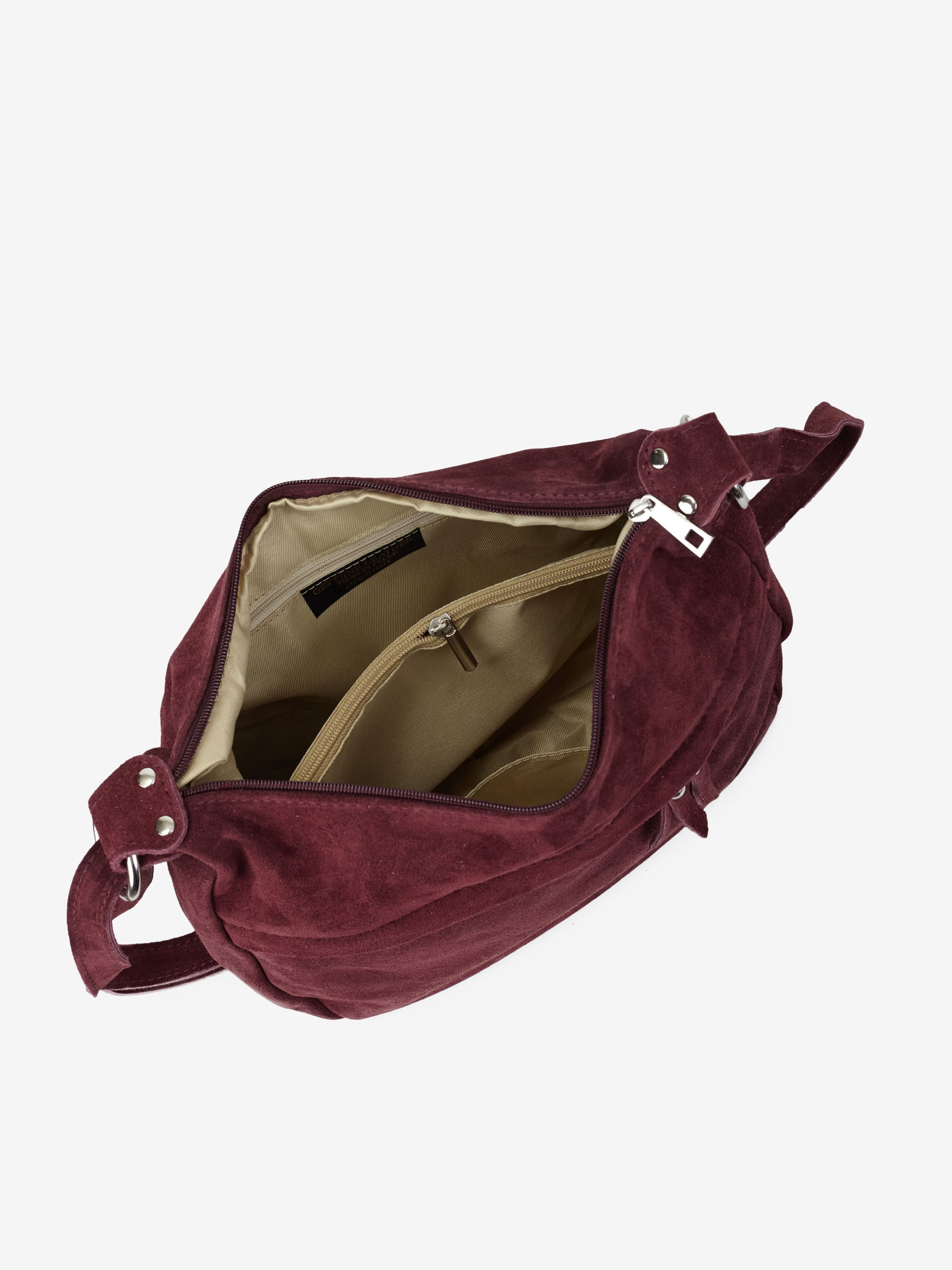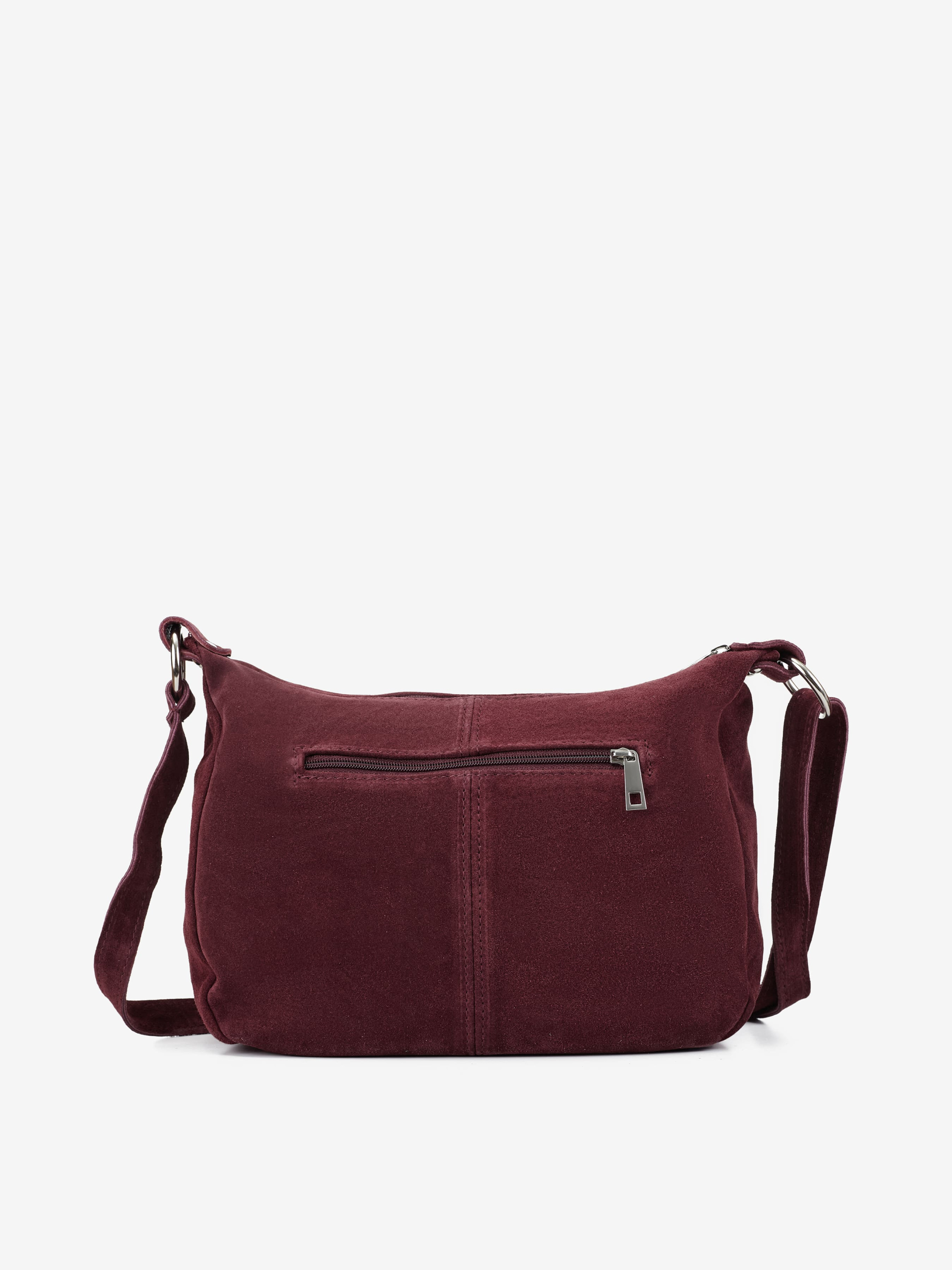 Деталі: Матеріал: 100% натуральна замша Фурнітура сріблястого кольору Розміри (Ш x В x Г) – 30 x 22 x 10 см Усередині 1 відділення та 2 кишеньки, одна з них на блискавці Спереду кишенька на блискавці Позаду кишенька на блискавці Підкладка: бавовна Застібка: блискавка Ремінець замшевий, незнімний, регулюється, максимальна довжина 135 см