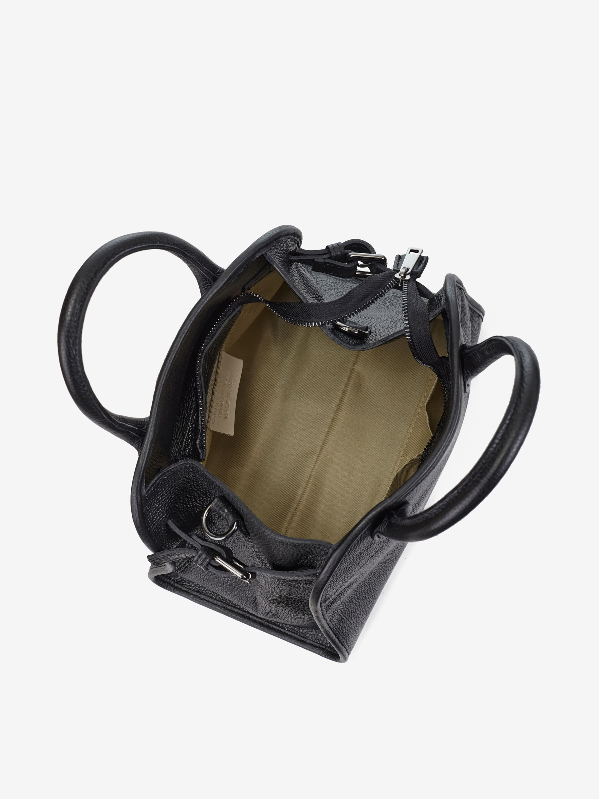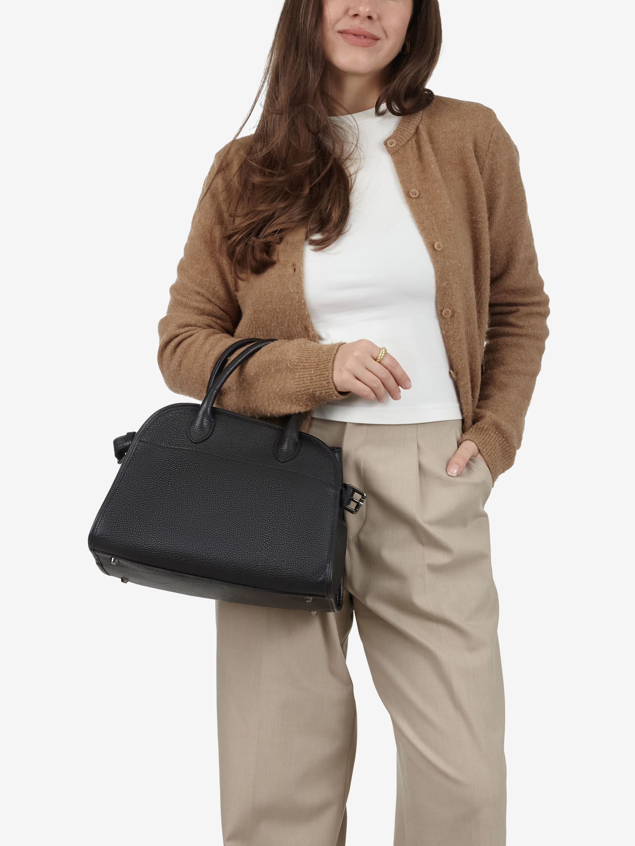 Деталі: Матеріал: 100% натуральна шкіра флотар Фурнітура золотистого кольору Розміри (Ш x В x Г) – 28 x 23 x 13 см Усередині 1 відділення та 3 кишеньки, одна з них на блискавці Підкладка: бавовна Застібка: блискавка Висота ручок 11 см Ремінець шкіряний, знімний, регулюється, максимальна довжина 120 см