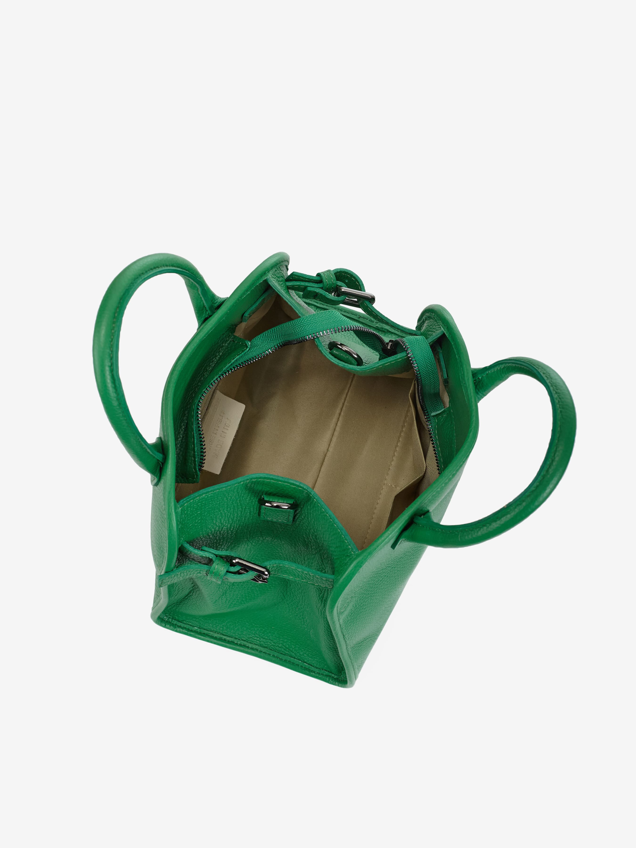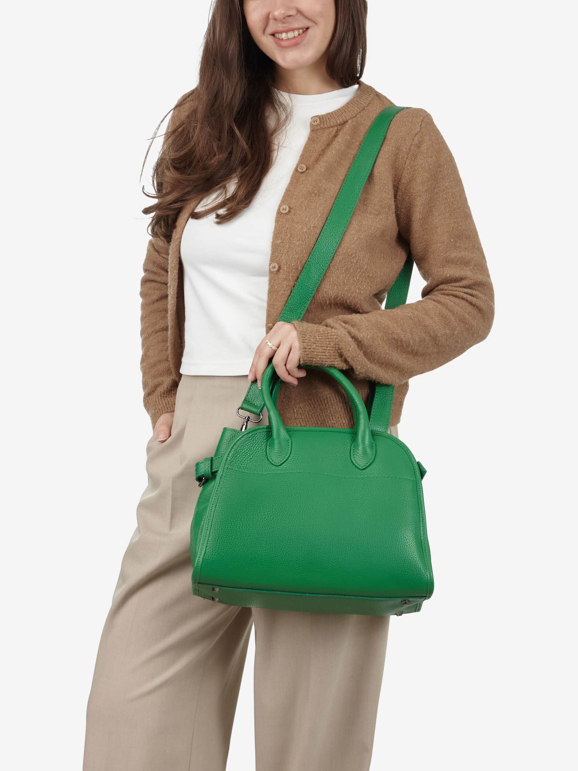 Деталі: Матеріал: 100% натуральна шкіра флотар Фурнітура золотистого кольору Розміри (Ш x В x Г) – 28 x 23 x 13 см Усередині 1 відділення та 3 кишеньки, одна з них на блискавці Підкладка: бавовна Застібка: блискавка Висота ручок 11 см Ремінець шкіряний, знімний, регулюється, максимальна довжина 120 см