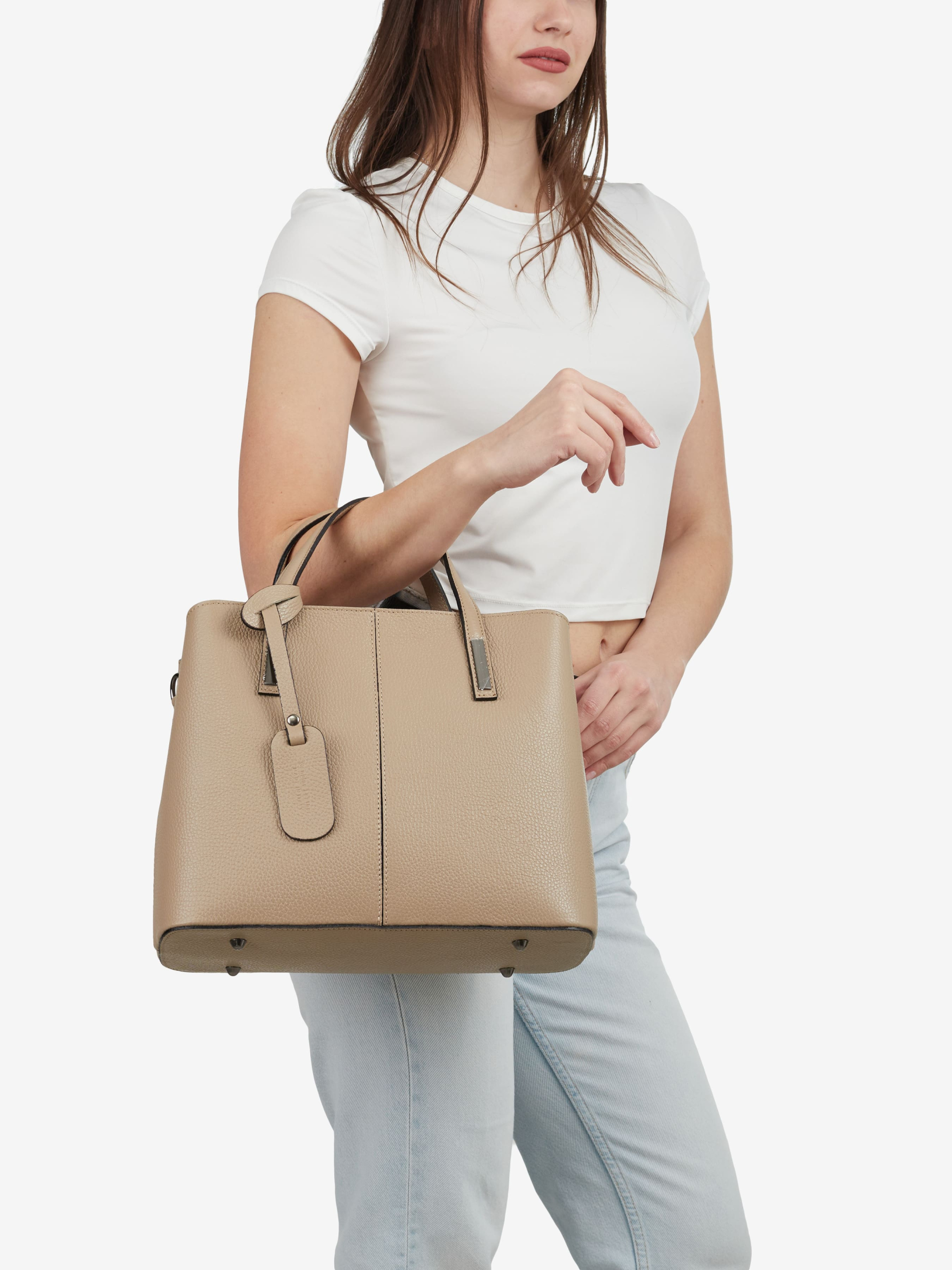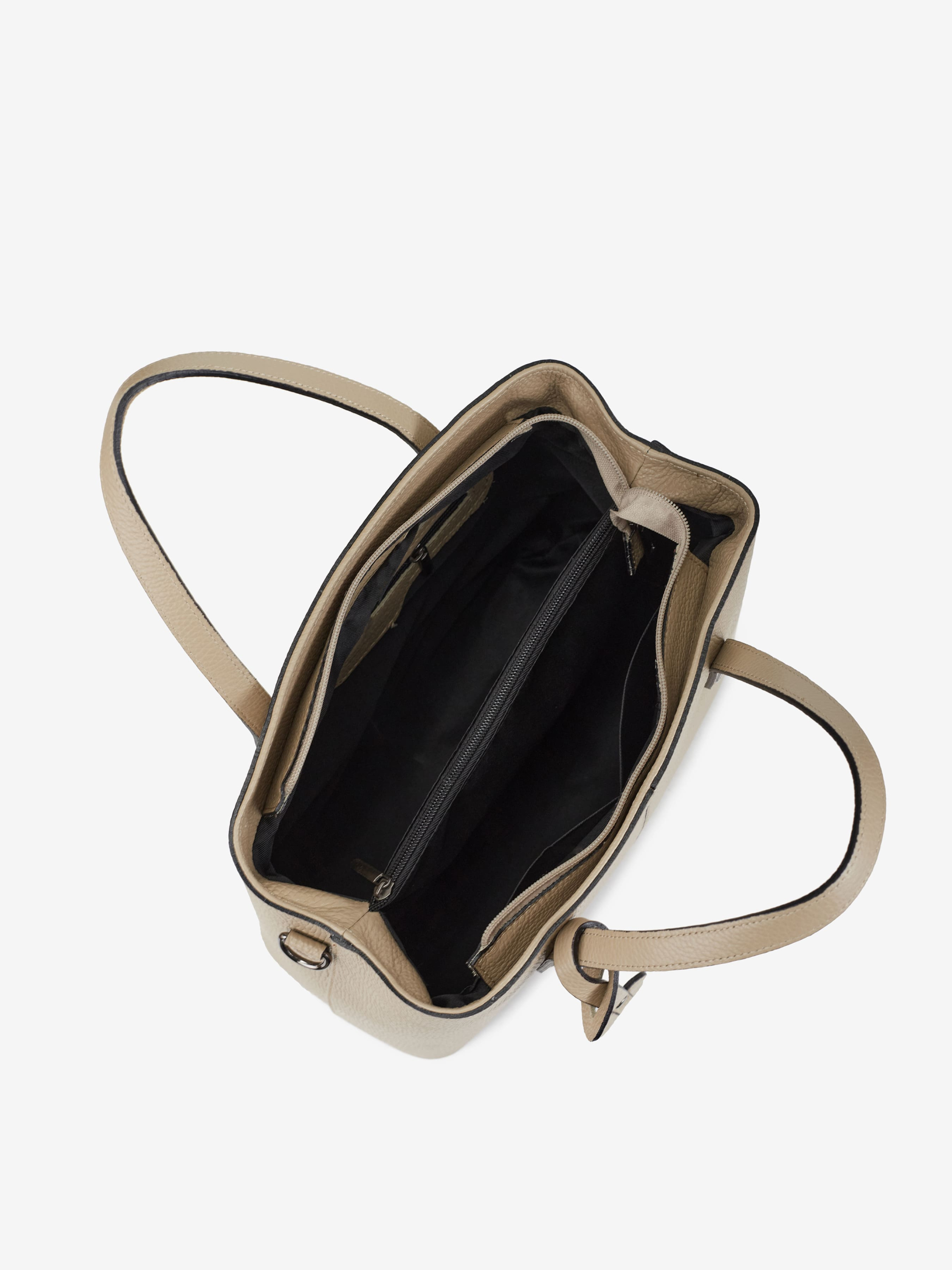 Деталі: Матеріал: 100% натуральна шкіра флотар Фурнітура чорного кольору Розміри (Ш x В x Г) - 30 х 26 х 14 см Усередині 2 відділення, розділені кишенею на блискавці та 3 кишеньки для дрібниць, одна з них на блискавці Підкладка: бавовна Застібка: блискавка Ремінець шкіряний, регулюється, знімний, максимальна довжина 100 см Висота ручок 12 см