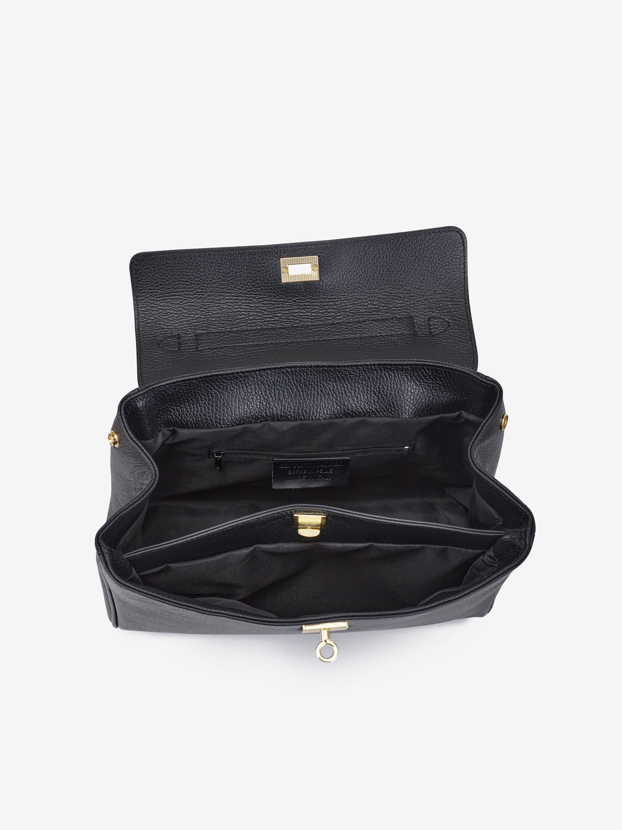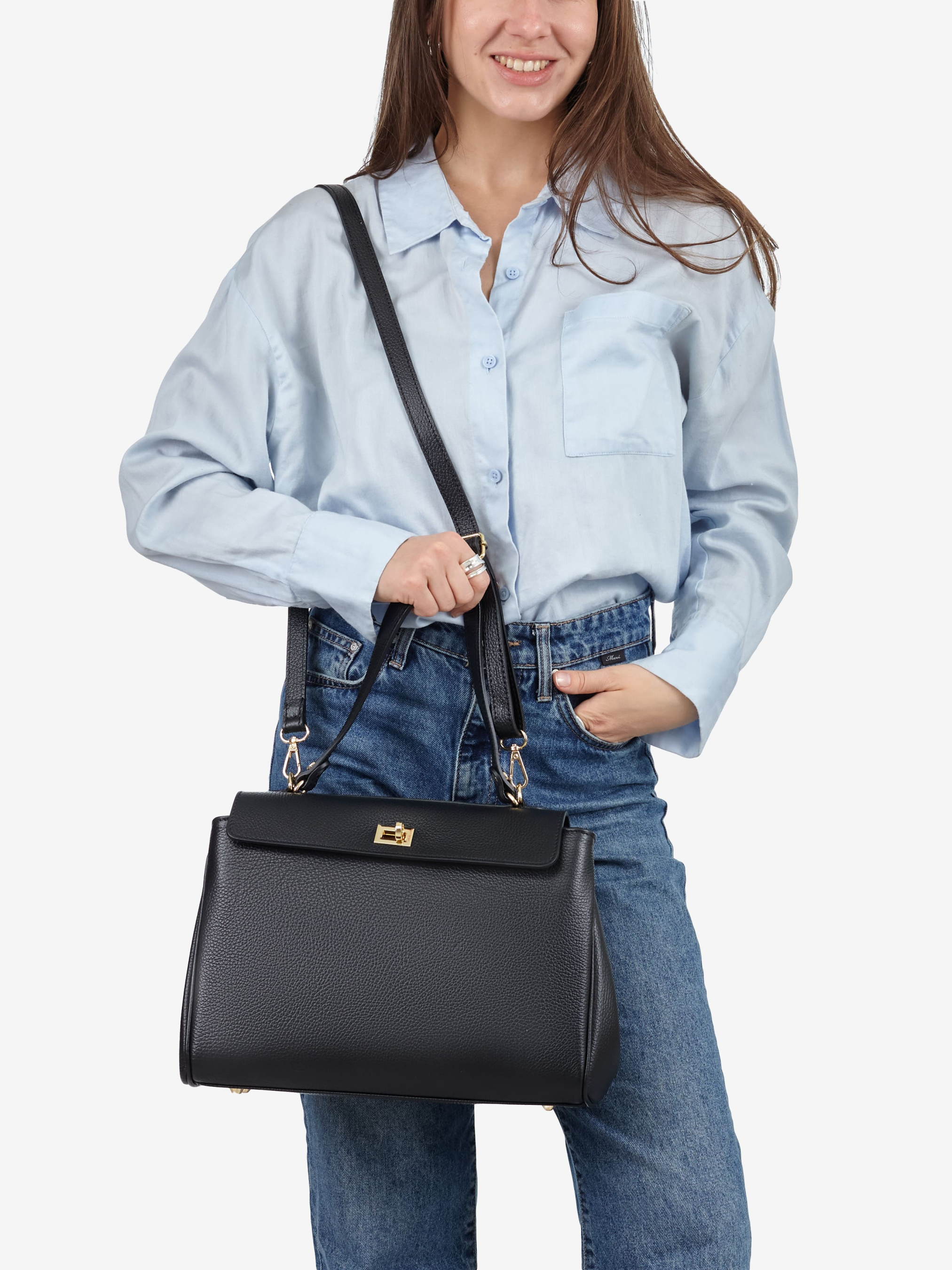 Деталі: Матеріал: 100% натуральна шкіра флотар Фурнітура золотистого кольору Розміри (Ш x В x Г) - 33 х 26 х 9 см Усередині 2 відділення та кишенька для дрібниць на блискавці Позаду кишенька на блискавці Підкладка: бавовна Застібка: клапан на поворотному замку Ремінець шкіряний, знімний, регулюється, максимальна довжина 125 см Висота ручки 19 см