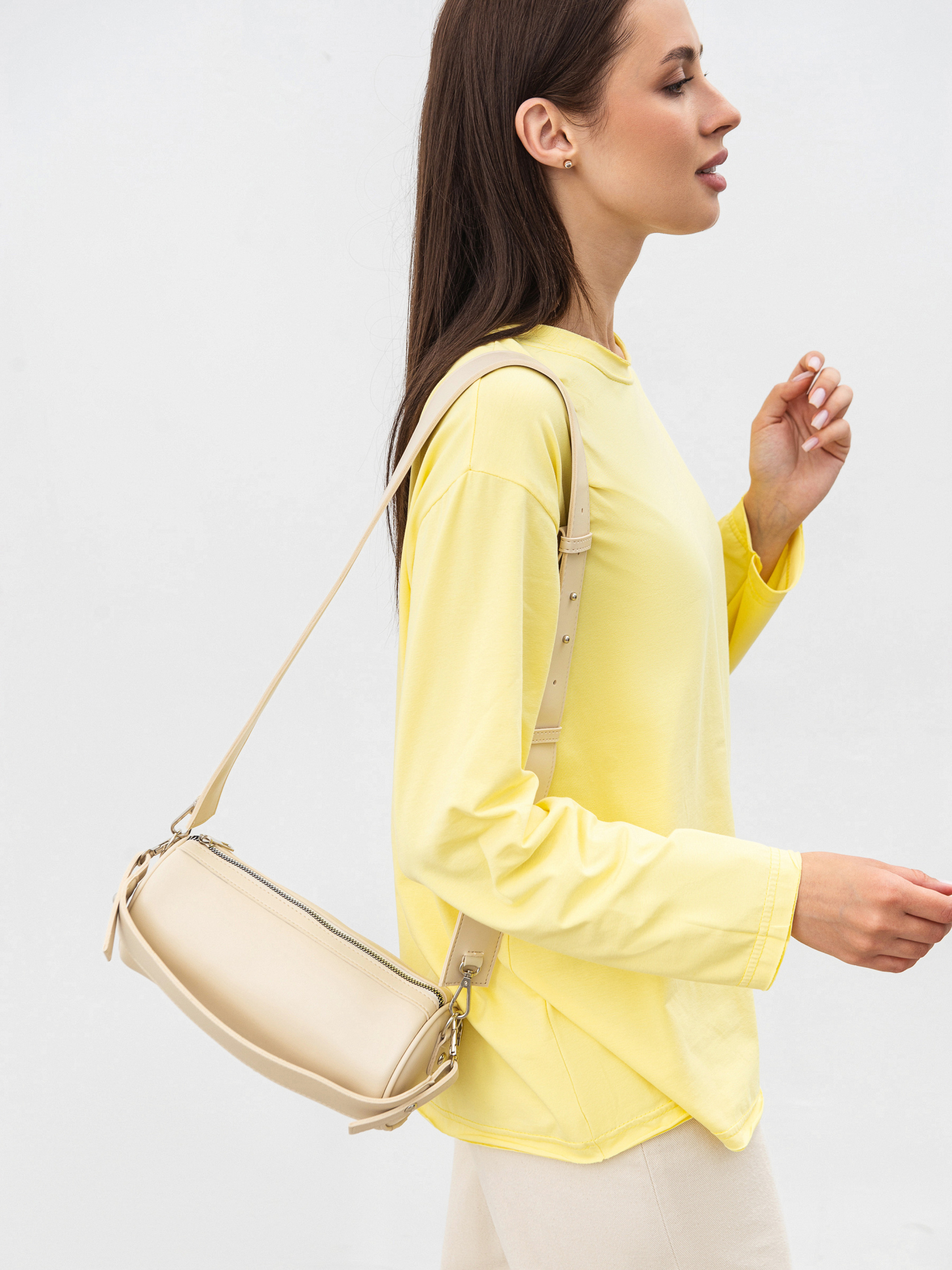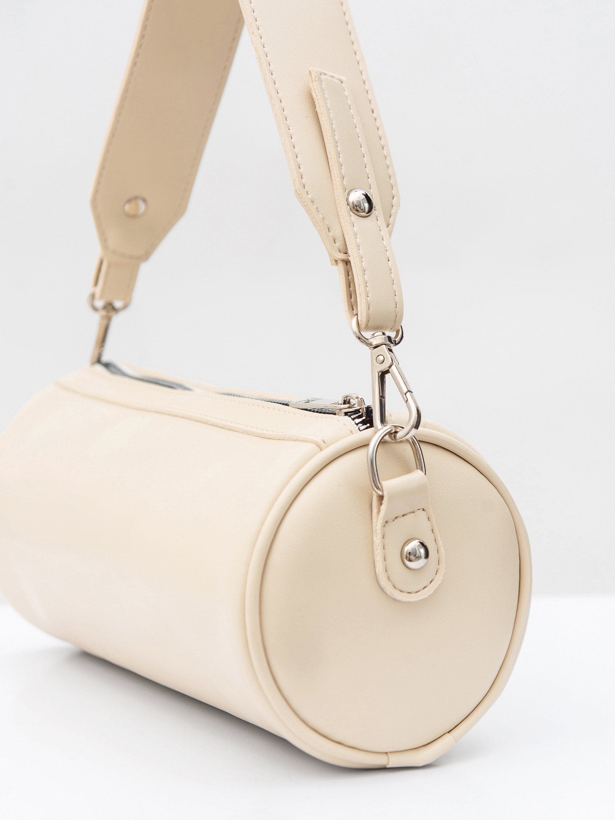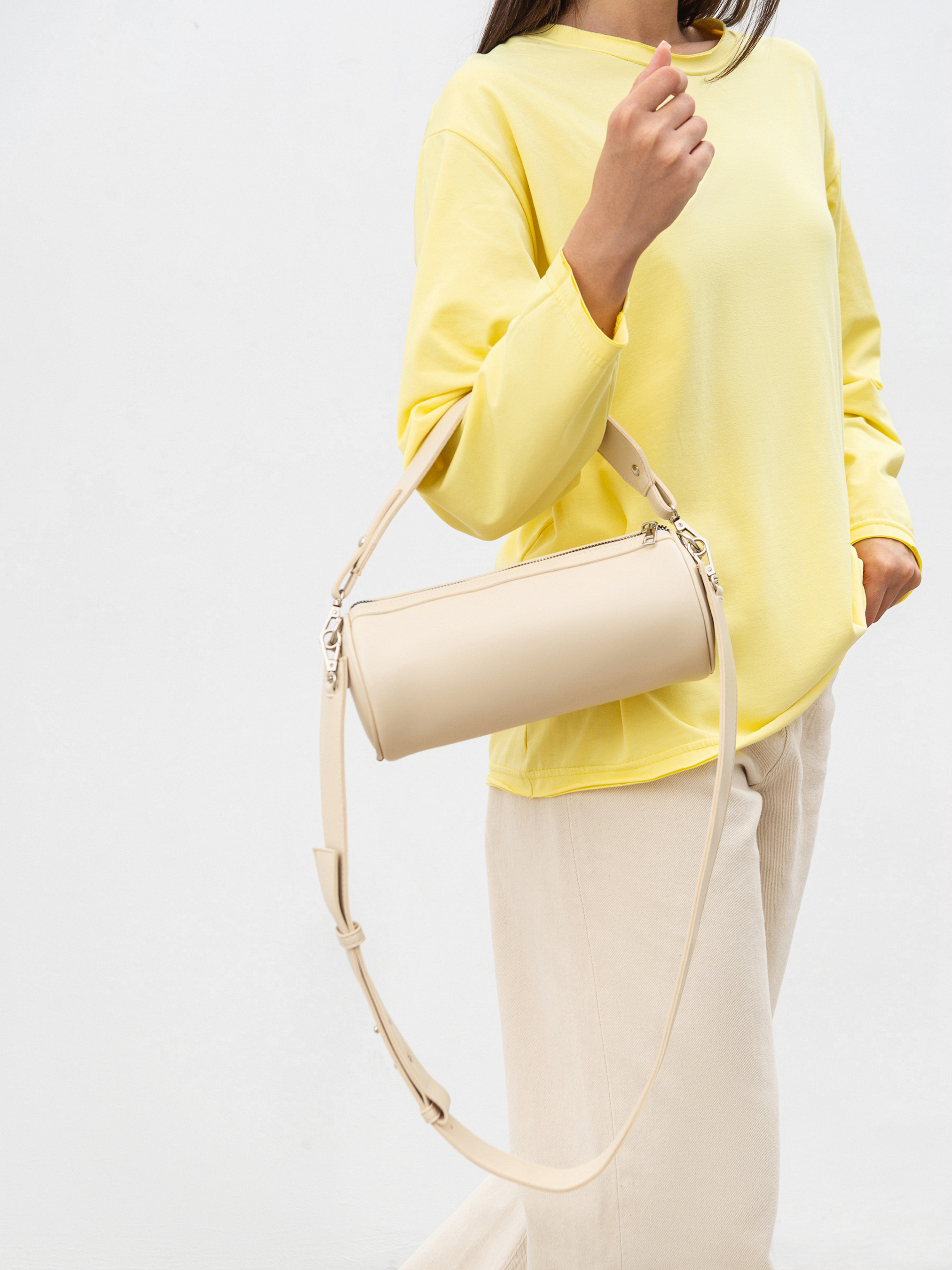 Сумка Луна функціональна та стильна модель циліндричної форми, яка вдало поєднує лаконічність дизайну й продуману зручність. Вона виготовлена з екошкіри, що тримає форму, має приємну текстуру та підходить для щоденного використання в будь-яку пору року. В комплекті два типи ремінців: короткий для носіння в руках і довший регульований, який зручно носити через плече. Фурнітура в кольорі світлого нікелю додає виробу охайного, мінімалістичного вигляду. Усередині кишенька для дрібниць, що дозволяє зручно організувати простір. Луна стане практичним доповненням міського образу: компактна зовні, але вмістка всередині. Довжина 25 см, діаметр 10