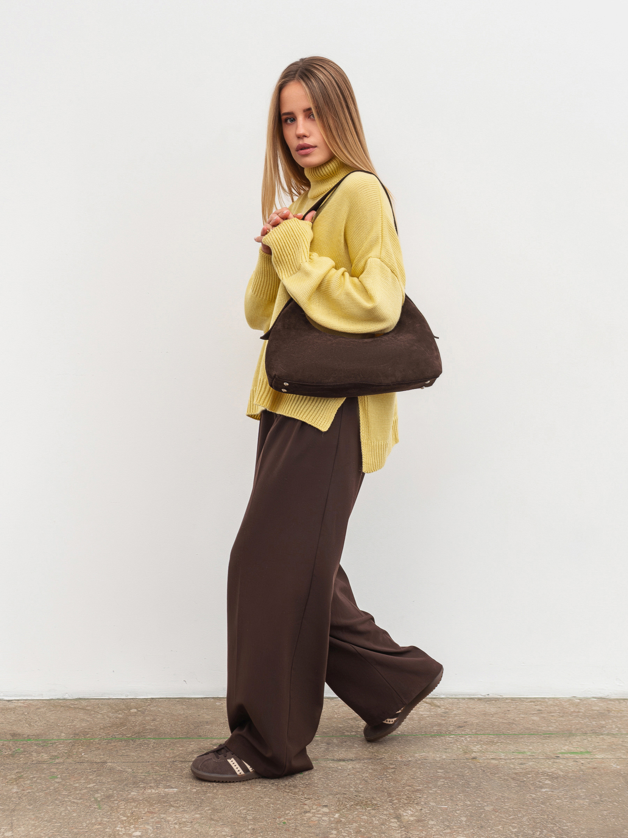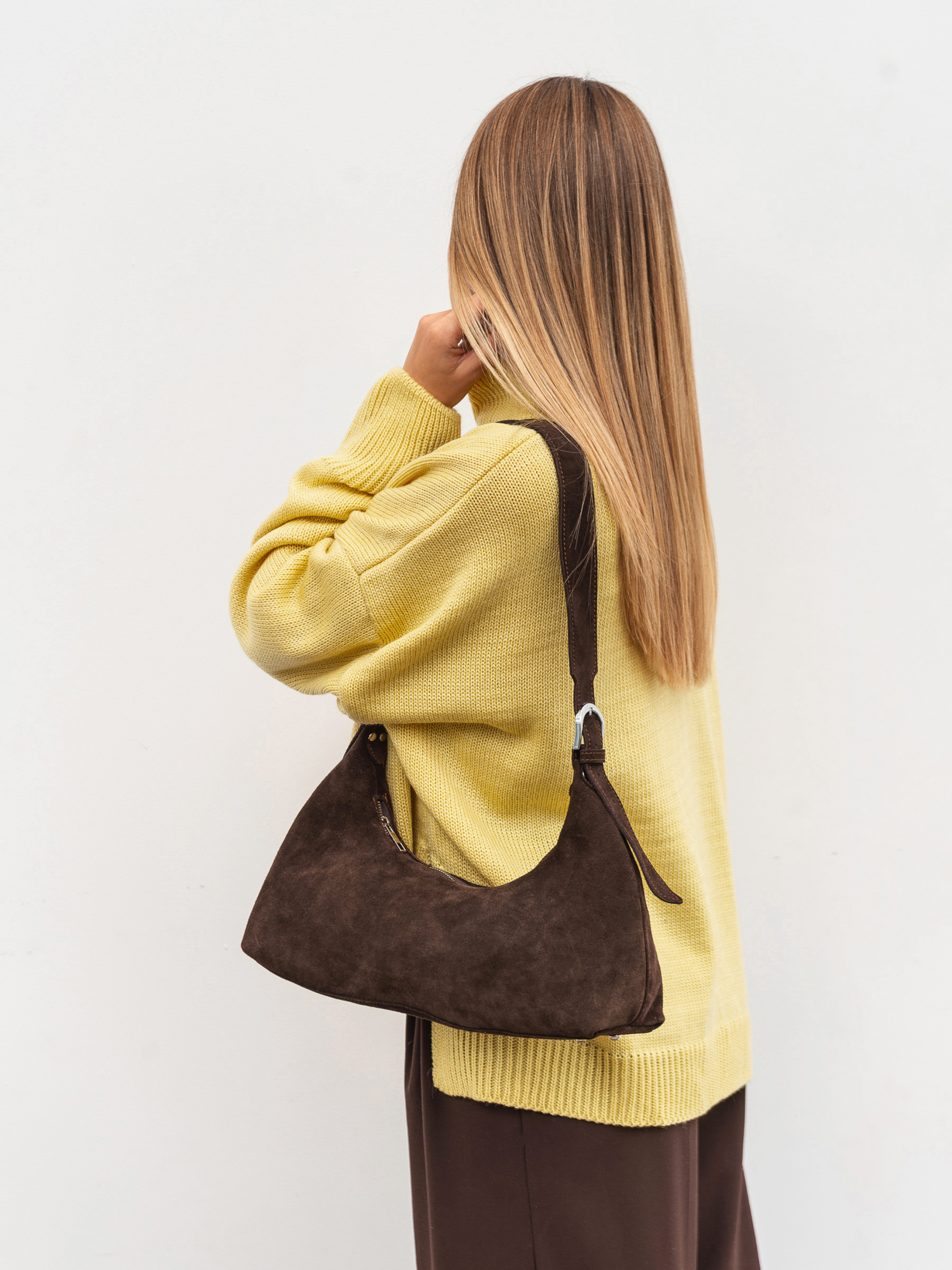 Елегантна сумка-хобо з натуральної замші вишукана деталь для повсякденних образів. Завдяки м якій фактурі замшу модель виглядає розкішно й водночас залишається практичною у використанні. Сумка має підкладку та внутрішні кишеньки по стінках для зручної організації речей. Застібається зверху на блискавку, що забезпечує надійність. Фурнітура в срібному відтінку додає стильного акценту. Доступний колір: коричневий. Висота аксесуару: 12 см Довжина аксесуару: 20 см Ширина аксесуару: 5 см Довжина ремінця: 49 см