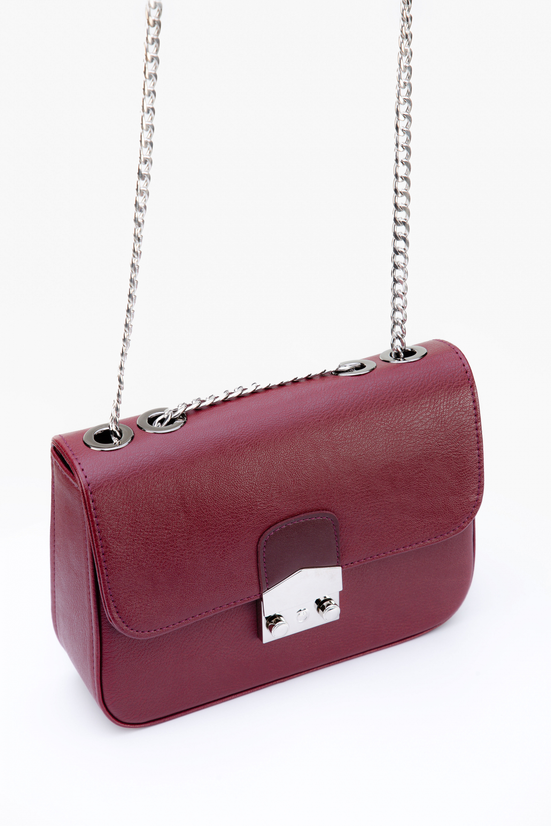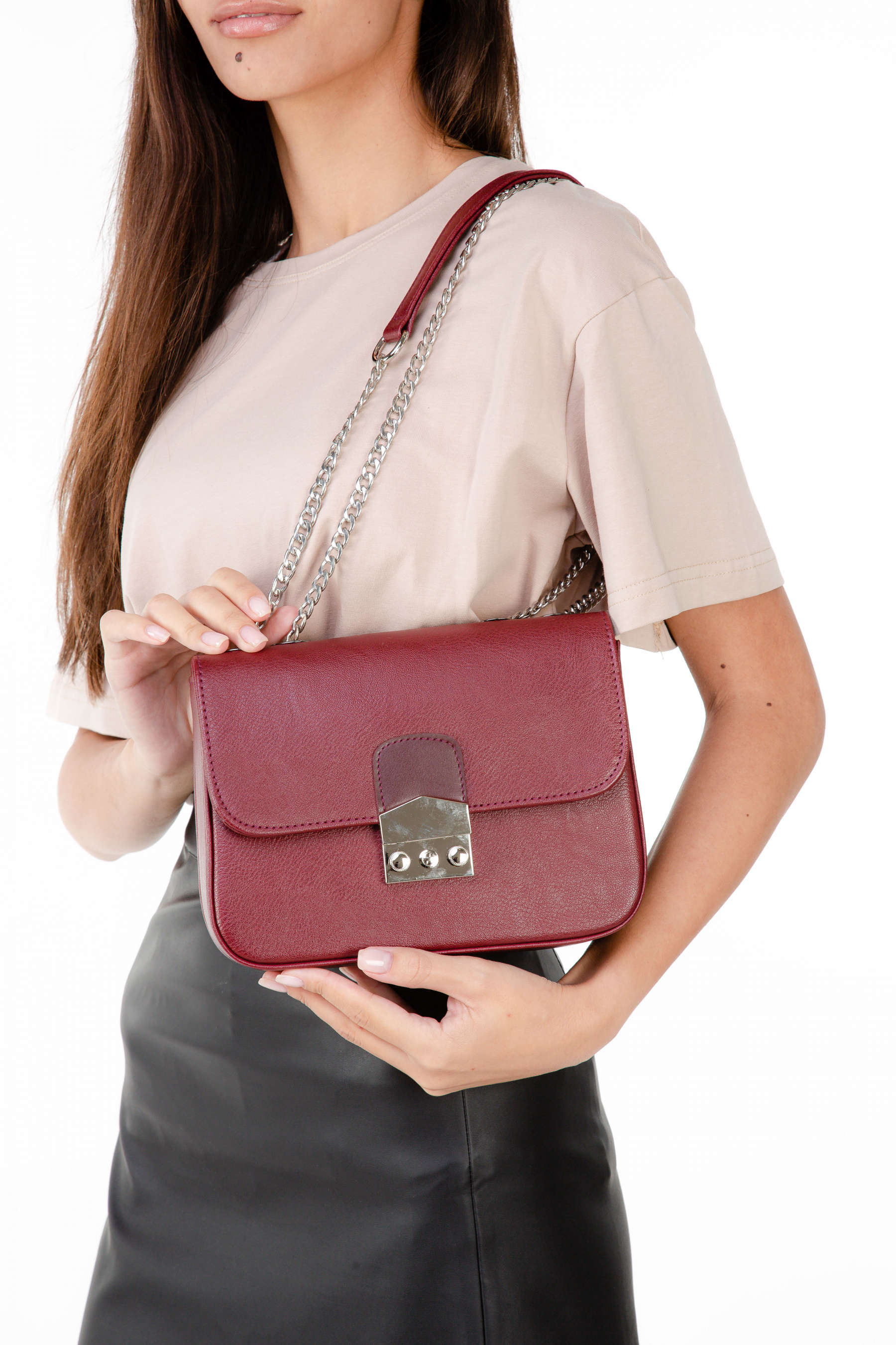 Клатч на ланцюжку. Розмір 22 х 17 см. Ширина 6,5 см. Дуже зручна, компактна сумочка. Закривається нахлестом на замочок, який став особливістю сумки, і на блискавку. Всередині є підкладка і три маленьких кишені, один з яких на блискавці. Довгий ремінець на ланцюжку в комплекті.