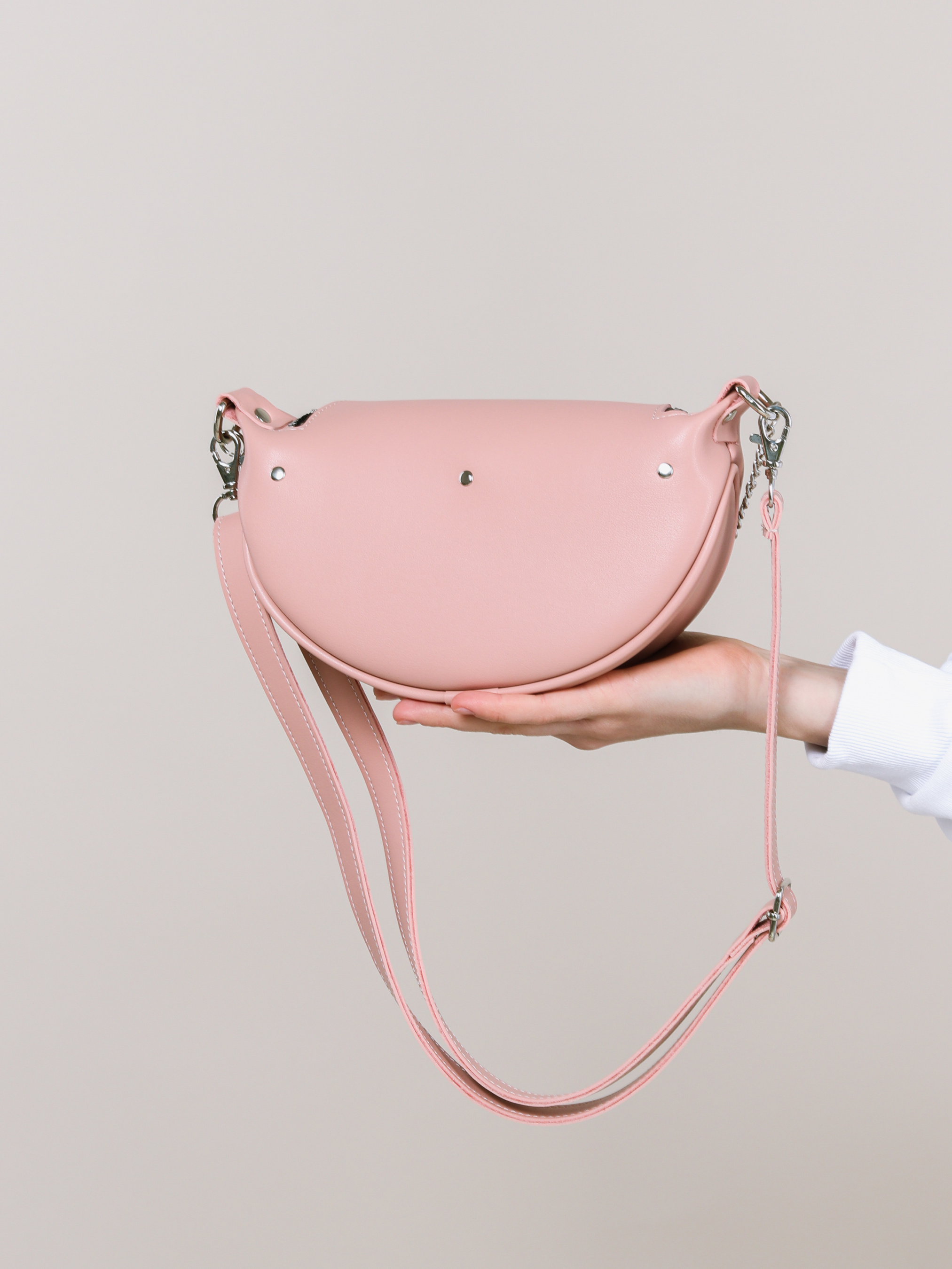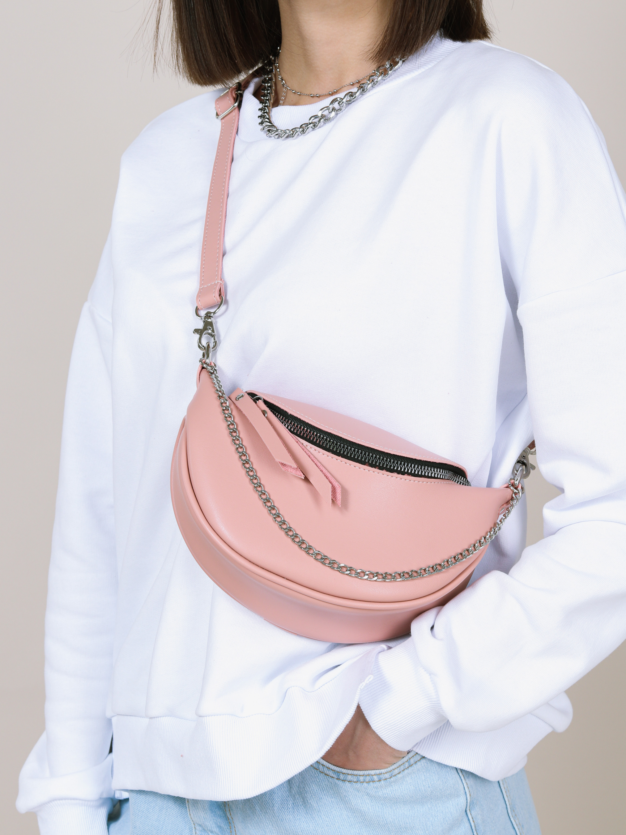 Бананка "Саманта" напівкруглої форми ROMASHKA Відмінний варіант для повсякденного носіння, щоб взяти все найнеобхідніше. Буде відмінним завершальним етапом образу зі спортивним костюмом або джинсами. Всередині одна кишенька. Довжина ремінця регулюється. При бажанні, його можна відстебнути. Бананка доповнена ланцюгом зовні. Одна з найбільш зручних і актуальних моделей сумки на майбутні сезони. Довжина 22-23 см, висота 14 см, ширина 7 см
