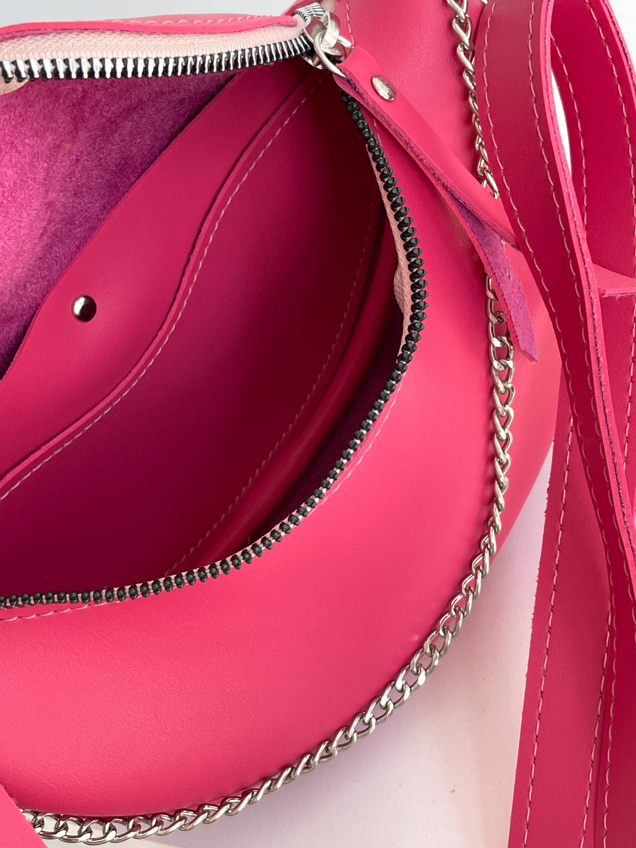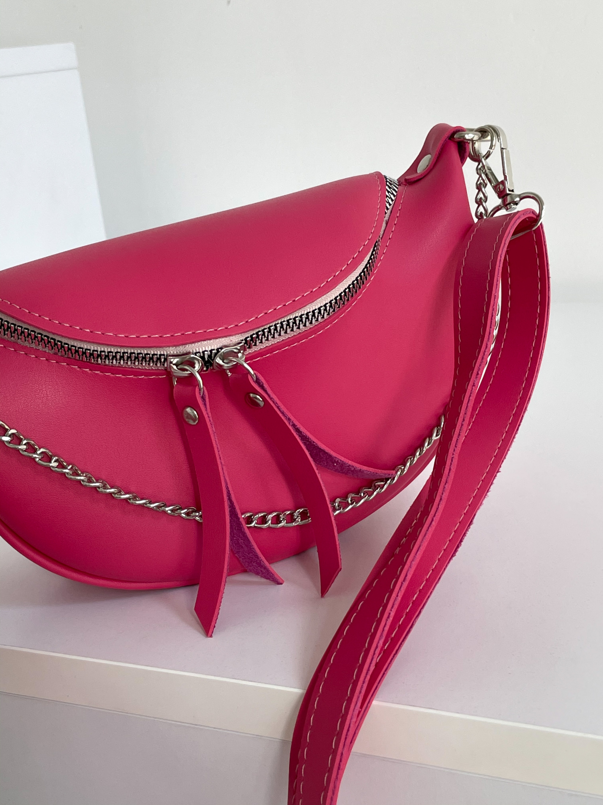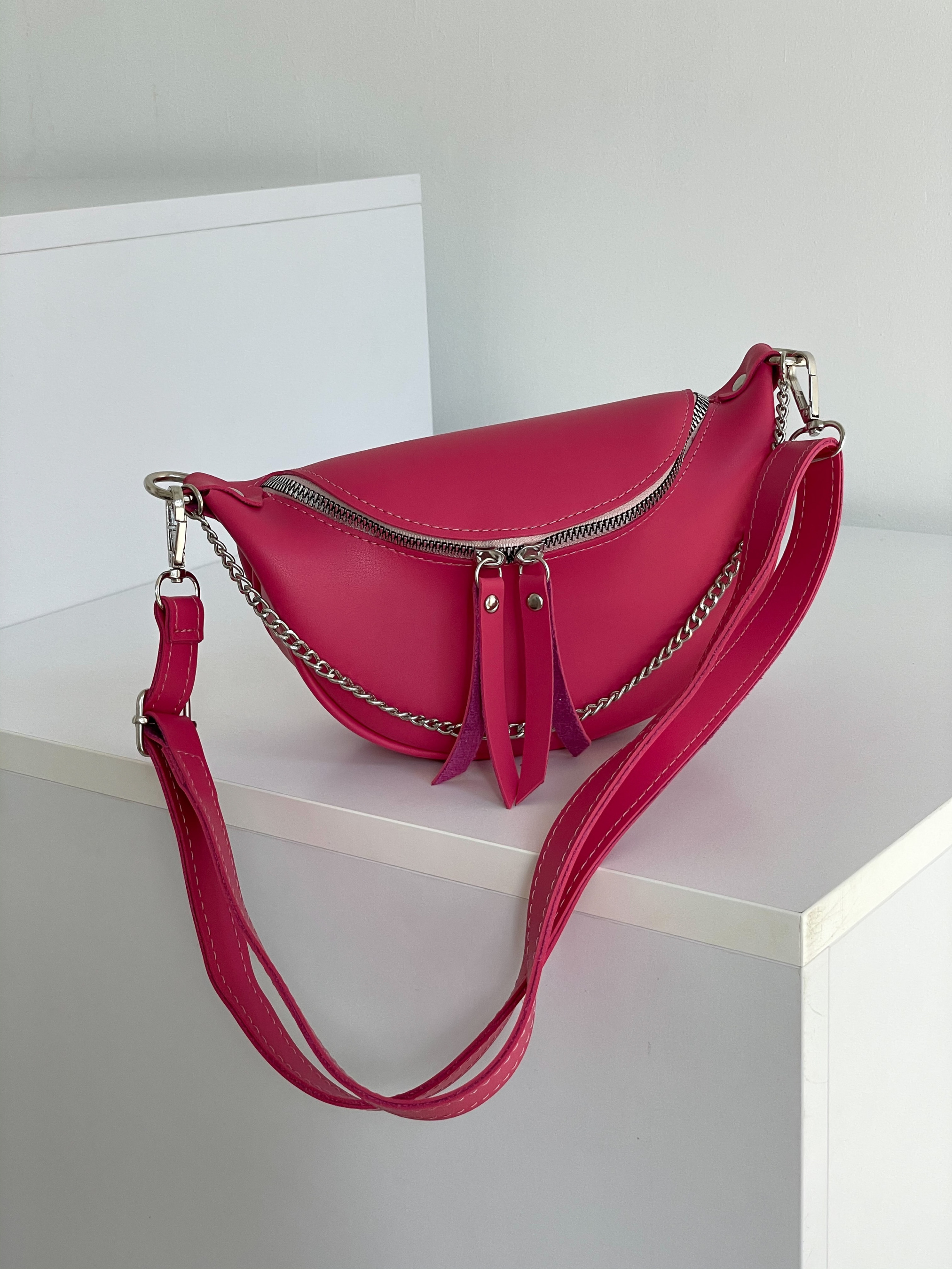 Бананка "Саманта" напівкруглої форми ROMASHKA Відмінний варіант для повсякденного носіння, щоб взяти все найнеобхідніше. Буде відмінним завершальним етапом образу зі спортивним костюмом або джинсами . Всередині одна кишенька. Довжина ремінця регулюється. При бажанні, його можна відстебнути. Бананка доповнена ланцюгом зовні. Одна з найбільш зручних і актуальних моделей сумки на майбутні сезони. Довжина 22-23 см, висота 14 см, ширина 7 см