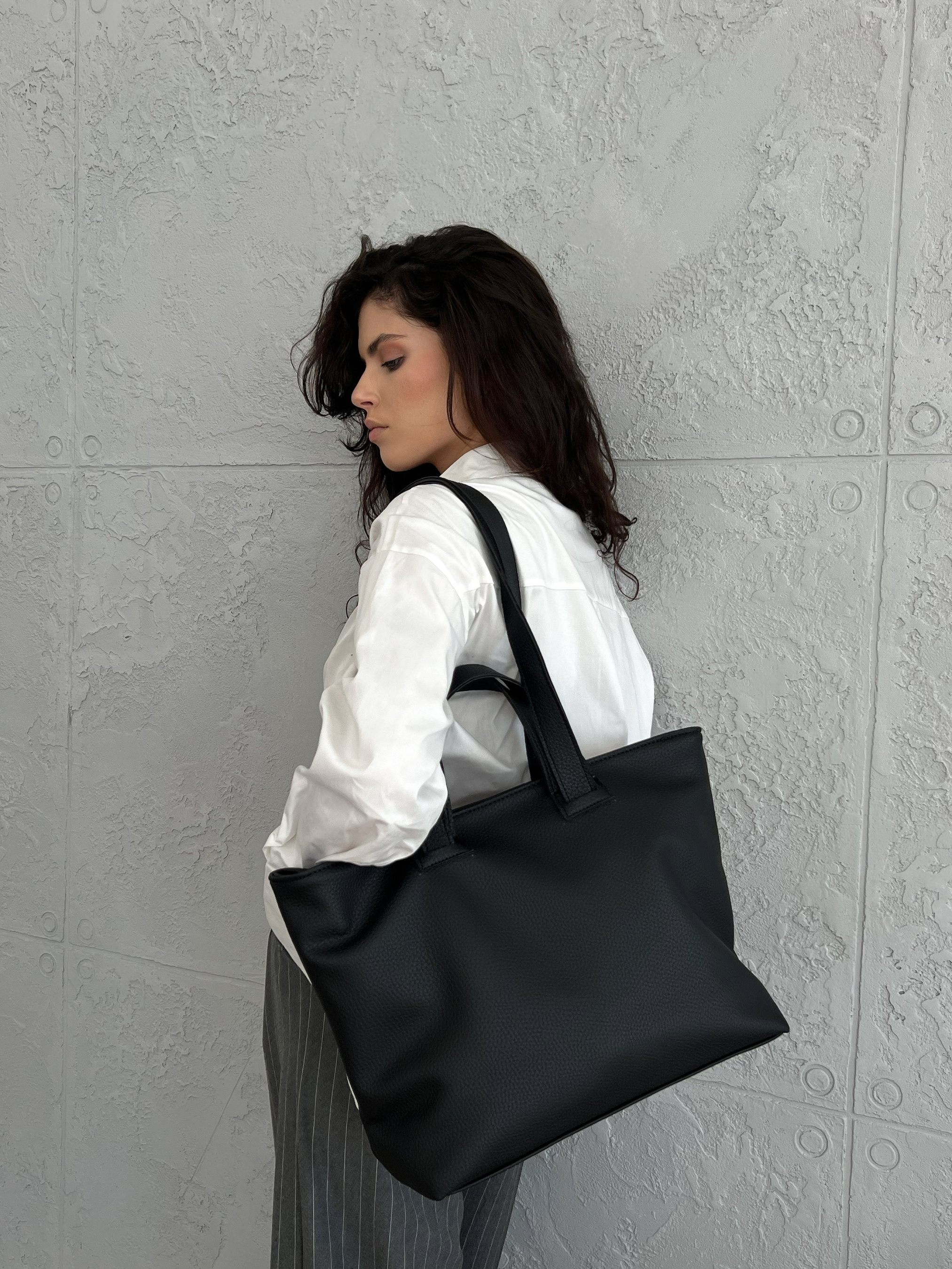 Шоппер із м'якої структурної екошкіри. Виестиельный розмір, поміститься все найнеобхідніше. У комплекті короткі ручки, для носіння в руці та довші - для носіння на плечі. Застібається на блискавку + кнопку магніт. Висота аксесуару: 30 Довжина аксесуару: 43 см Ширина аксесуару: 15 см Особливості: тканинна підкладка, два відділення і дрібні кишеньки