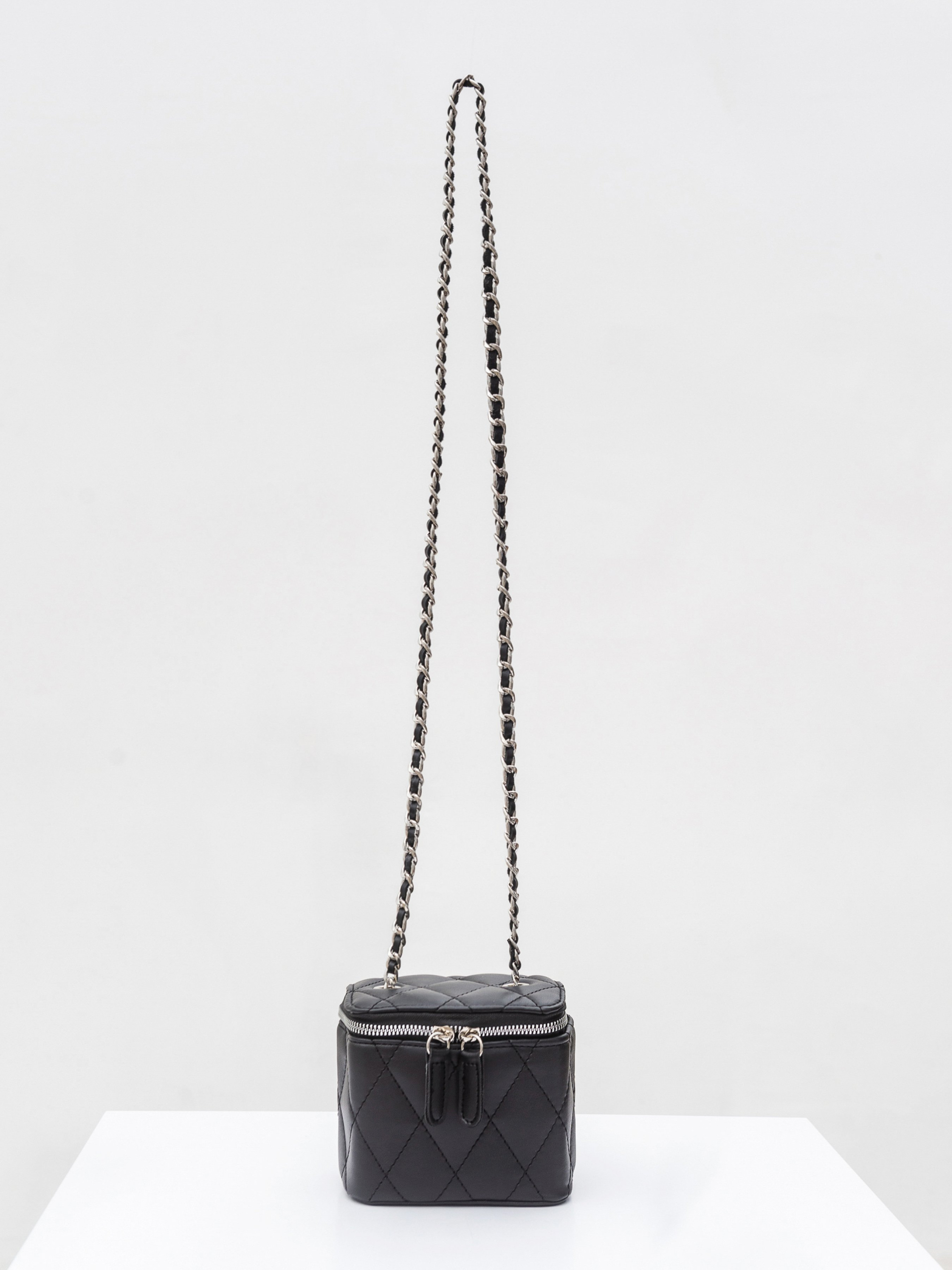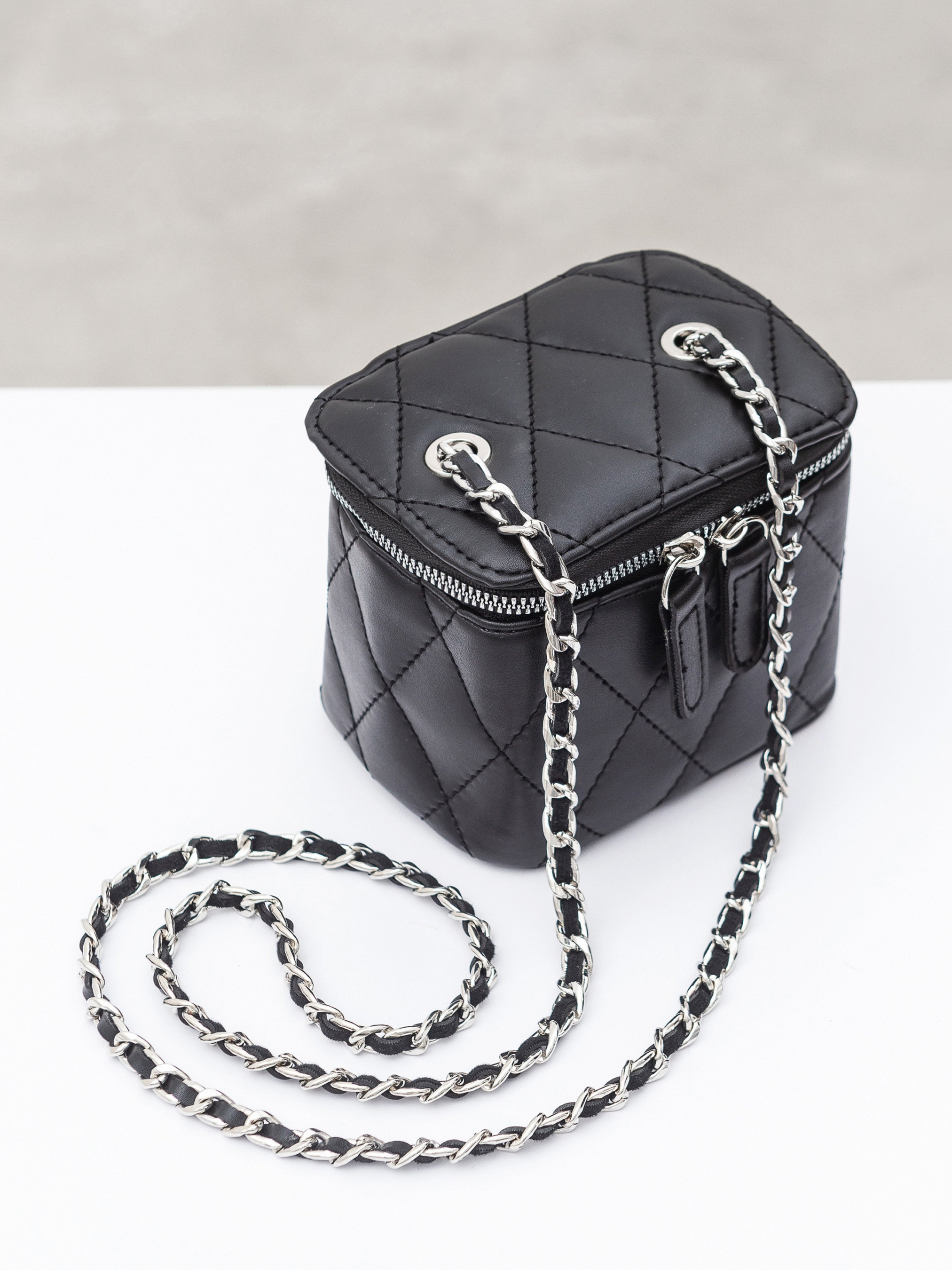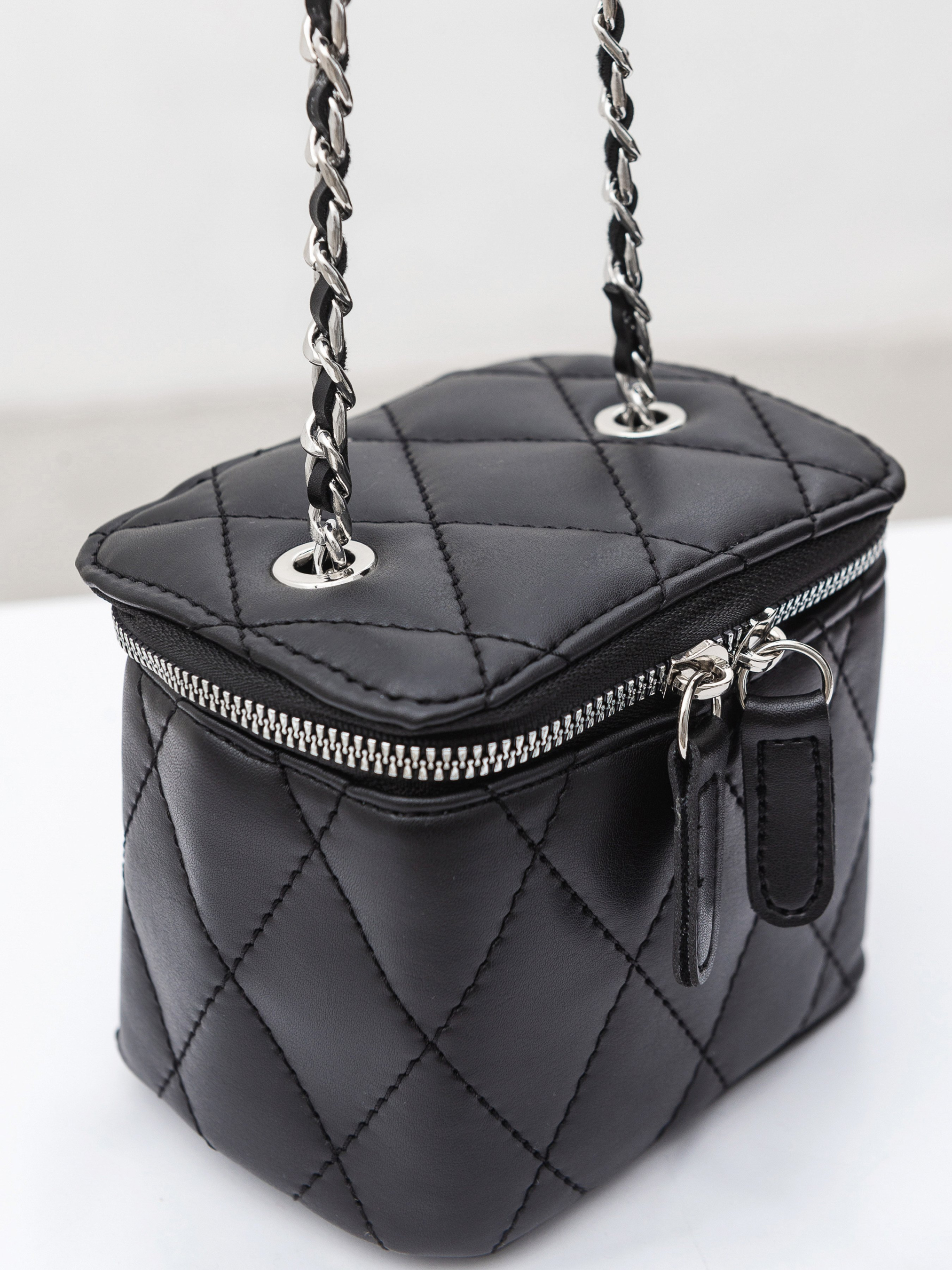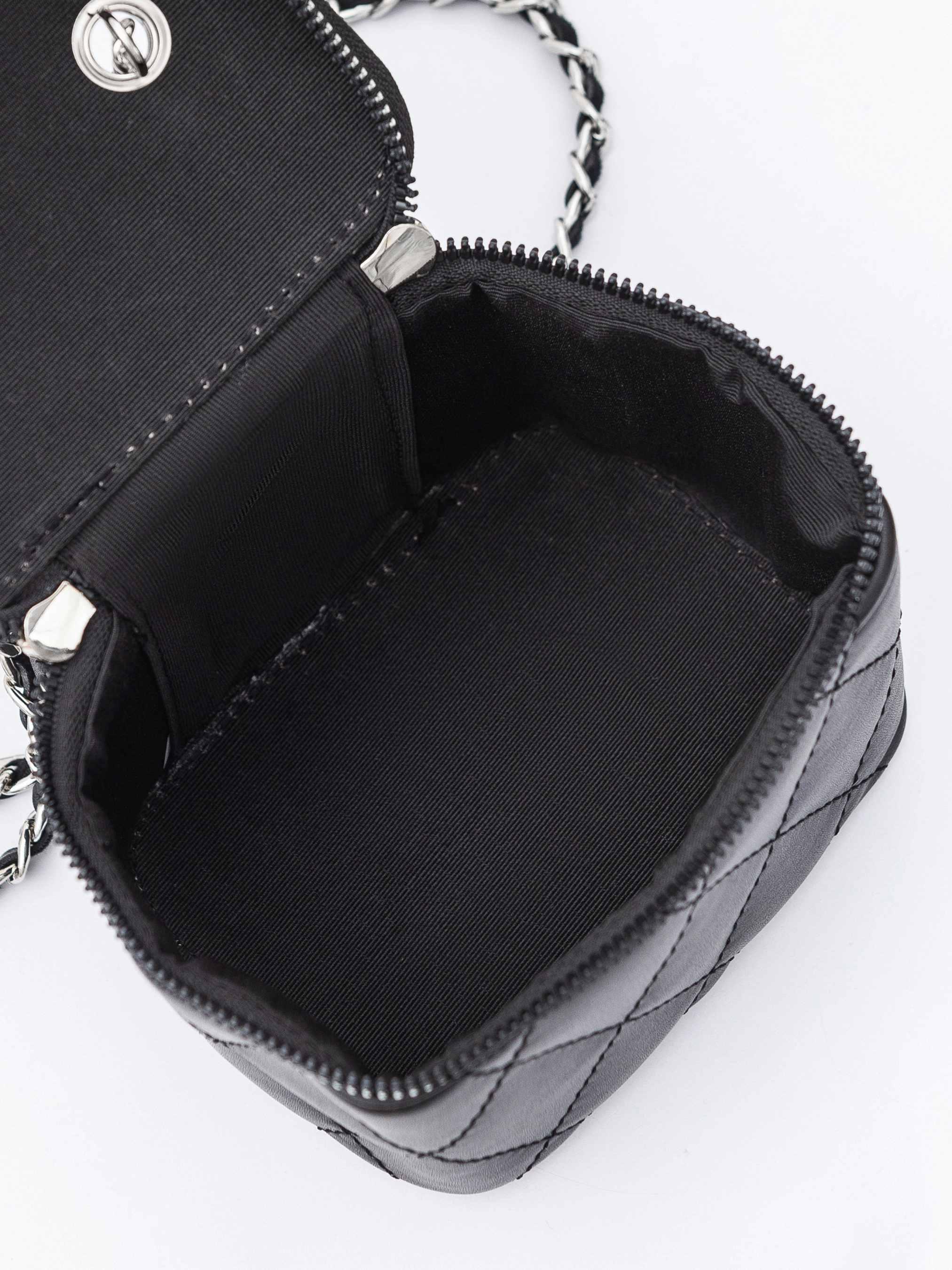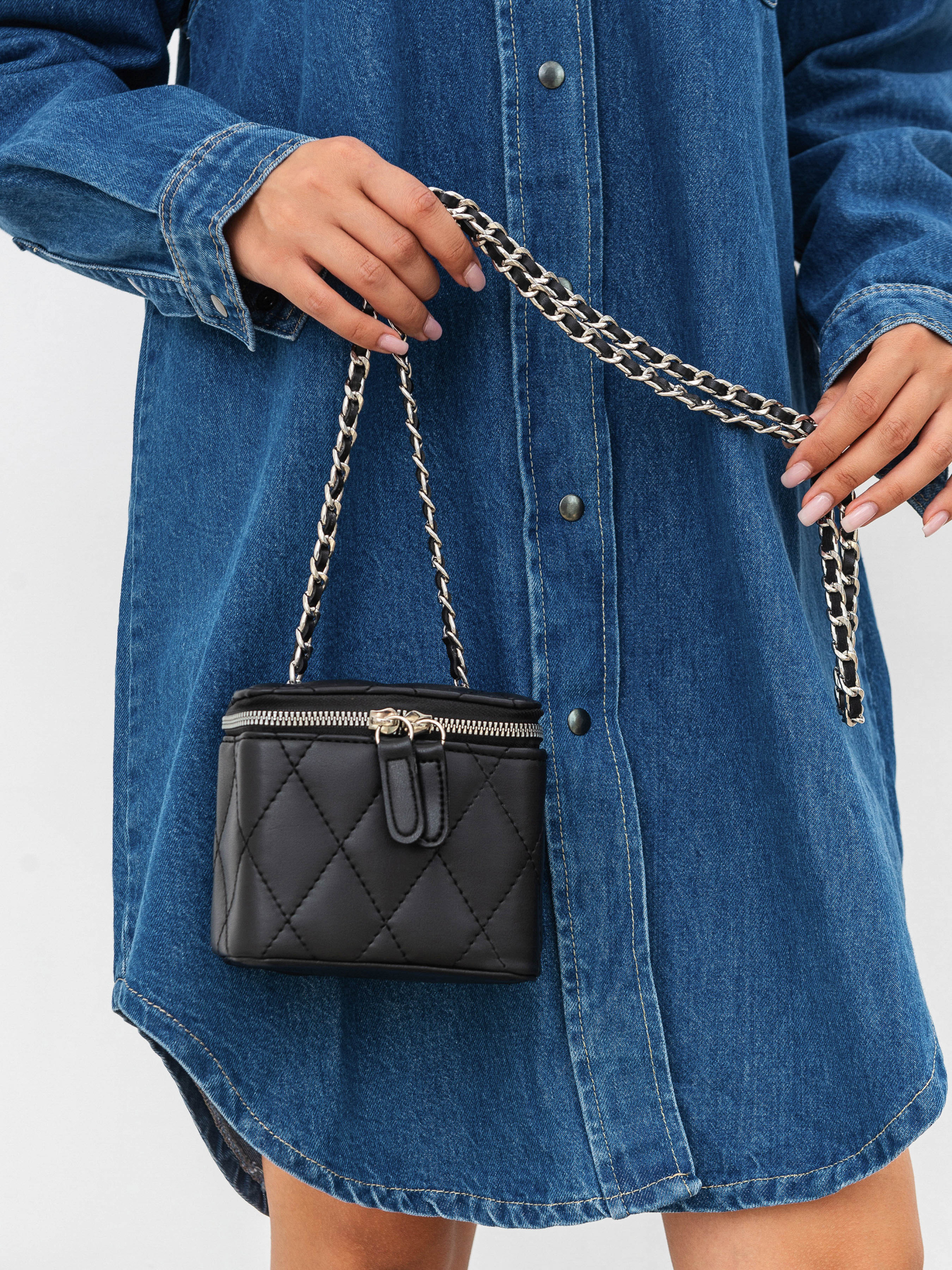 Стильний, мініатюрний клатч на комбінованому ланцюжку. Виготовлений з приємної на дотик екошкіри. Добре тримає форму та застібається на блискавку. Додатково всередині є текстильна підкладка та одне основне відділення. Ремінець має комбінацію екошкіри та металу. Витончена стьобана модель підкреслить вишуканість кожного образу. Вона легко комбінуватиметься з мінімалістичними луками з легких, невагомих тканин. Висота аксесуару: 11 см Довжина аксесуару: 10 см Ширина аксесуару: 13 см Довжина ремінця: 56 см