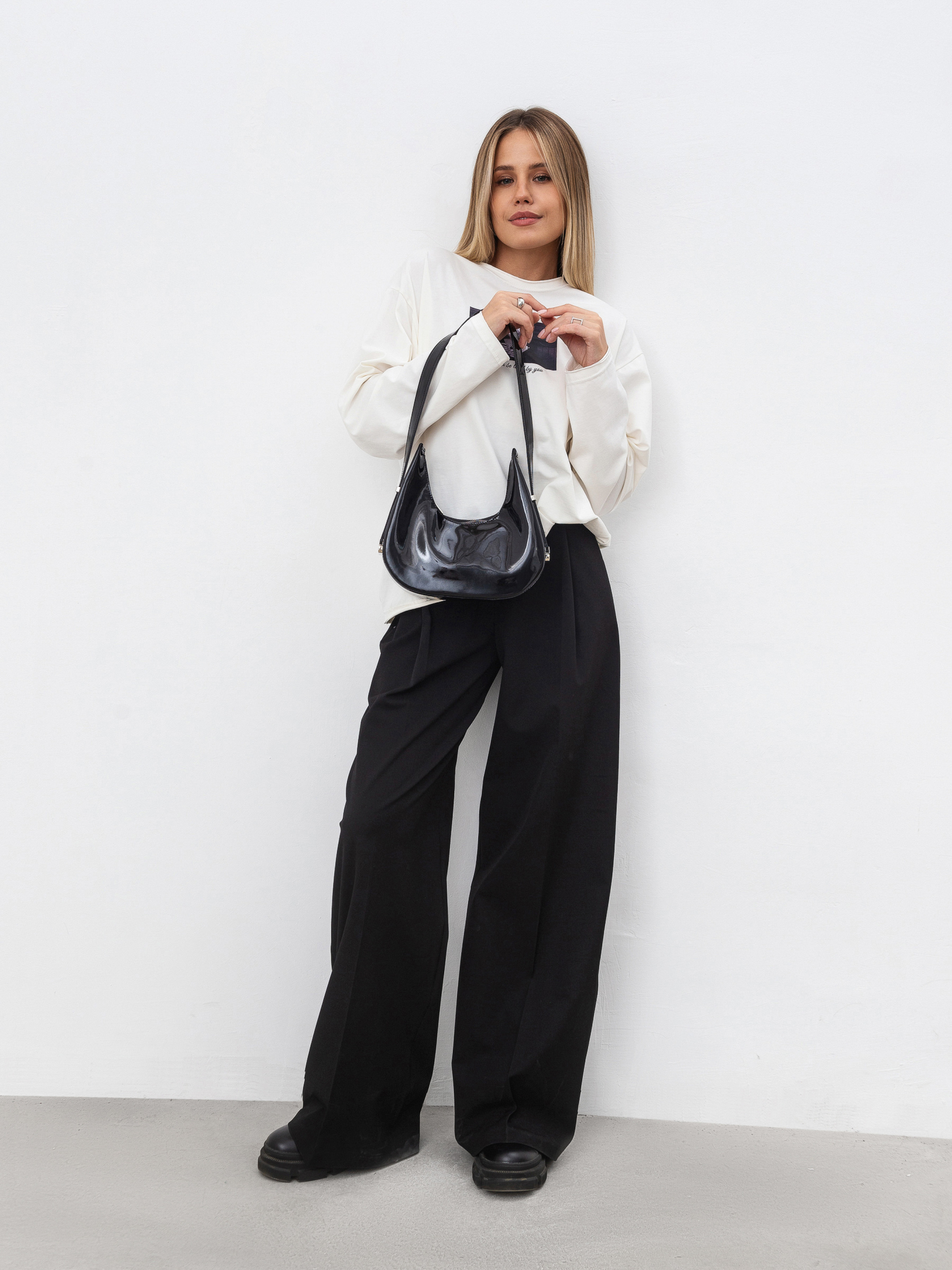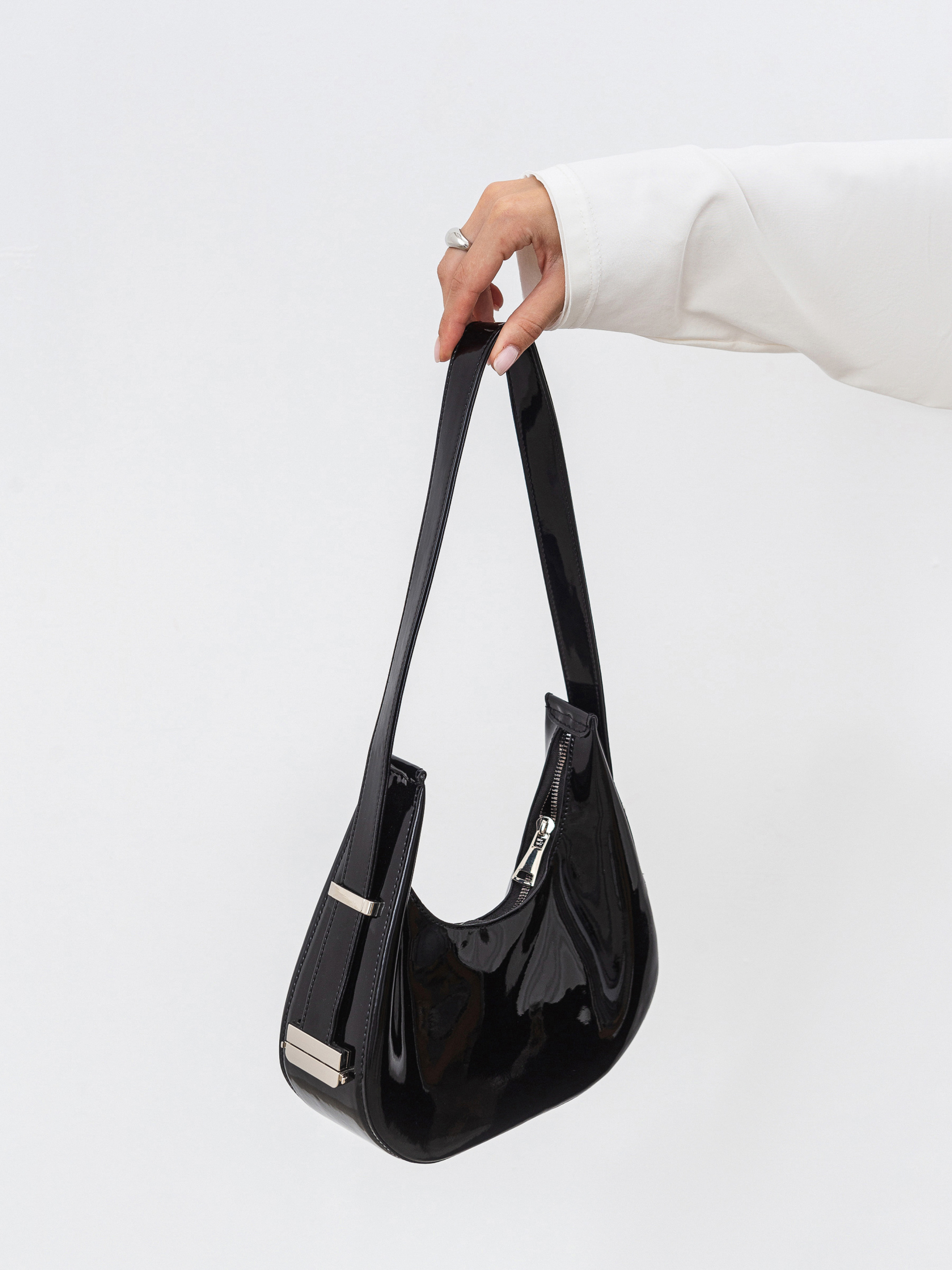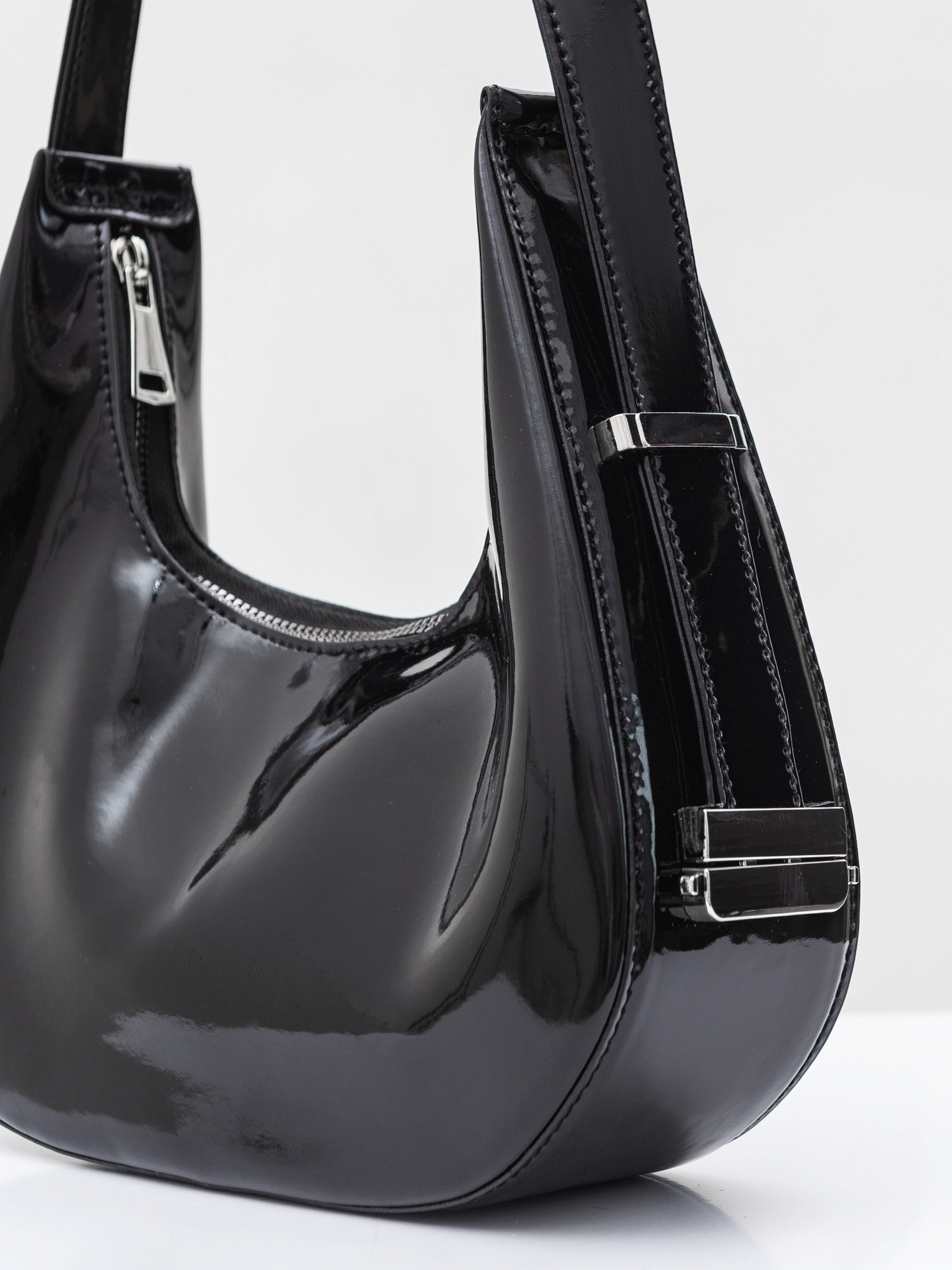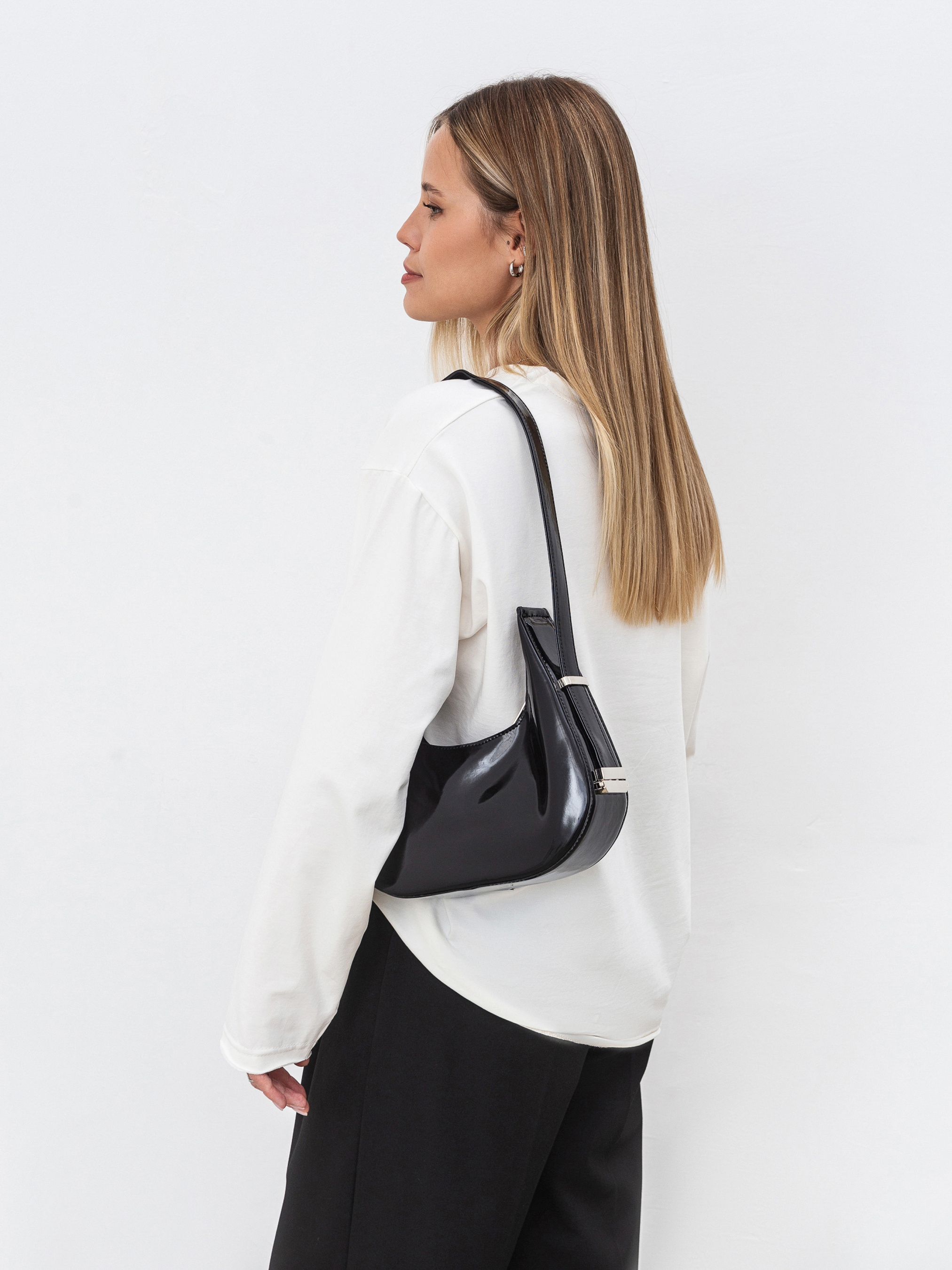 Стильна сумка фасону хобо середнього розміру. Виготовлена з трендового лакованого матеріалу. Має фурнітура з темного нікелю. Подовжена ручка додає комфорту в носінні та цікавості загальному вигляду. У комплекті додатковий гаманець на блискавці. Модель можна легко комбінувати з образами з довгими пальто та високими підборами. Доповнювати можна макіяжем і зібраною зачіскою. Висота 22 см, довжина 24 см, ширина 8 см
