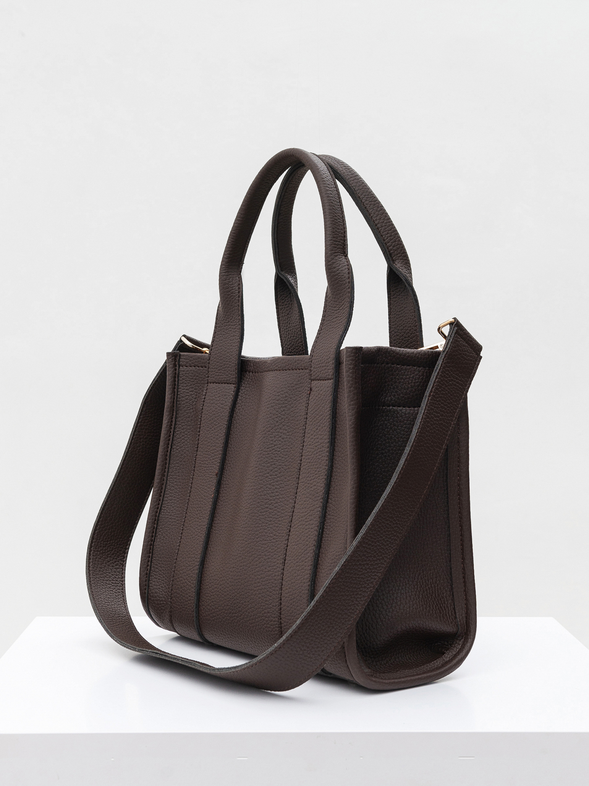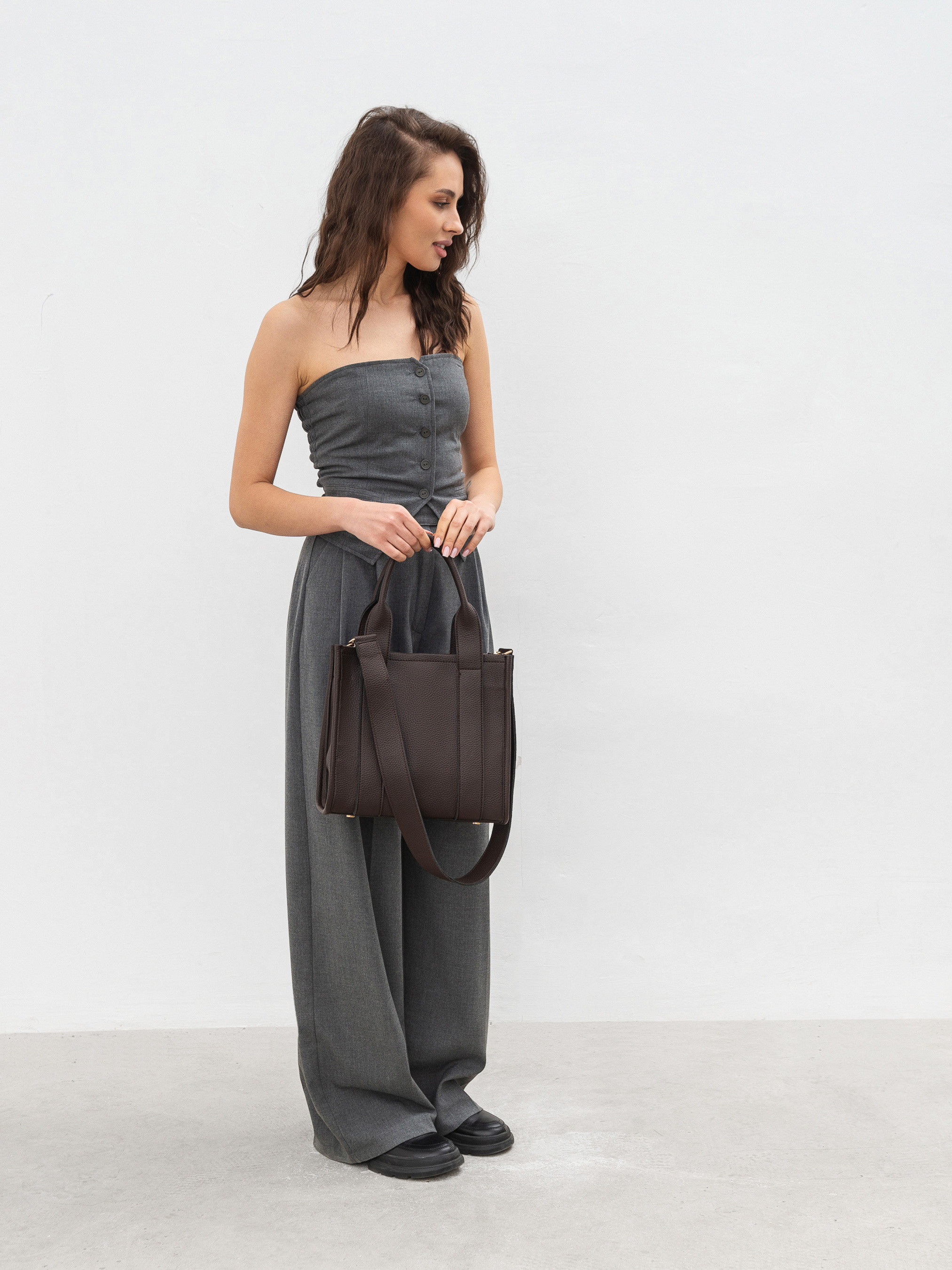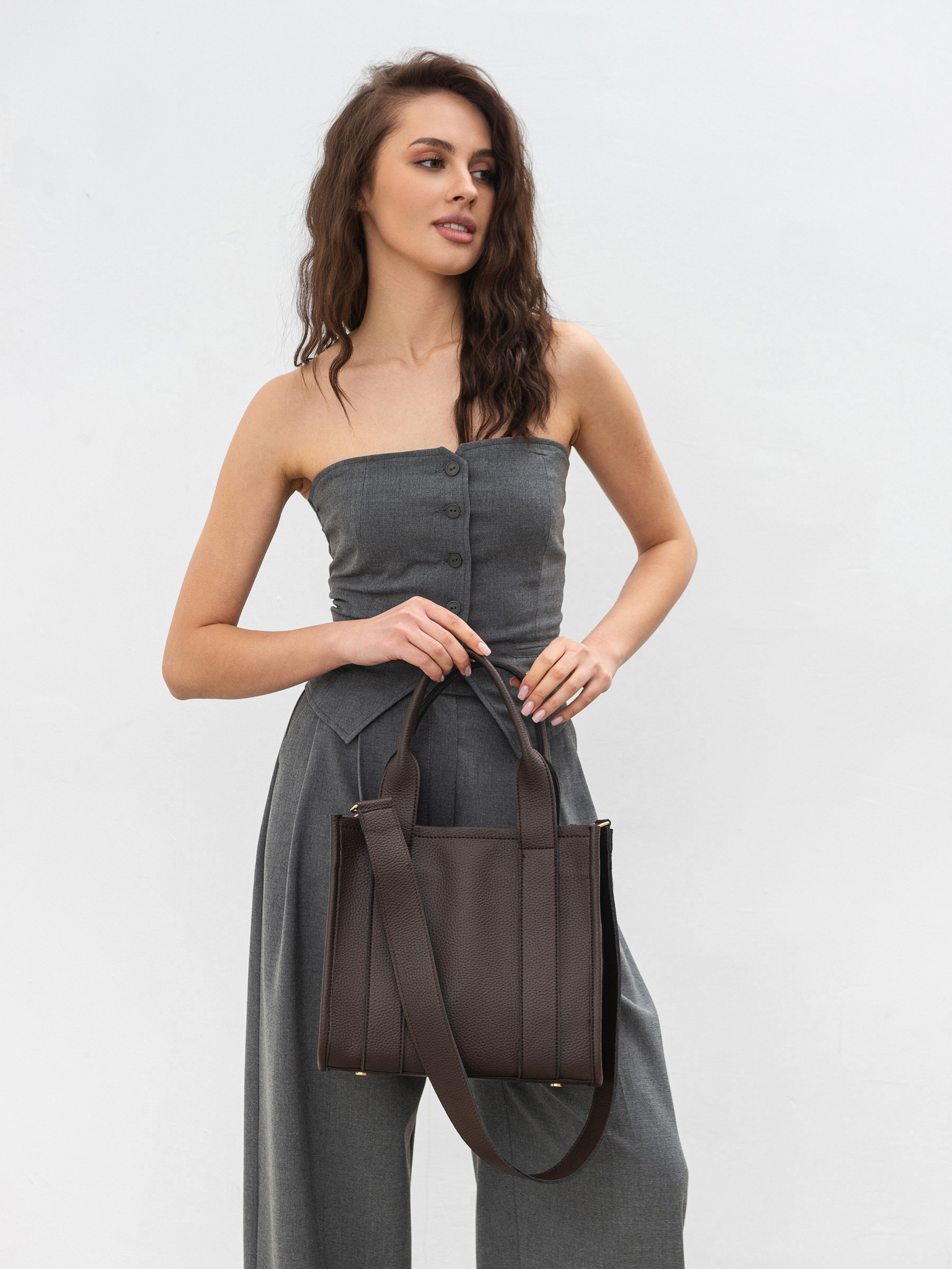 Універсальна сумка-шоппер. Модель середнього розміру має у комплекті довгий широкий ремінець. Усередині є текстильна підкладка і додаткові кишеньки. Фурнітура зі світлого нікелю. Ідеальний варіант, якщо вам потрібна зручна сумка, що вмістить багато речей для офісної рутини чи навчання. Довжина 28см, висота 25см, ширина 15см