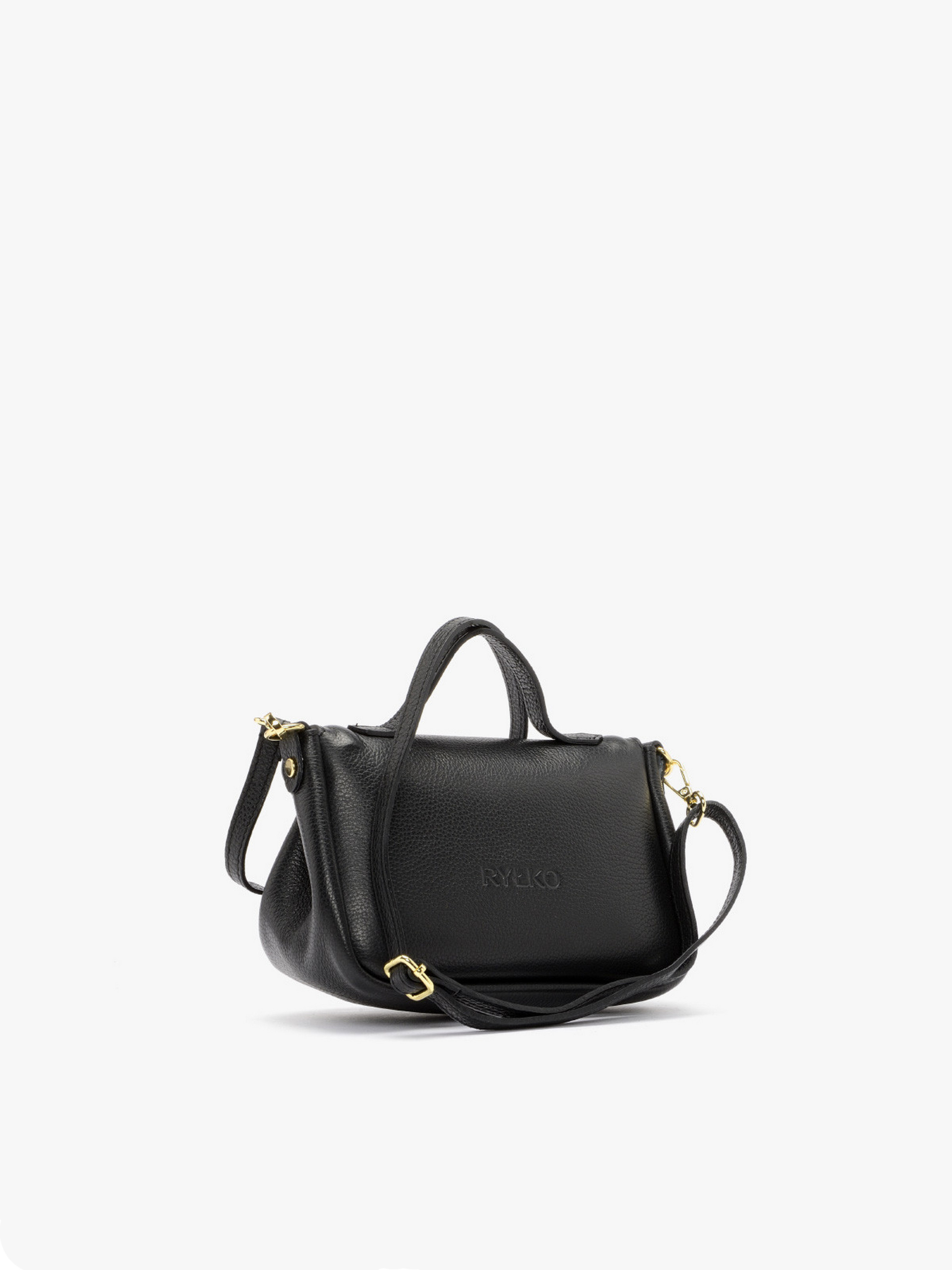 Сумка шкіряна чорна польського виробника RYŁKO. Виконана з лицевої шкіри високої якості. Модель маленького розміру. З тильної сторони є фірмове тиснення. Оснащена 1 основним відділом з маленькою кишенькою всередині. А також має шкіряну ручку та регульований плечевий ремінець максимальною довжиною 130 см. Застібається на магніт.