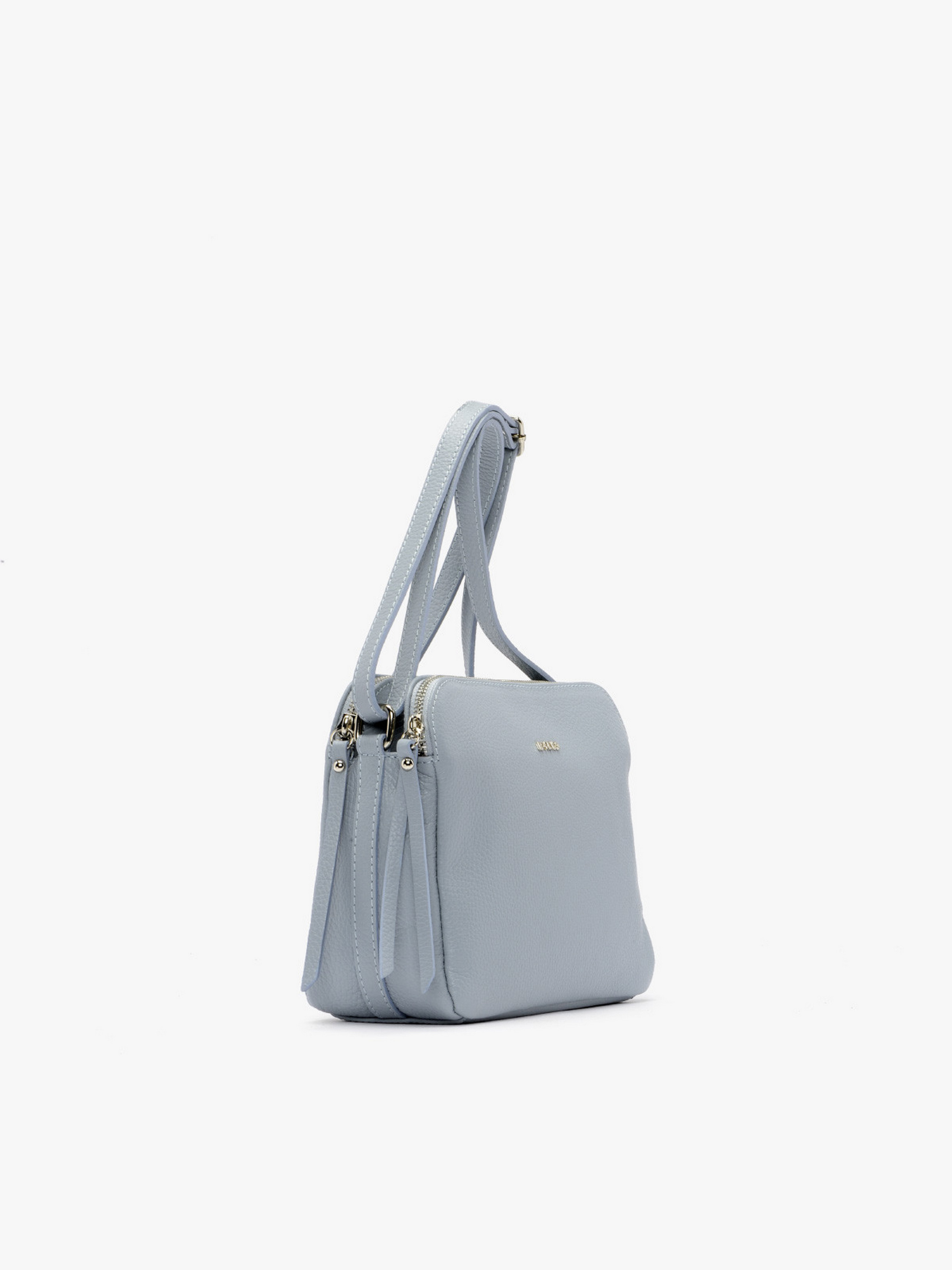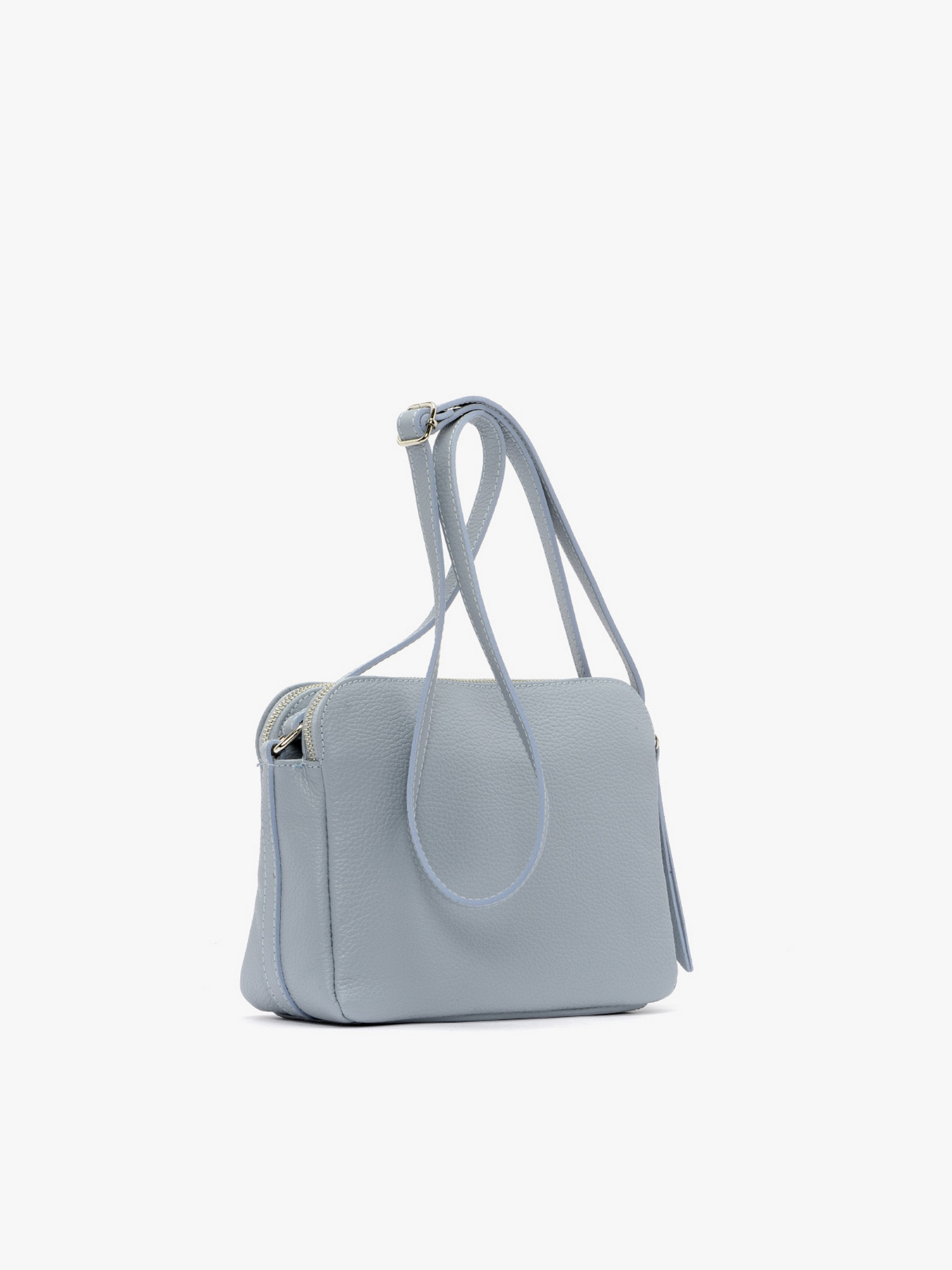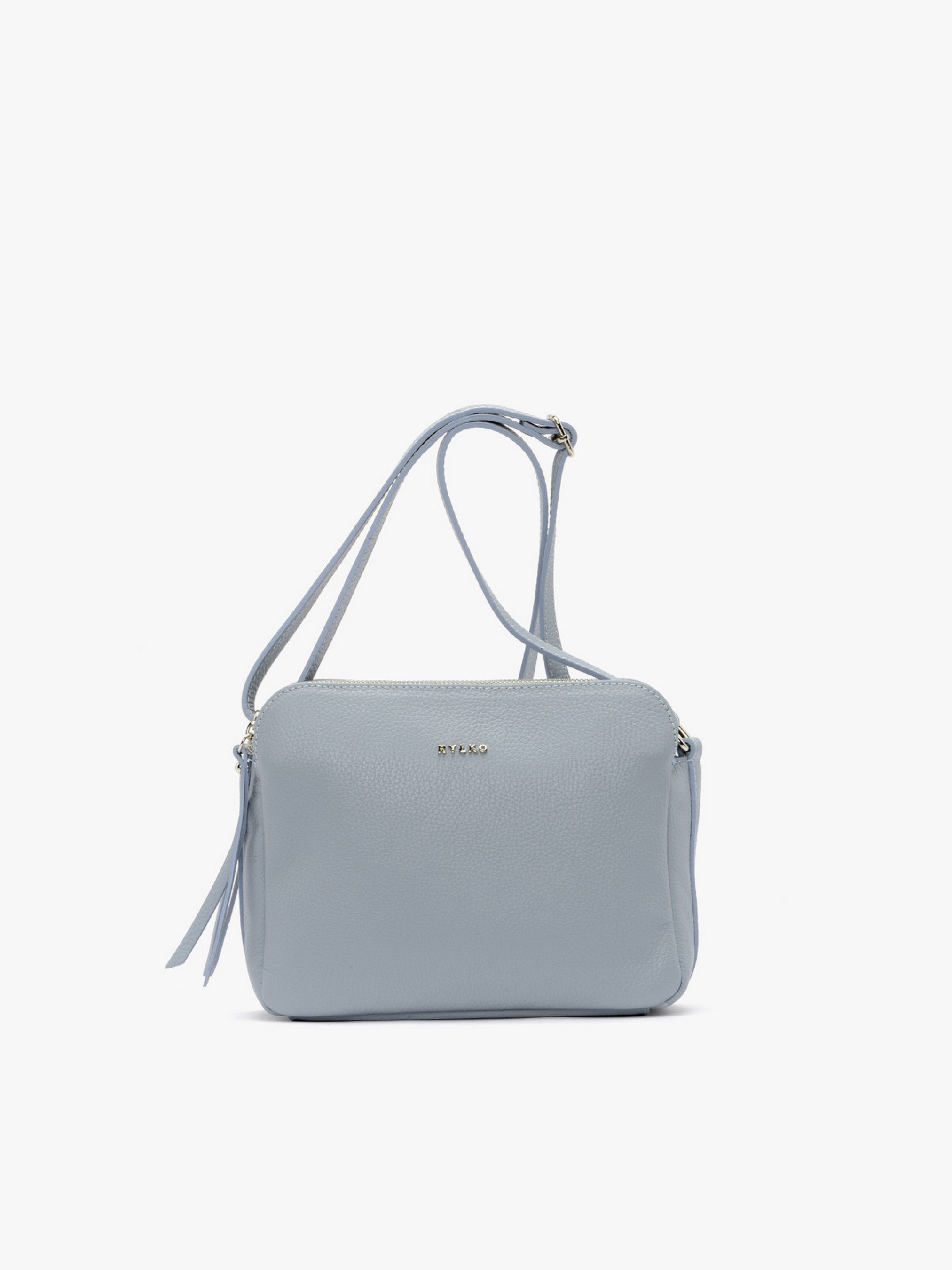 Практична сумочка RYŁKO із натуральної шкіри блакитного кольору. Сумка середнього розміру не вміщує формат А4. Із застібкою-блискавкою (2 шт.). Модель з 1 зовнішньою кишенею, 2 внутрішніми кишенями, 1 відділенням та регульованим ременем на плече, довжина 140 см. Розміри: Висота: 20 см, Ширина: 24 см, Глибина: 10 см.