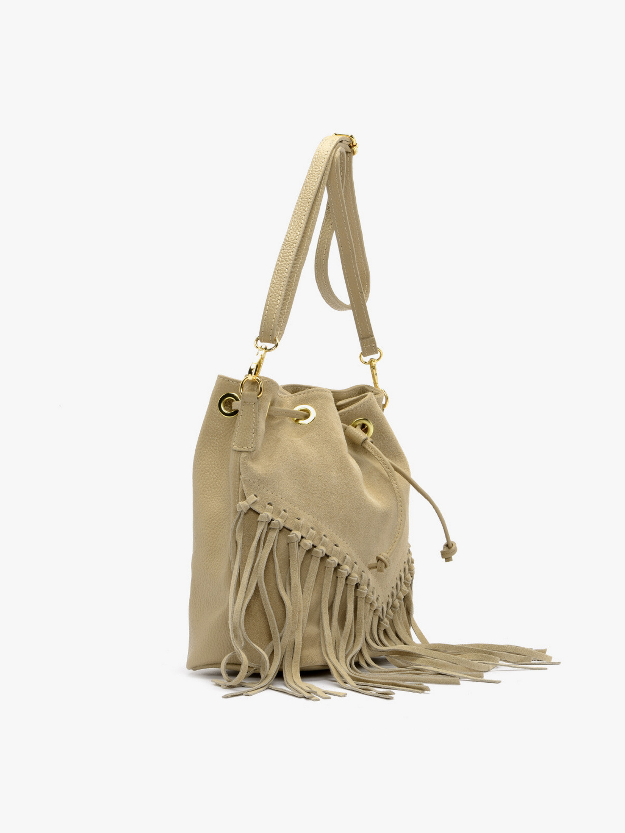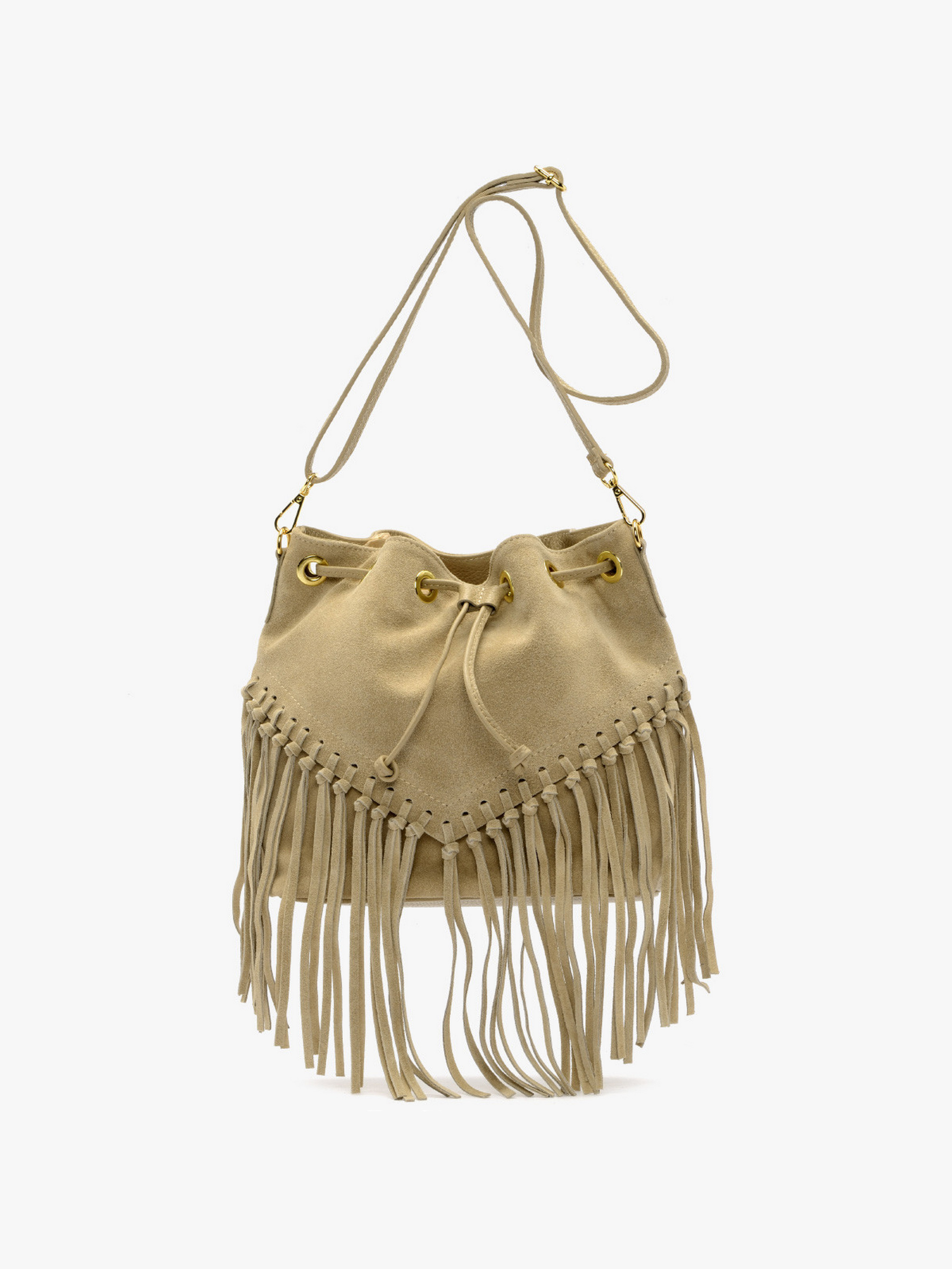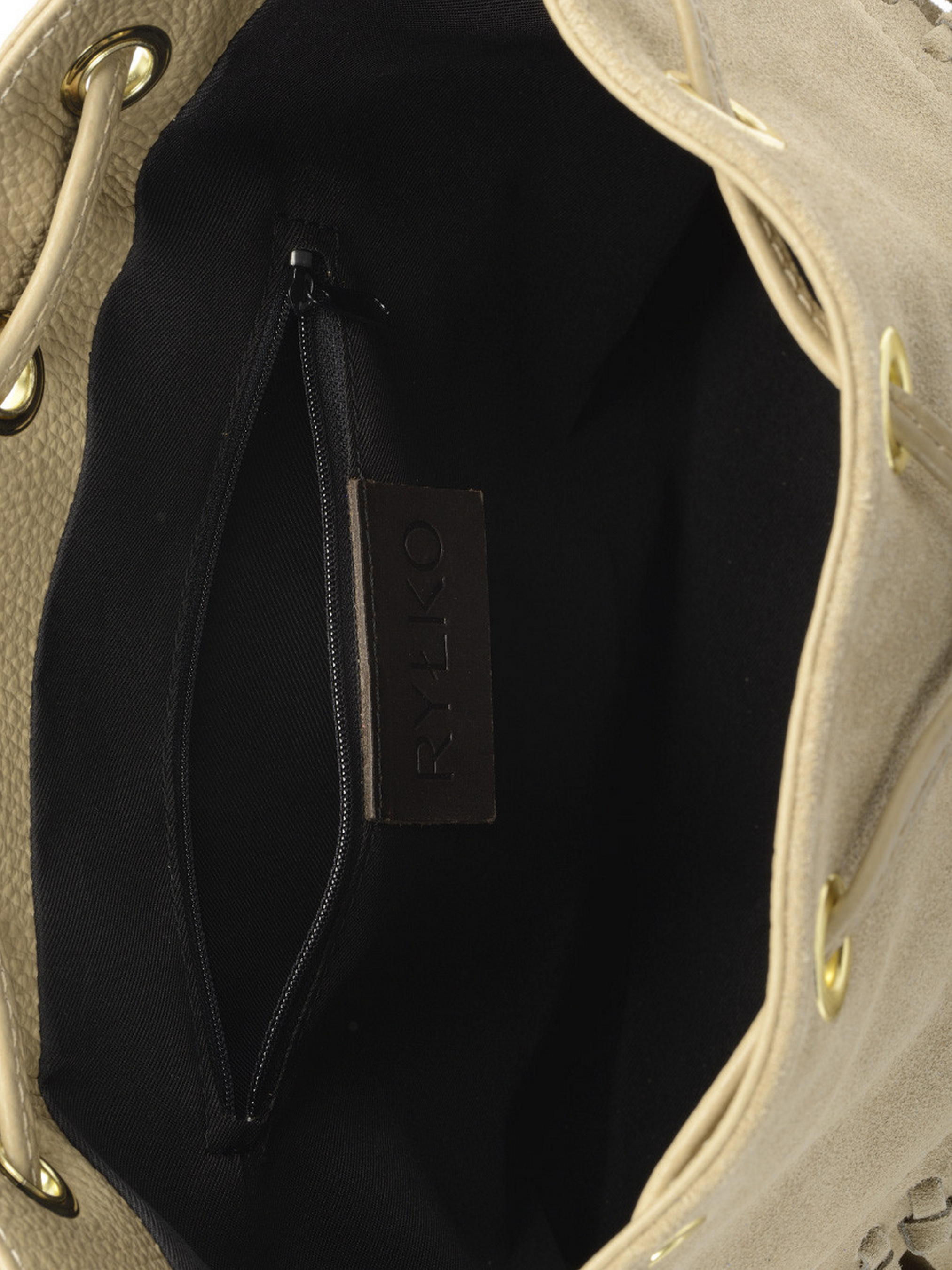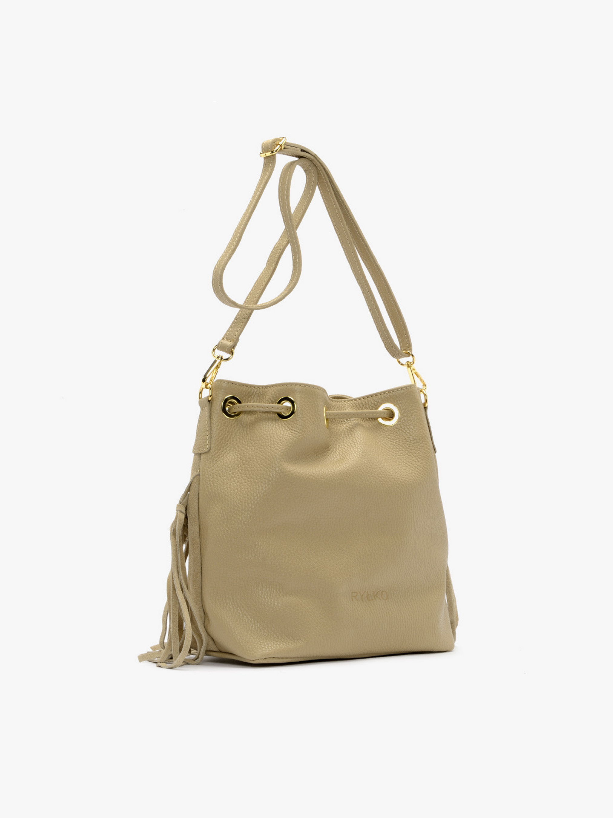 Модна сумочка RYŁKO у ковбойському стилі бежевого кольору. Виготовлена з натуральної шкіри та замшевої шкіри. Сумка середнього розміру не вміщує формат А4. Модель з 1 внутрішньою кишенею та регульованим ременем на плече, довжиною 120 см. Має декоративні елементи золотистого кольору. Розміри: Висота: 25 см, Ширина: 26 см, Глибина: 13 см.
