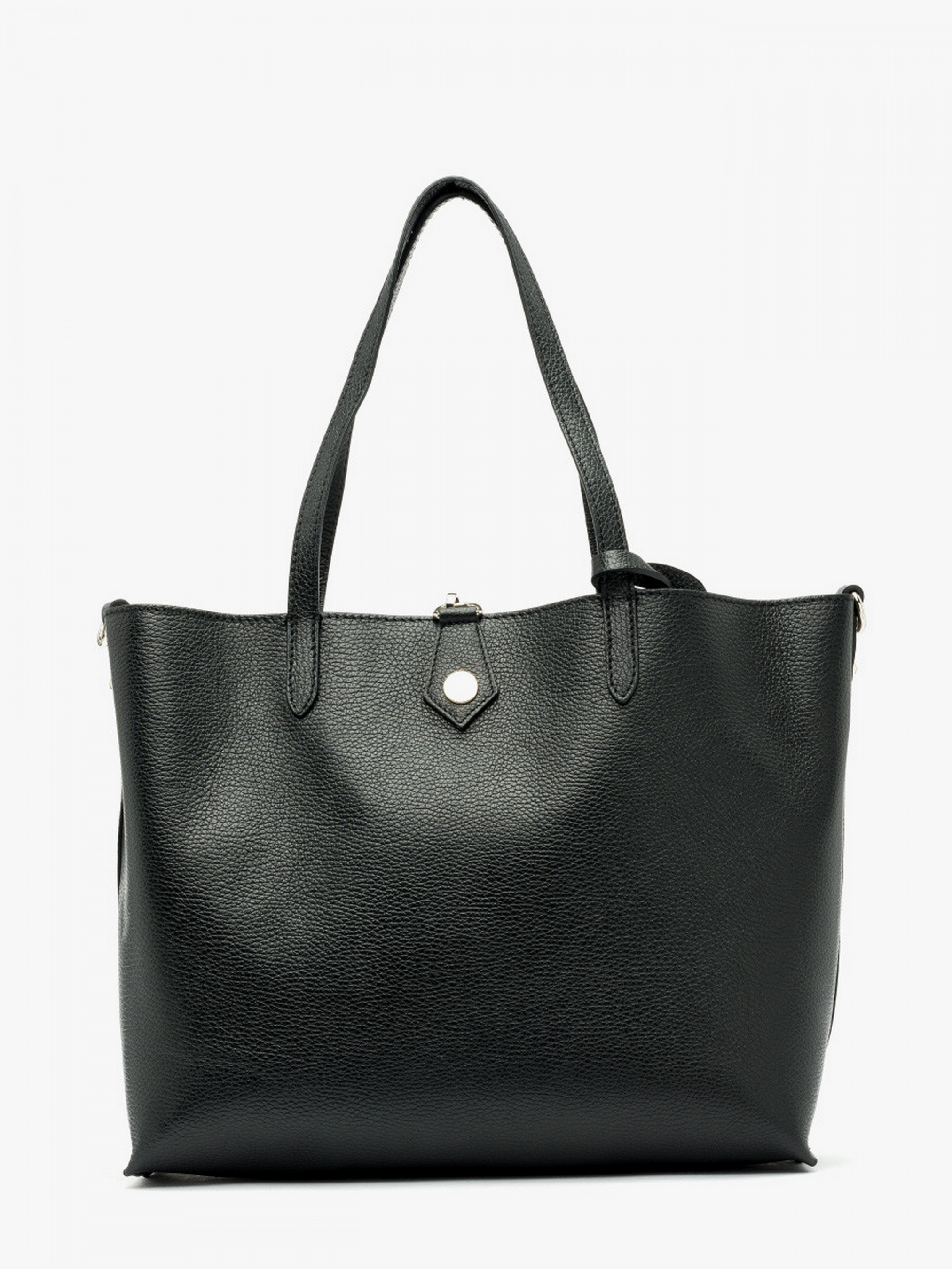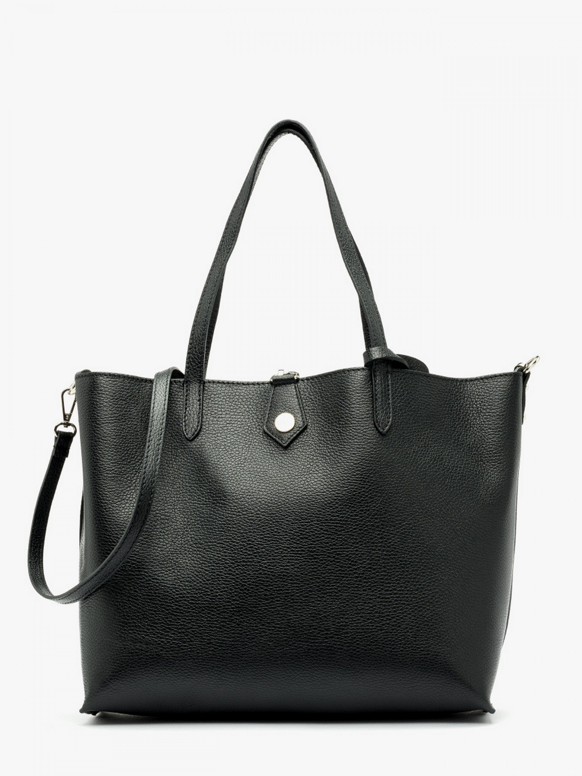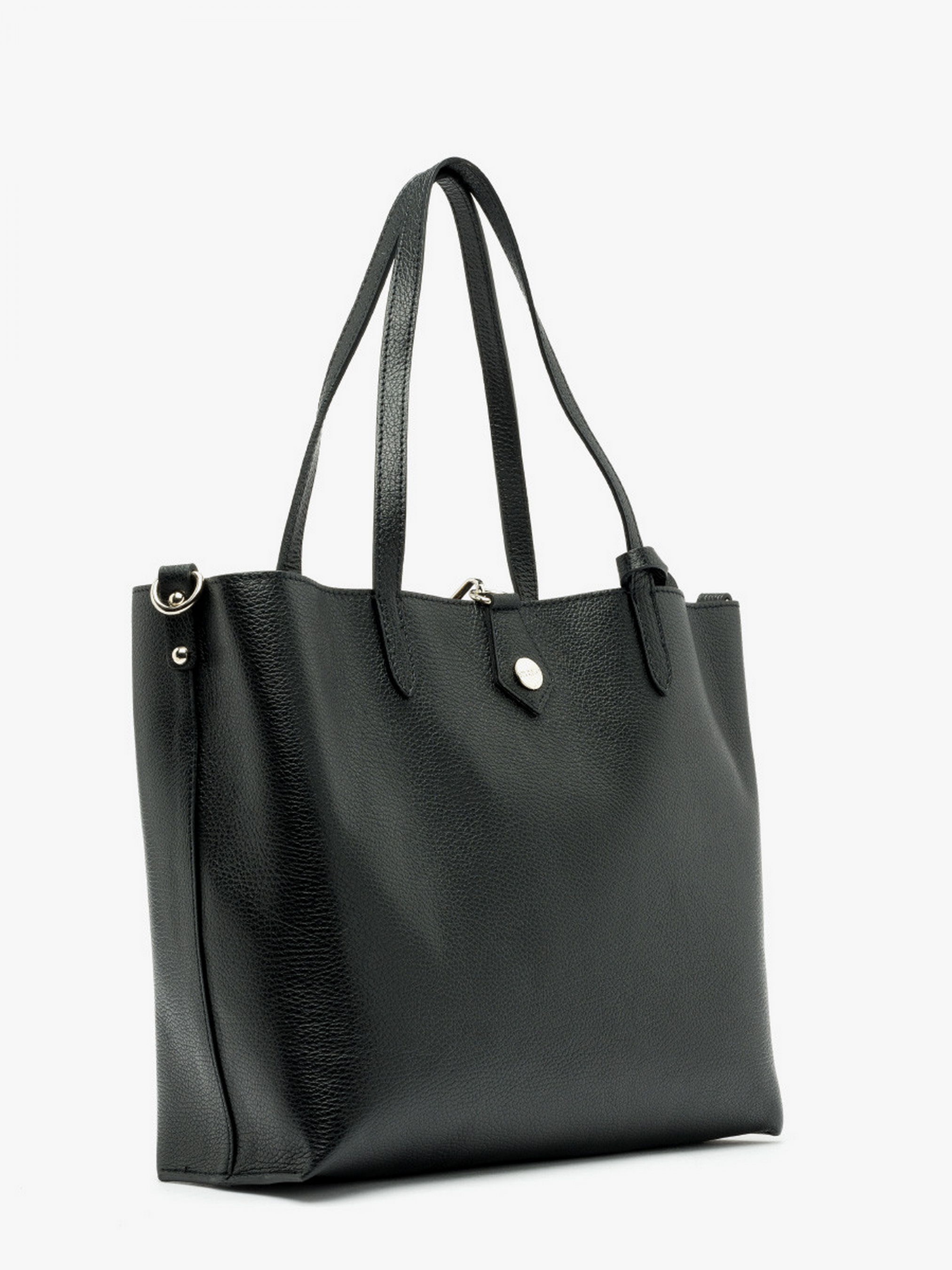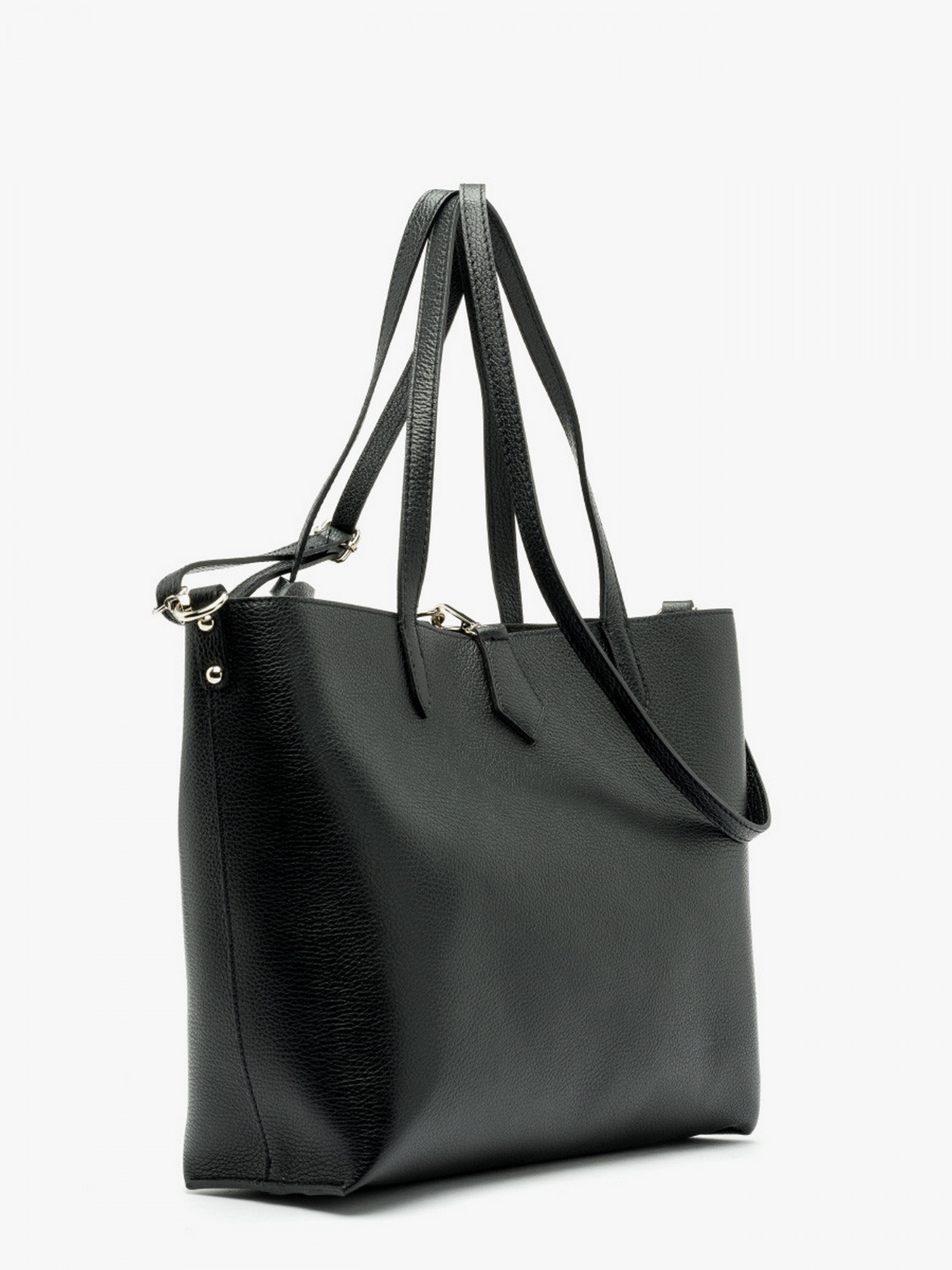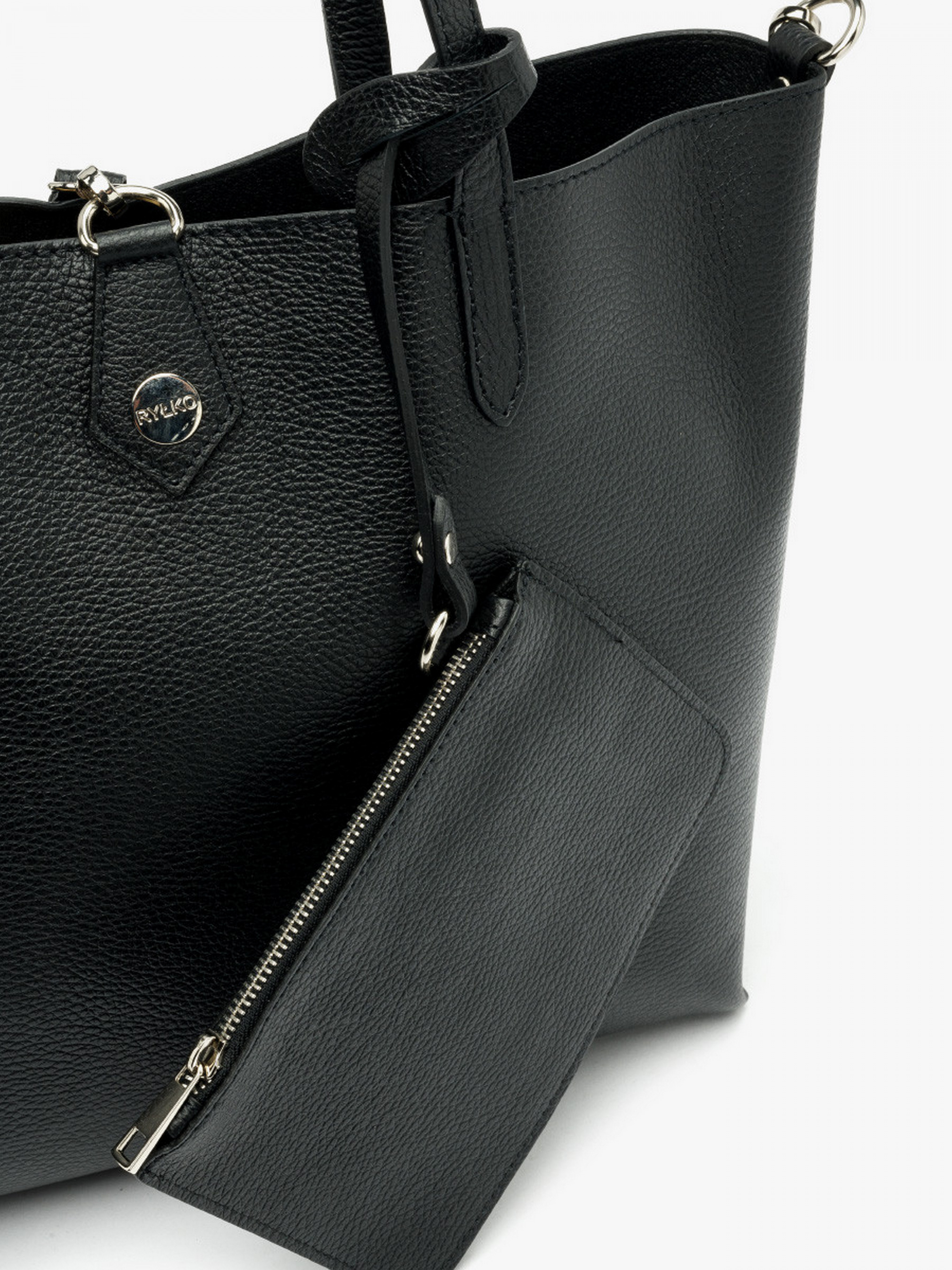 Шкіряна сумка-шопер у чорному кольорі польського виробника RYLKO. Виконана з натуральної лицевої шкіри високої якості. Декорована сріблястою фурнітурою у вигляді фірмового лого.