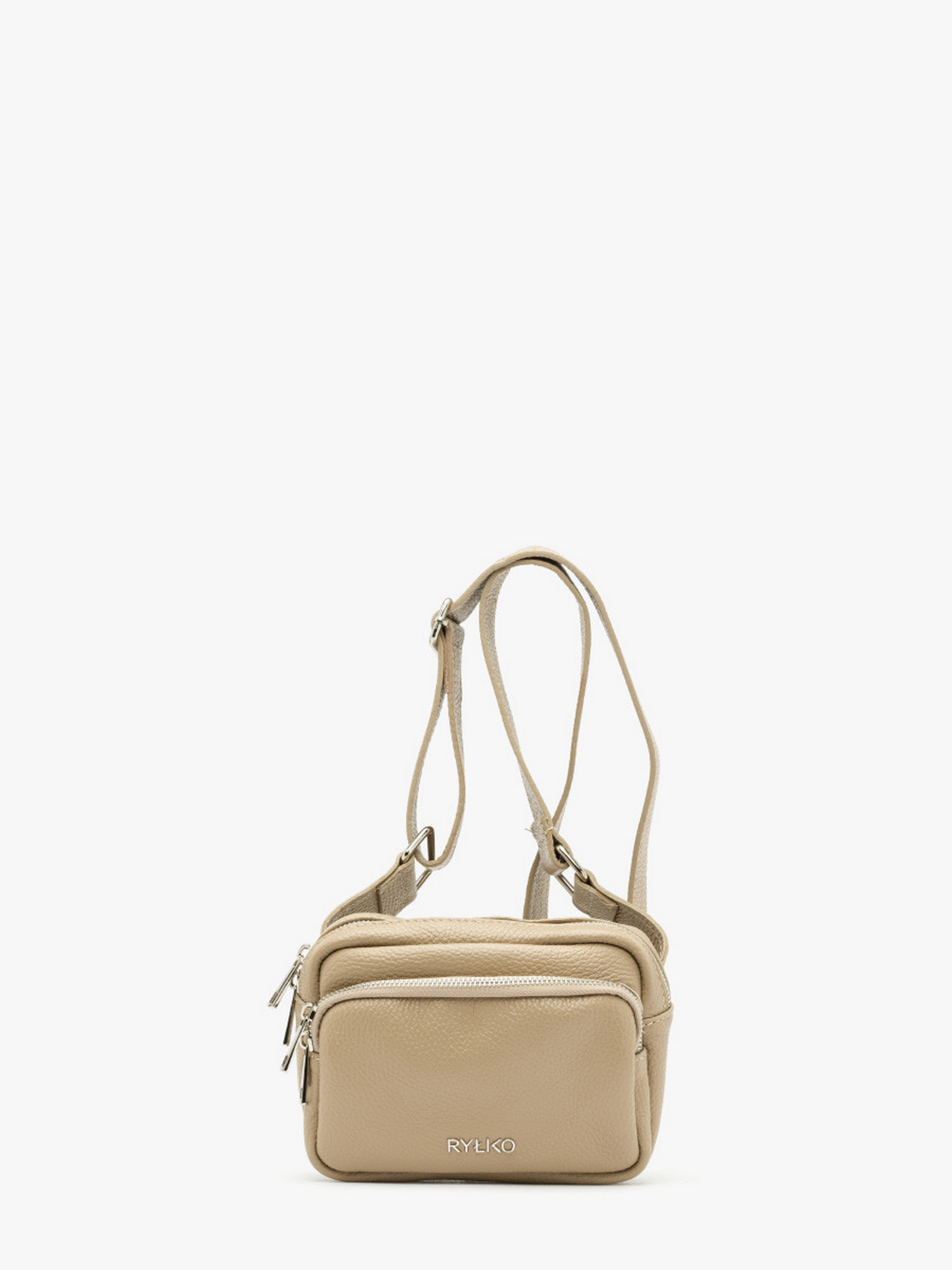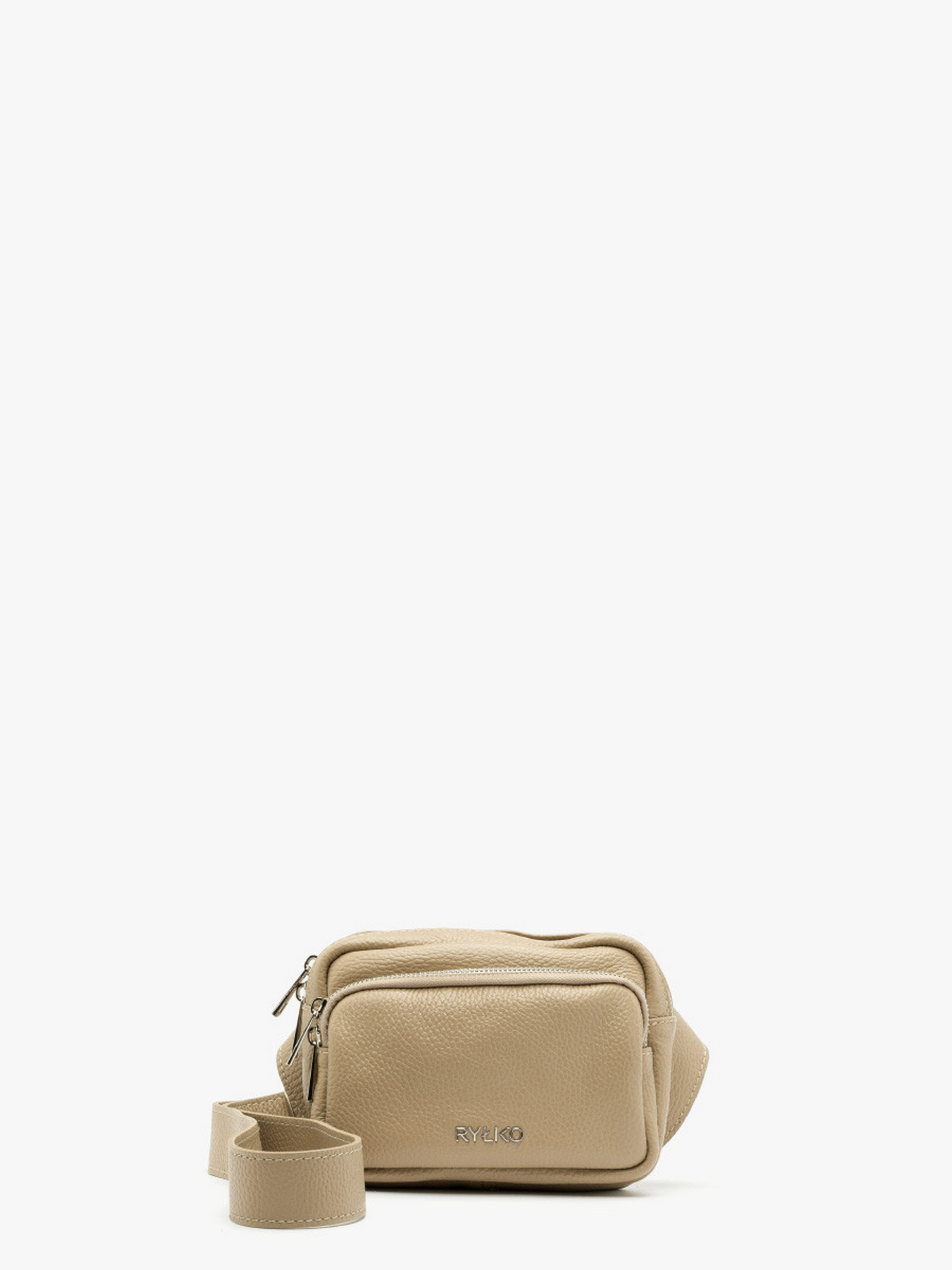 Шкіряна сумка на пояс світло-бежевого кольору польського виробника RYŁKO. Виконана з натуральної лицевої шкіри високої якості. Декорована сріблястою фурнітурою та фірмовим лого з лицевої сторони. Модель має 2 основні відділення та 1 внутрішню кишеню, а також регульований ремінець завдовжки 140 см. Застібка - блискавка. Усередині – текстиль. Розмір виробу маленький, не вміщує формат A4. Висота: 15 см Ширина: 20 см Глибина: 8 см