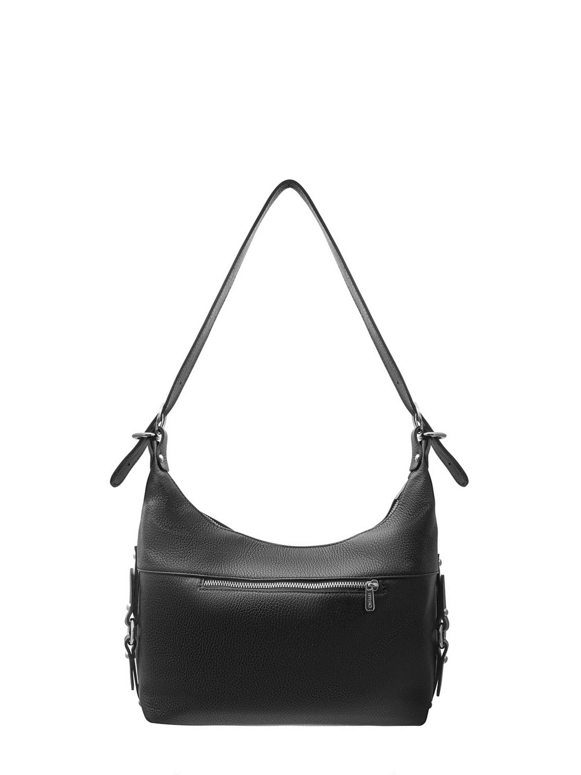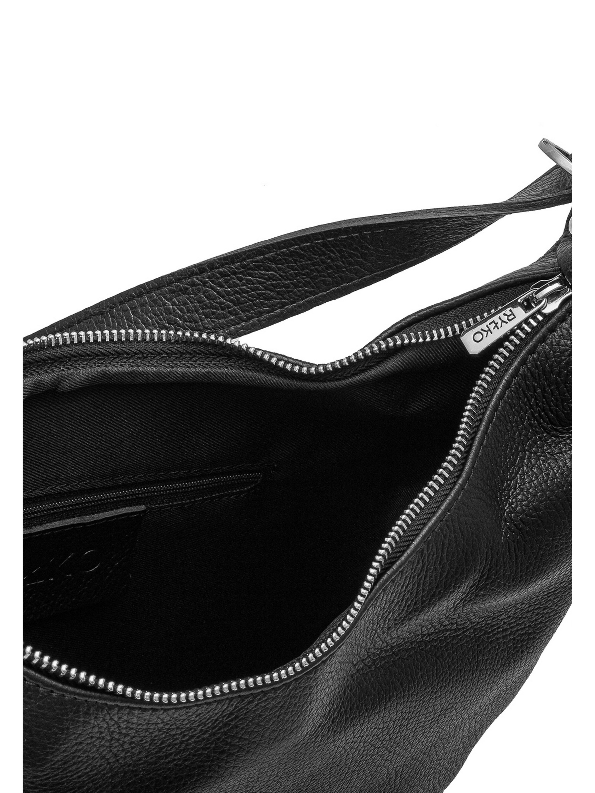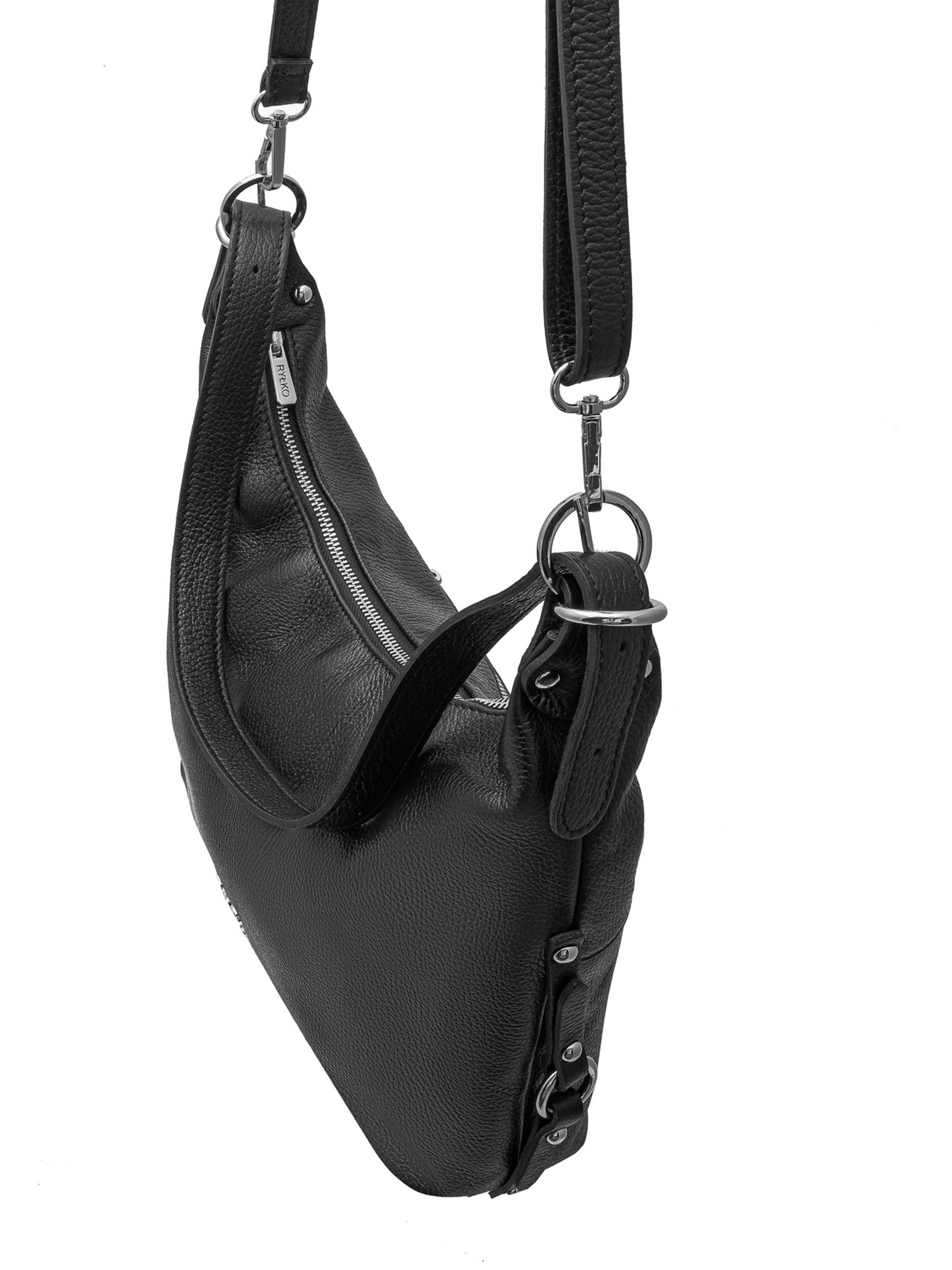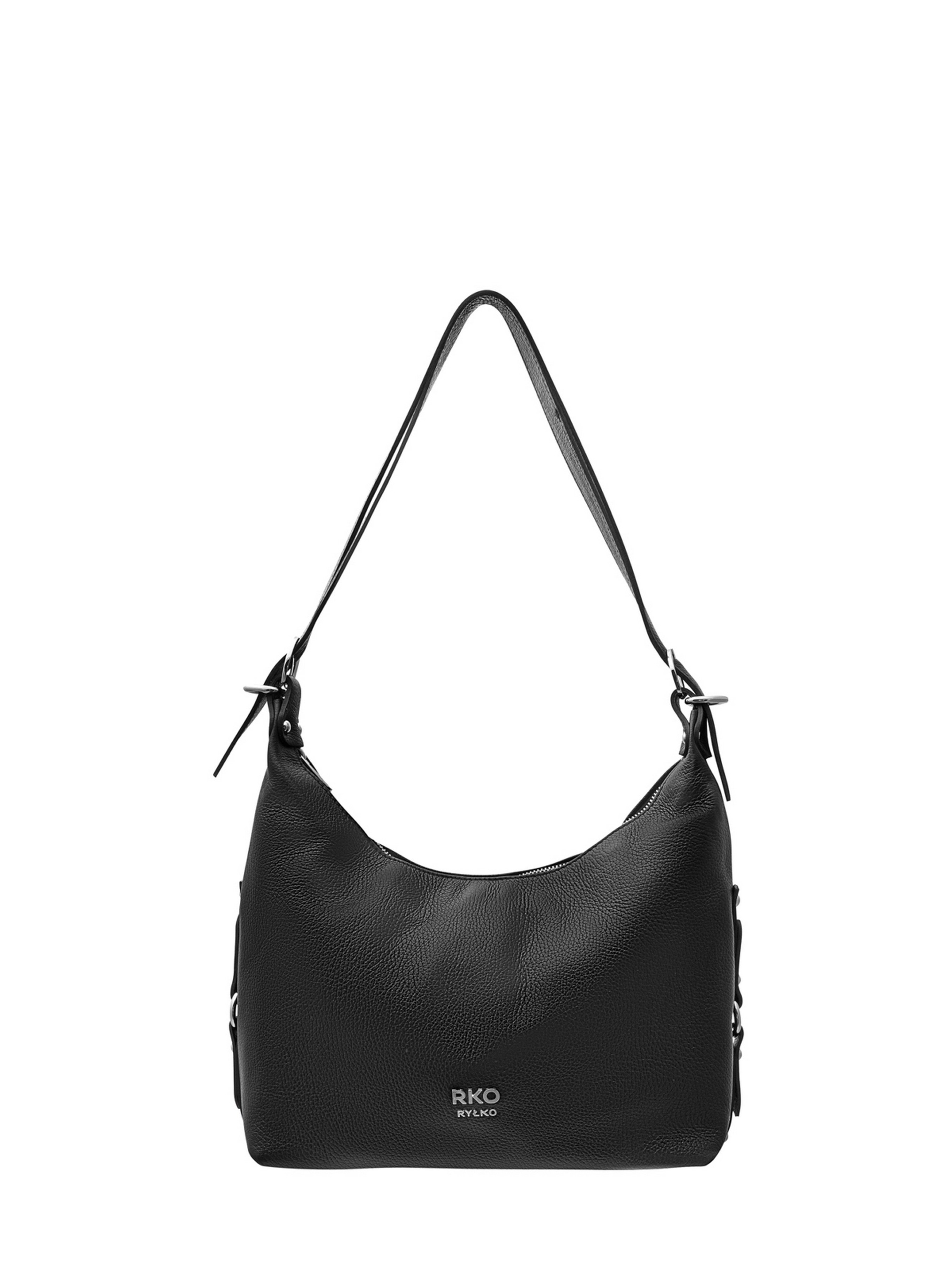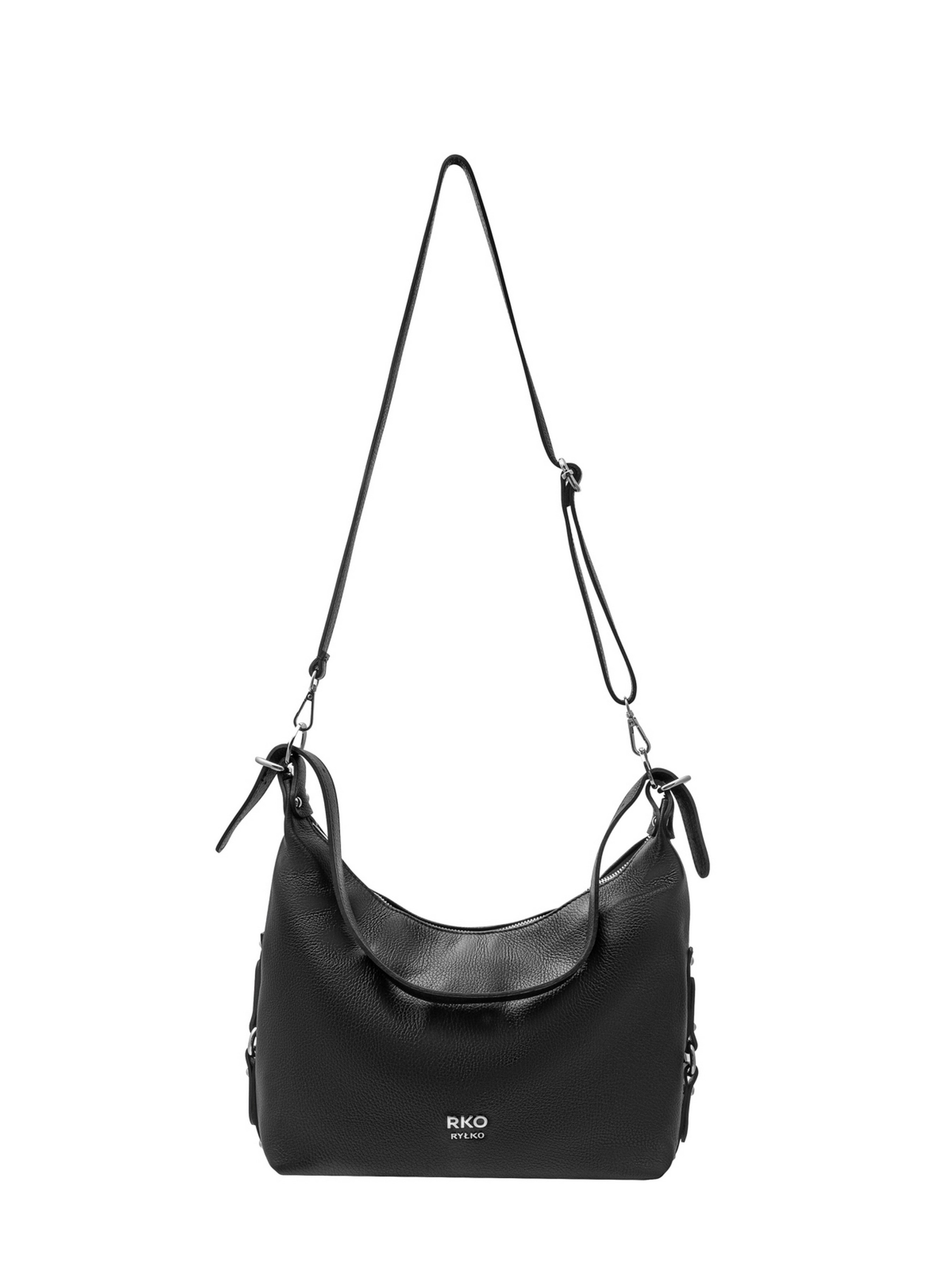 Шкіряна сумка польського виробника RYLKO чорного кольору. Виконана з натуральної шкіри високої якості. Сумка великого розміру. Оснащена 1 основним відділенням з маленькою кишенею всередині та зовнішньою кишенею з тильної сторони. Модель має зручну ручку висотою 35 см і регульований ремінець довжиною 115 см. Декорована фурнітурою сріблястого кольору. Застібка - блискавка. Розміри виробу: Висота: 30 см Ширина: 31 см Глибина: 13 см