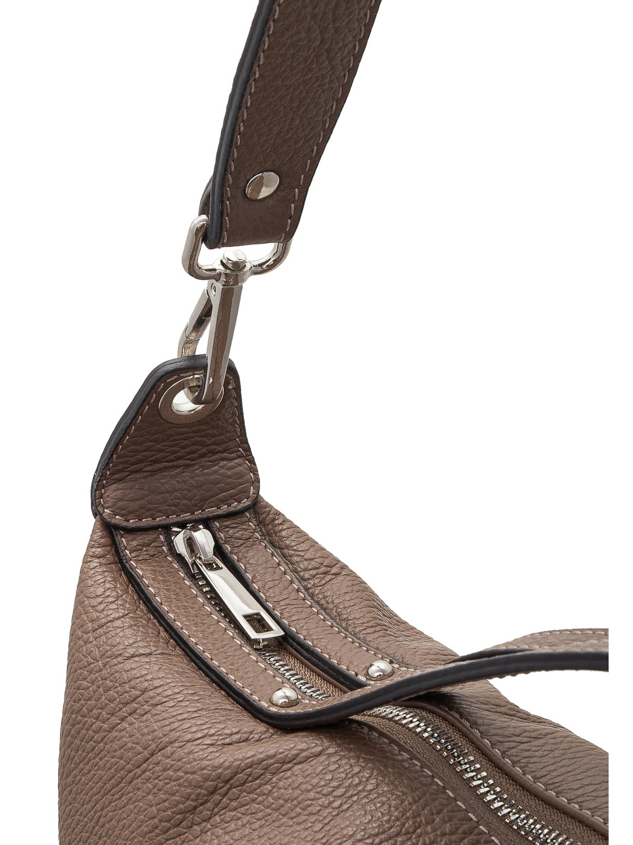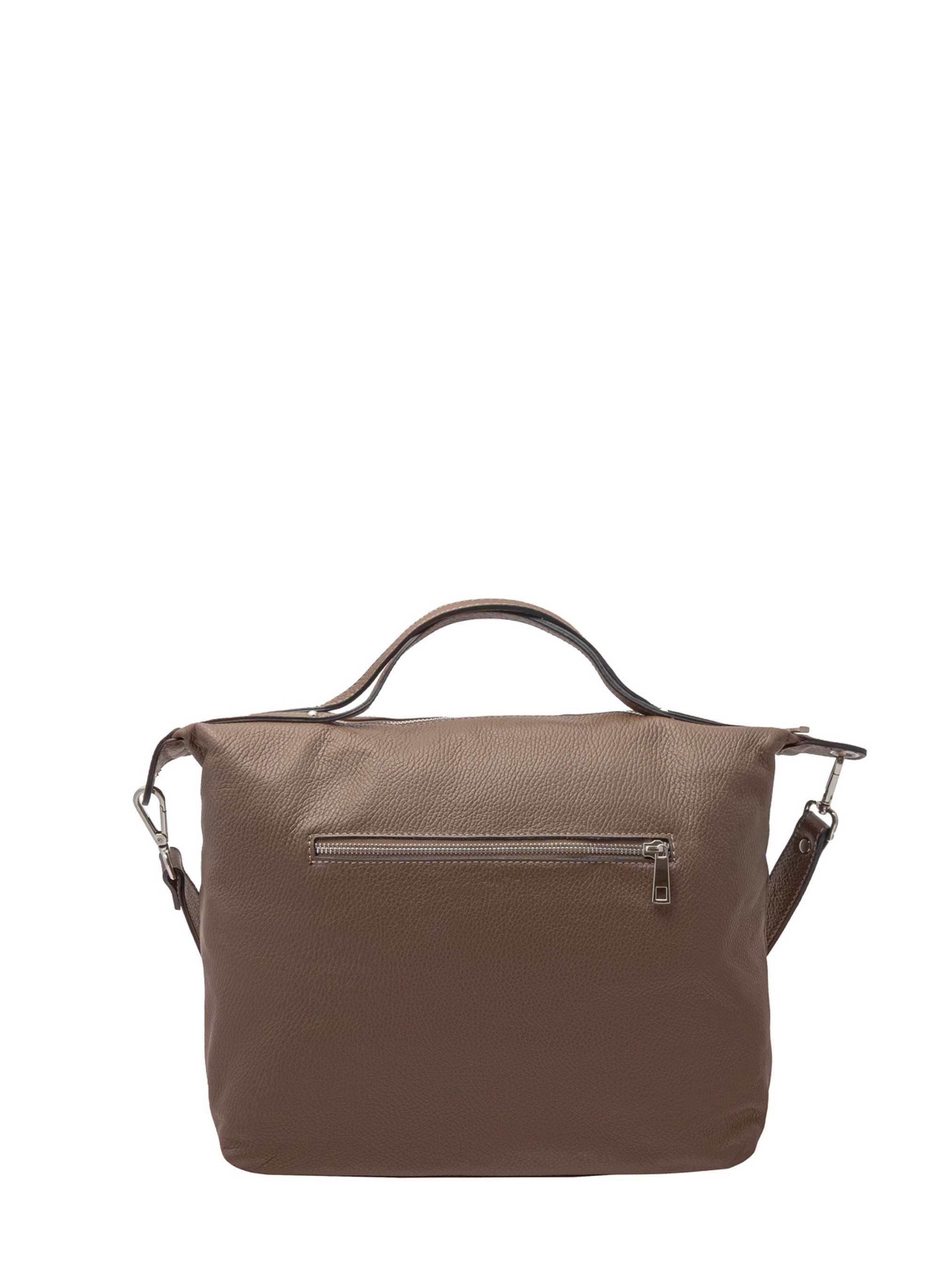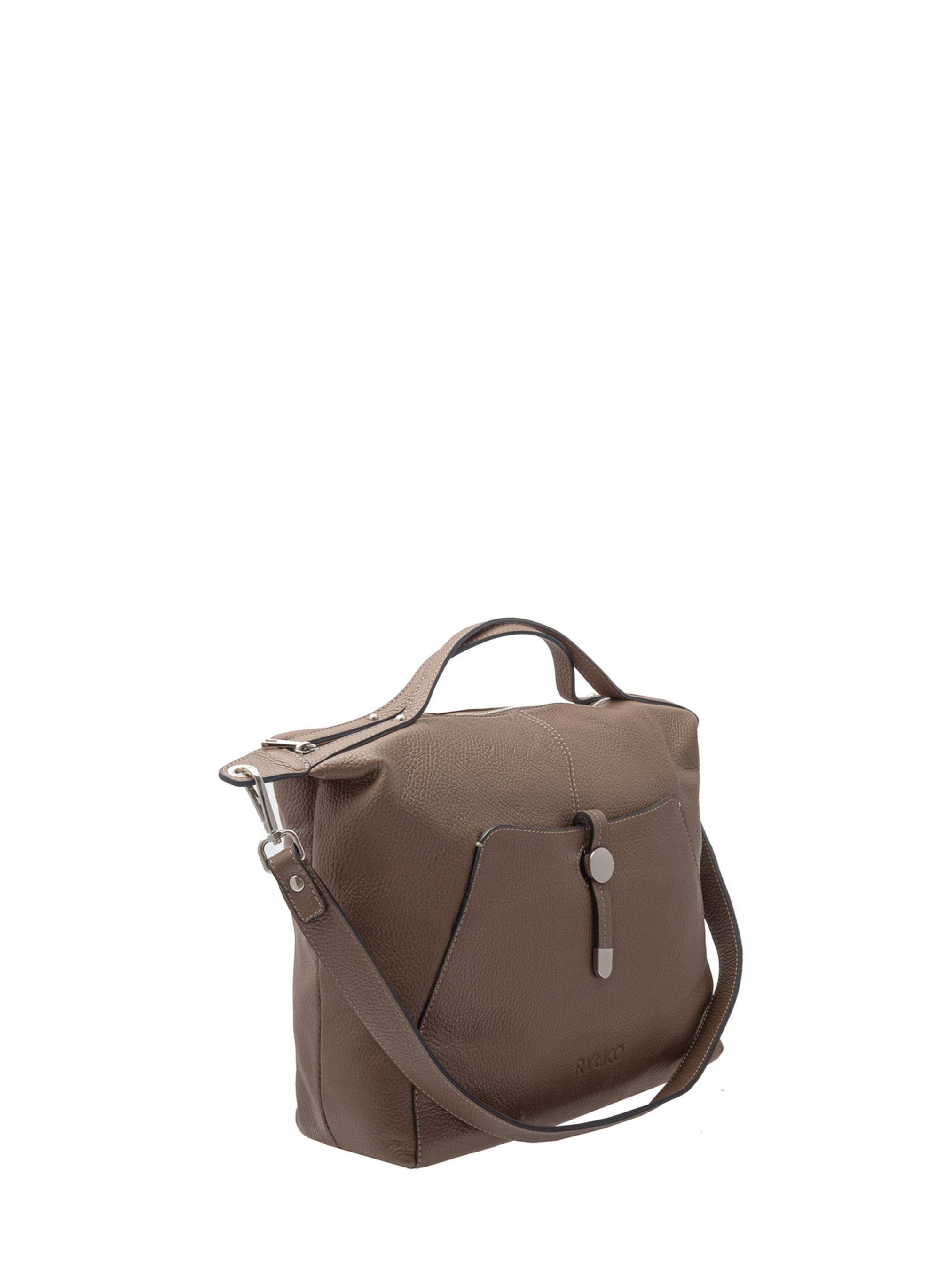 Велика темно-бежева сумка польського виробника RYŁKO. Виготовлена із натуральної суцільнозернистої шкіри високої якості. Сумка велика, містка, вміщує формат А4. Модель оснащена 1 великим основним відділеннями, 2 зовнішніми кишенями, шкіряними ручками заввишки 12 см і знімним нерегульованим плечевим ремінцем завдовжки 80 см. Застібка - блискавка. Фурнітура сріблястого кольору.