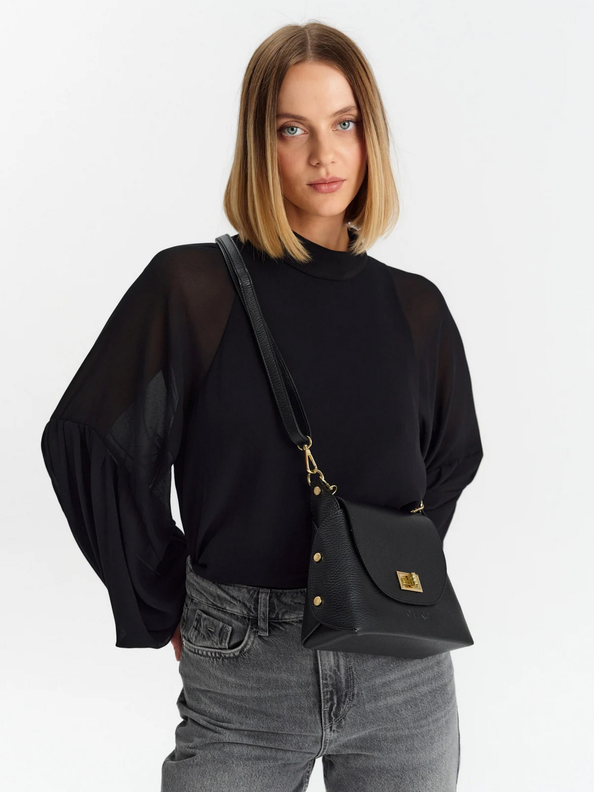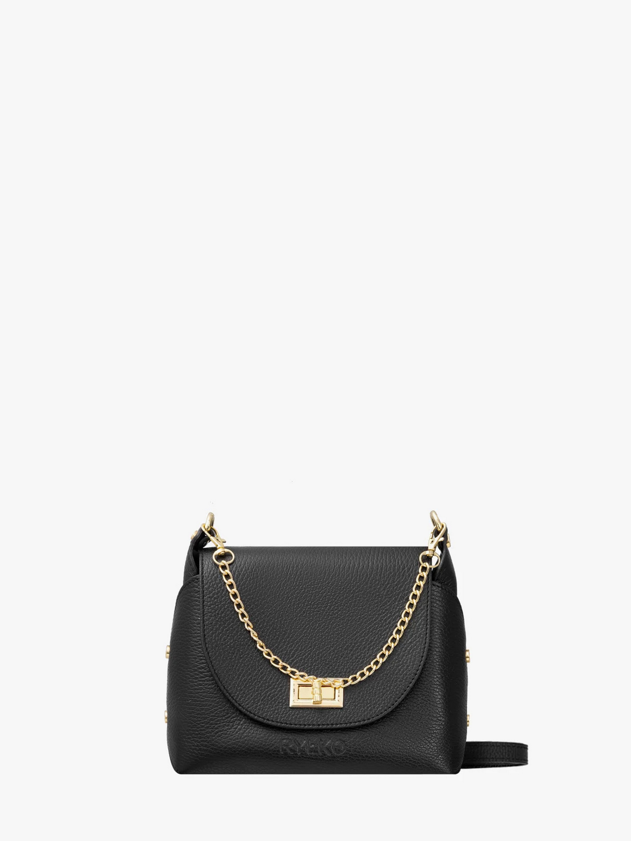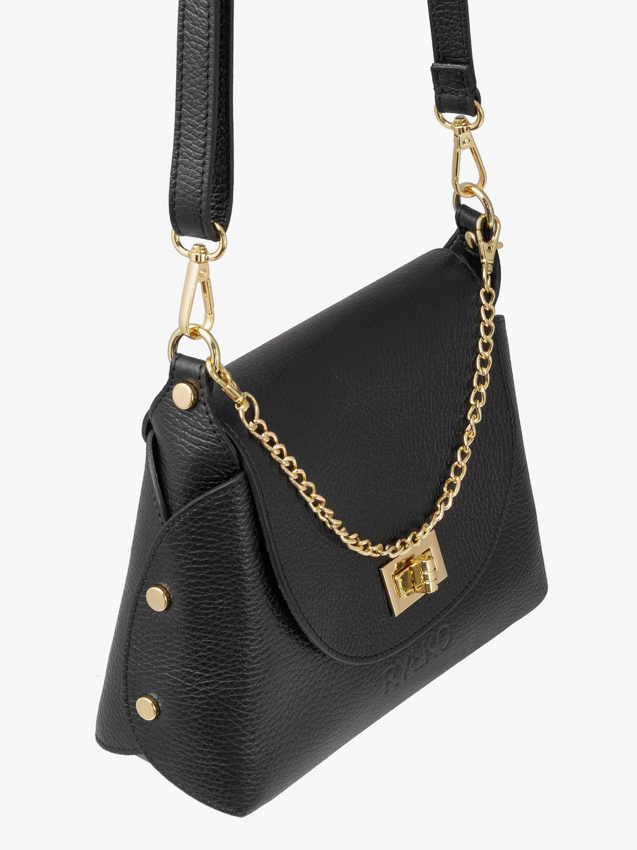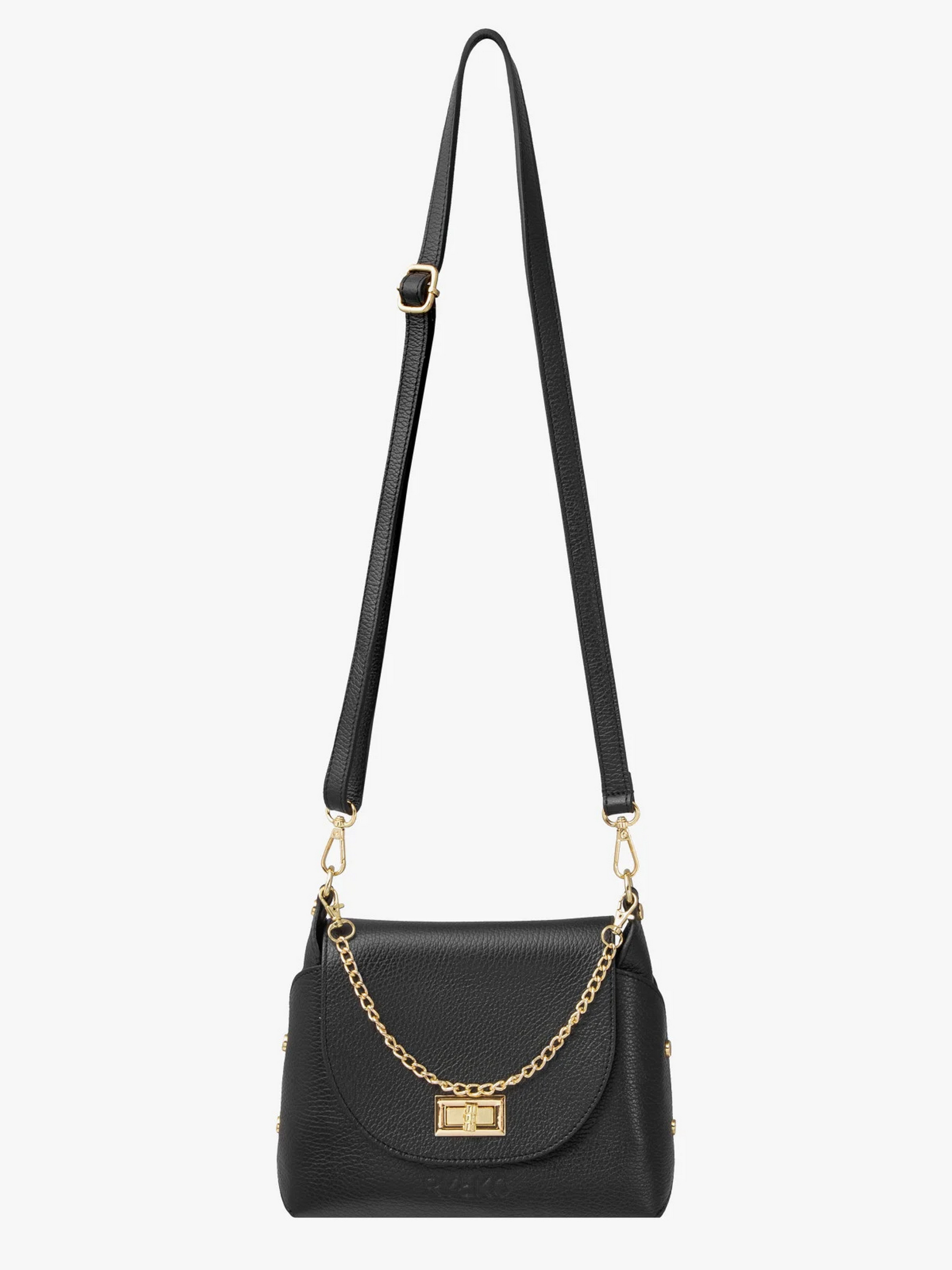 Чорна жіноча сумочка з декоративною пряжкою та елегантним ланцюжком польського виробника RYŁKO. Модель маленького розміру, виготовлена з натуральної шкіри преміум якості. Застібка - поворотна пряжка. Виріб має 1 відділення, оснащений регульованим шкіряним ремінцем максимальною довжиною 125 см та декорований фурнітурою золотистого кольору. Розміри: Висота: 18 см Ширина: 22 см Глибина: 8 см