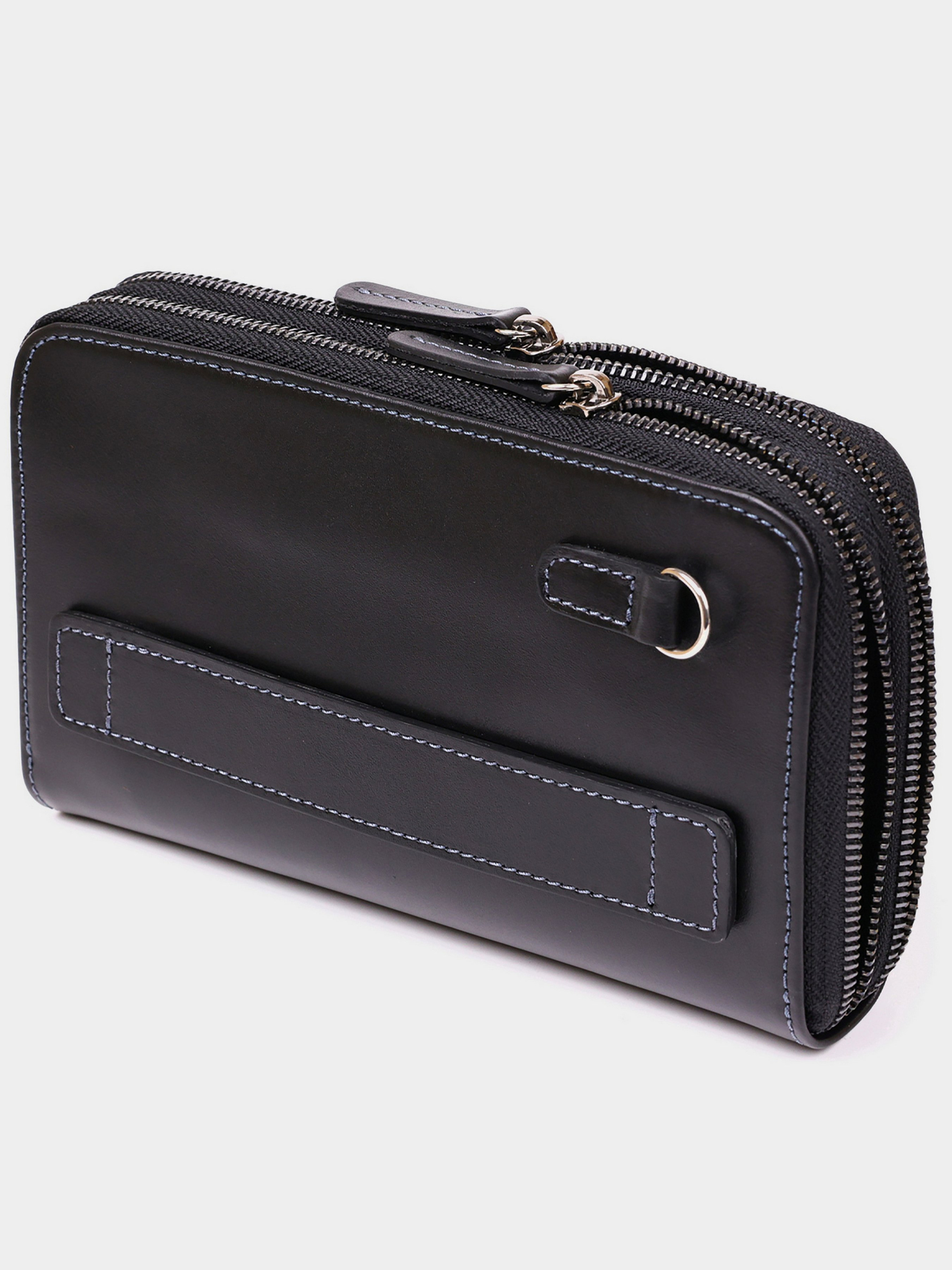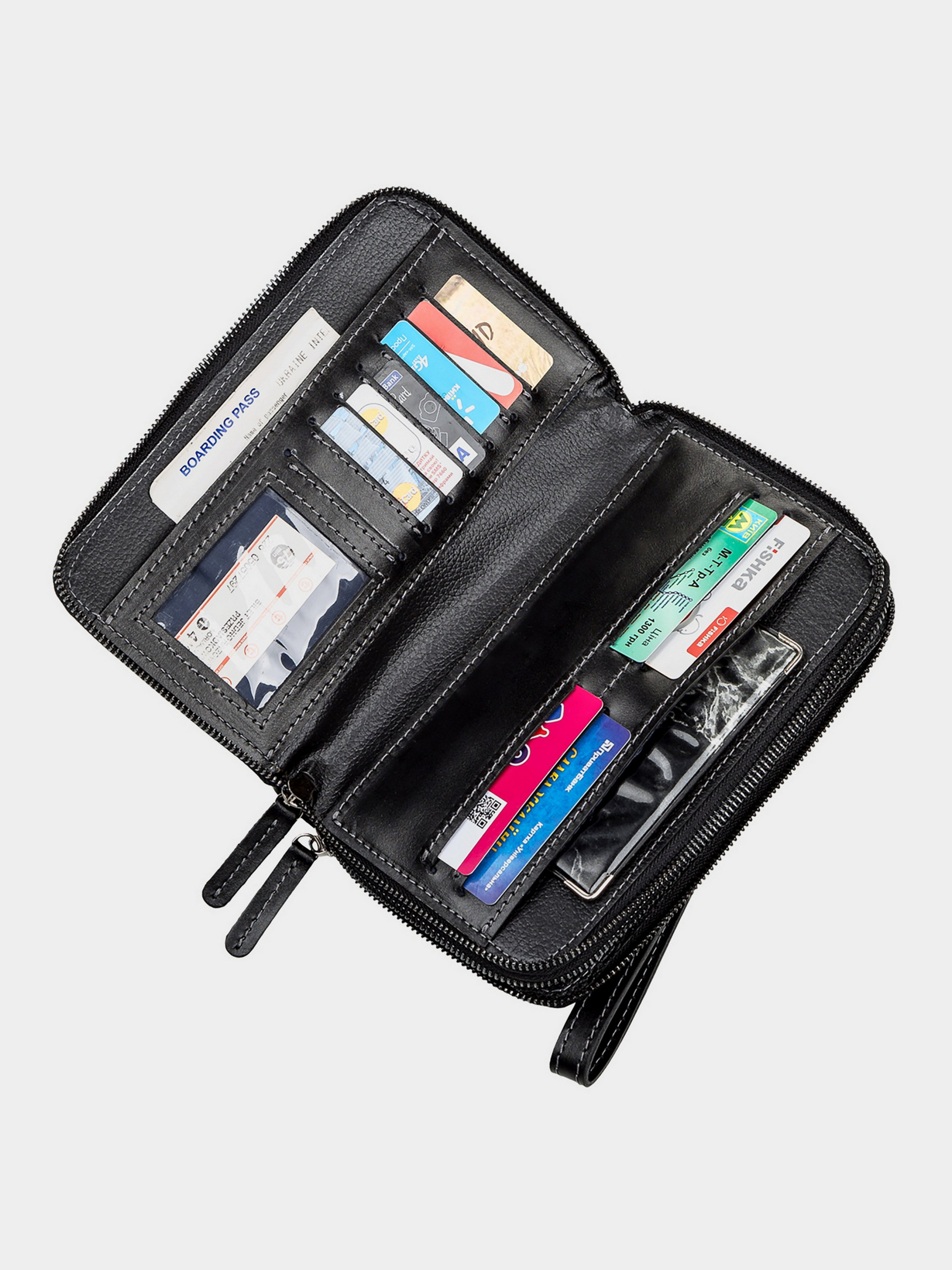 Матеріал: натуральна шкіра; Розміри (ШхВхГ, см): 22х14х4; Колір: чорний; Країна виробник: Україна. Особливості: - два великих автономних відділення на блискавках; - в першому відділенні: два відділи для купюр і дві комірки для кредитних карток; - у другому відділенні: 11 комірок для кредитних карток і дві накладні кишені для мобільного телефону, документів і т.д .; - тримач для клатчу, з зовнішньої сторони; - шкіряна ручка-петля, що знімається; - внутрішнє оздоблення: шкіра; - колір фурнітури: латунь; - аксесуар упакований в пилозахисний чохол. Стильна чоловіча сумка-клатч з натуральної високоякісної гладкої шкіри. Аксесуар невеликий, але дуже місткий. Чудова ідея для подарунку для дорогого і улюбленого чоловіка.