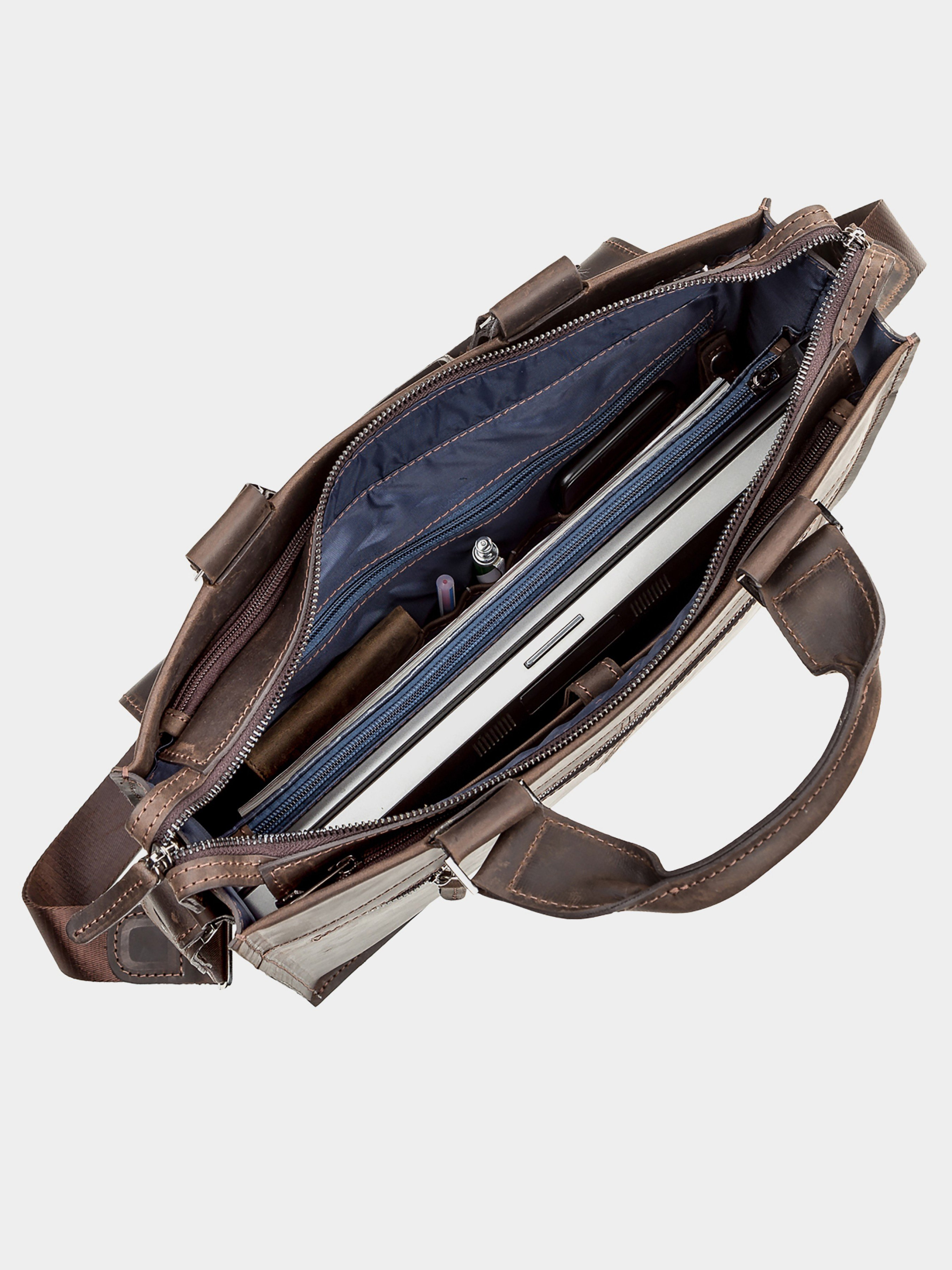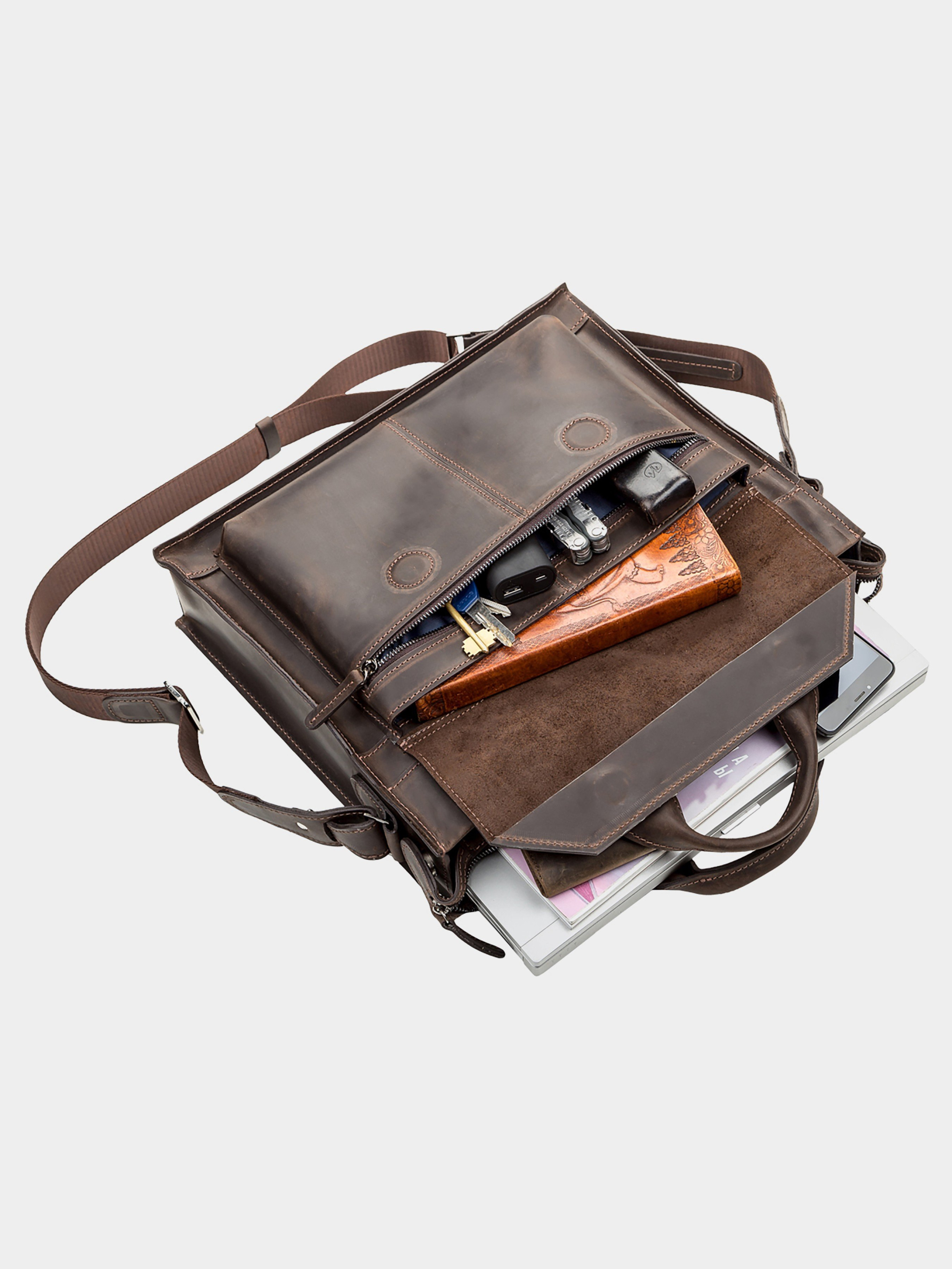 Матеріал: натуральна вінтажна шкіра; Розміри (ШхВхГ, см): 37х31х9.5; Колір: коричневий; Країна виробник: Україна. Відмінна чоловіча сумка-портфель з двома зручними ручками, з натуральної вінтажної шкіри, характерними ознаками якої є: неоднорідність забарвлення і потертості, які надають виробу вишуканого, індивідуального виду. Виріб для повсякденного використання, що дозволяє носити з собою папку з документами, особисті речі. Виріб складається з трьох великих відділів, що закриваються на блискавки. Усередині центрального великого відділу: кишеня-перегородка на блискавці, бічна кишеня на змійці, універсальна кишеня для двох телефонів, дрібниць і ручок, тримач для ключів, ущільнене відділення для планшета, на кнопці. Ззовні велика кишеня з клапаном, всередині якого відділення на блискавці на передній стінці і кишеня на блискавці, на тильній стороні сумки. В наявності плечовий ремінь, що знімається. Колір фурнітури: срібло. Підкладка виконана з міцного матеріалу, стильного синього кольору. Аксесуар упакований в пилозахисний чохол.