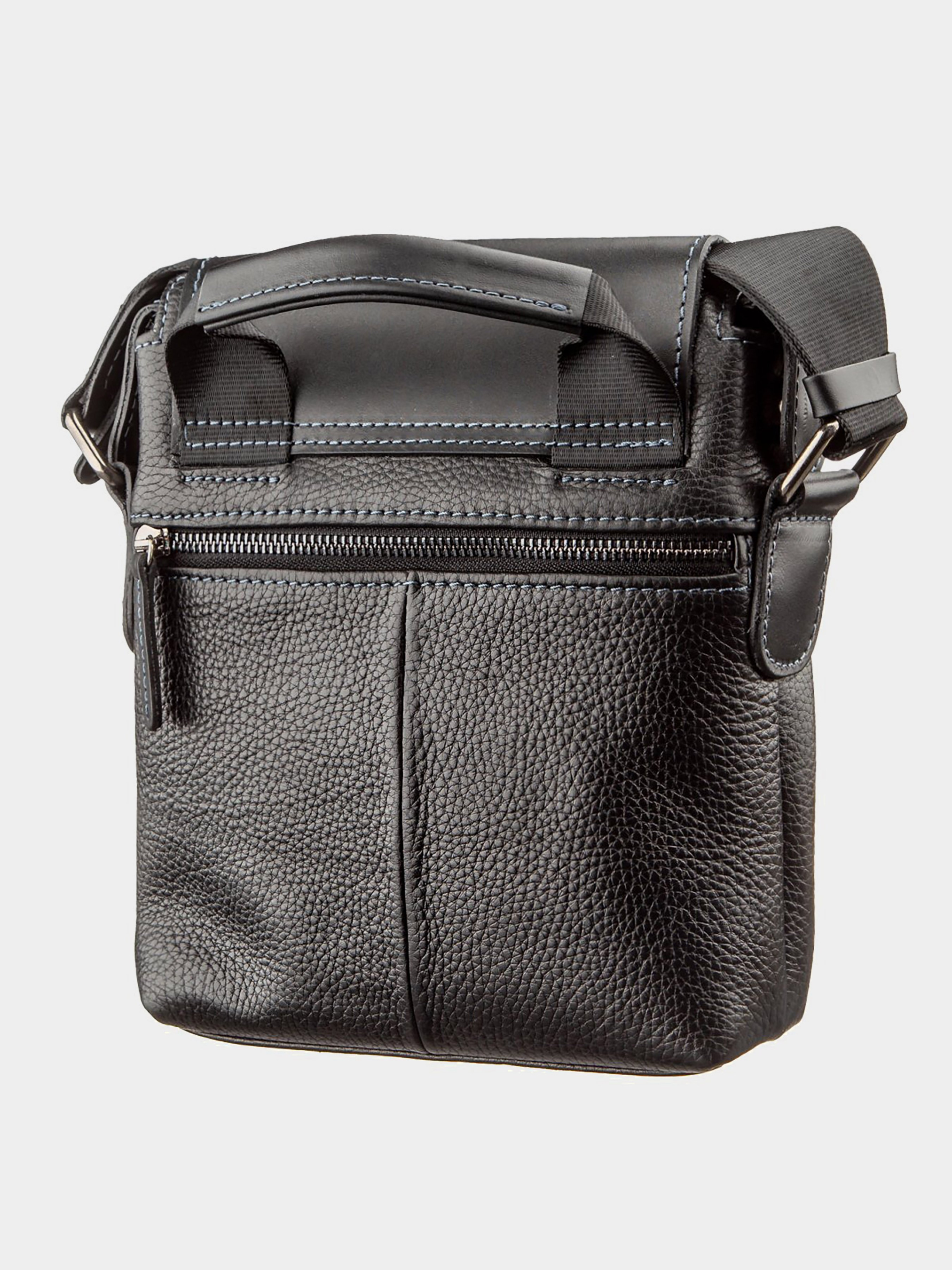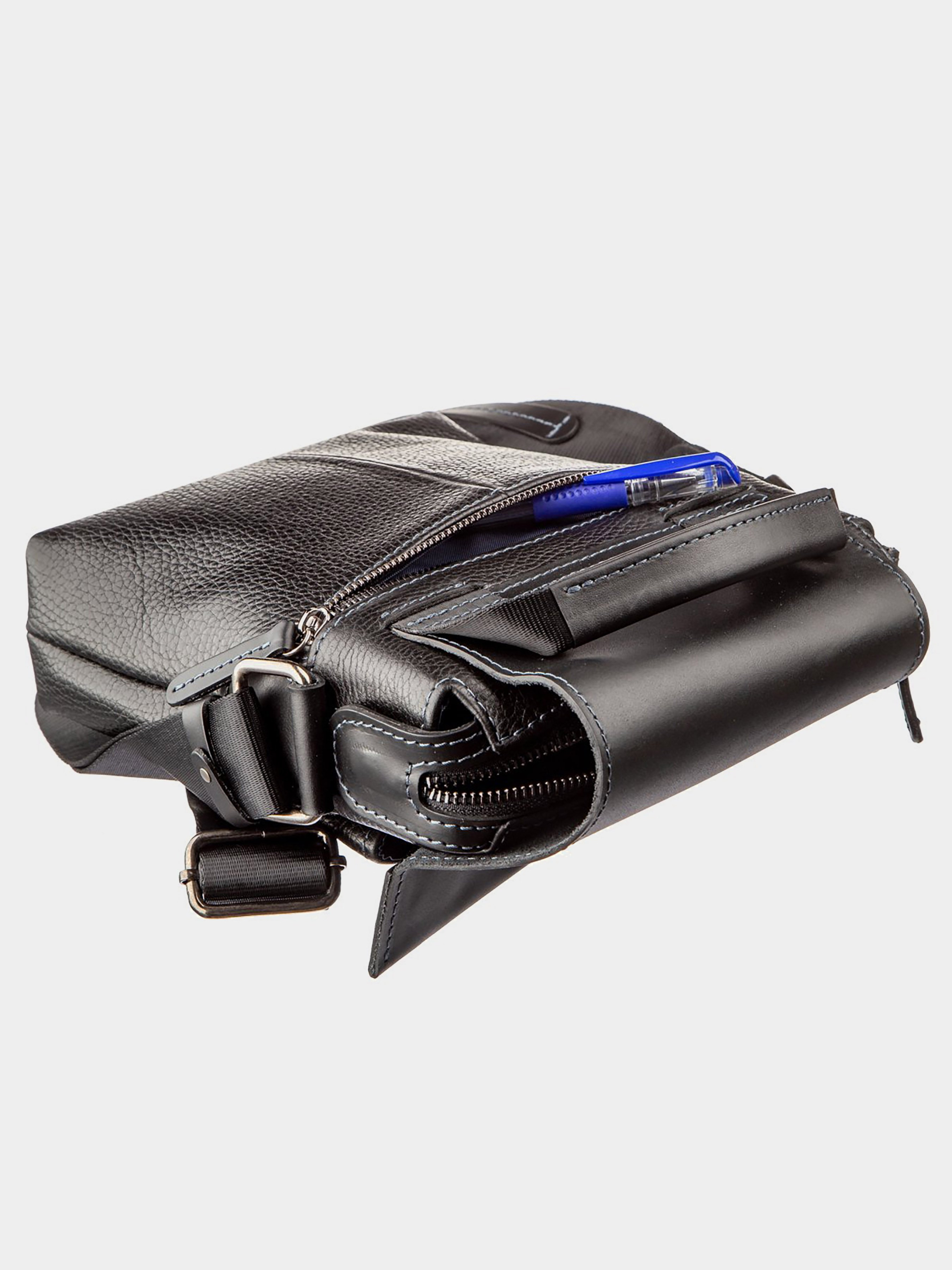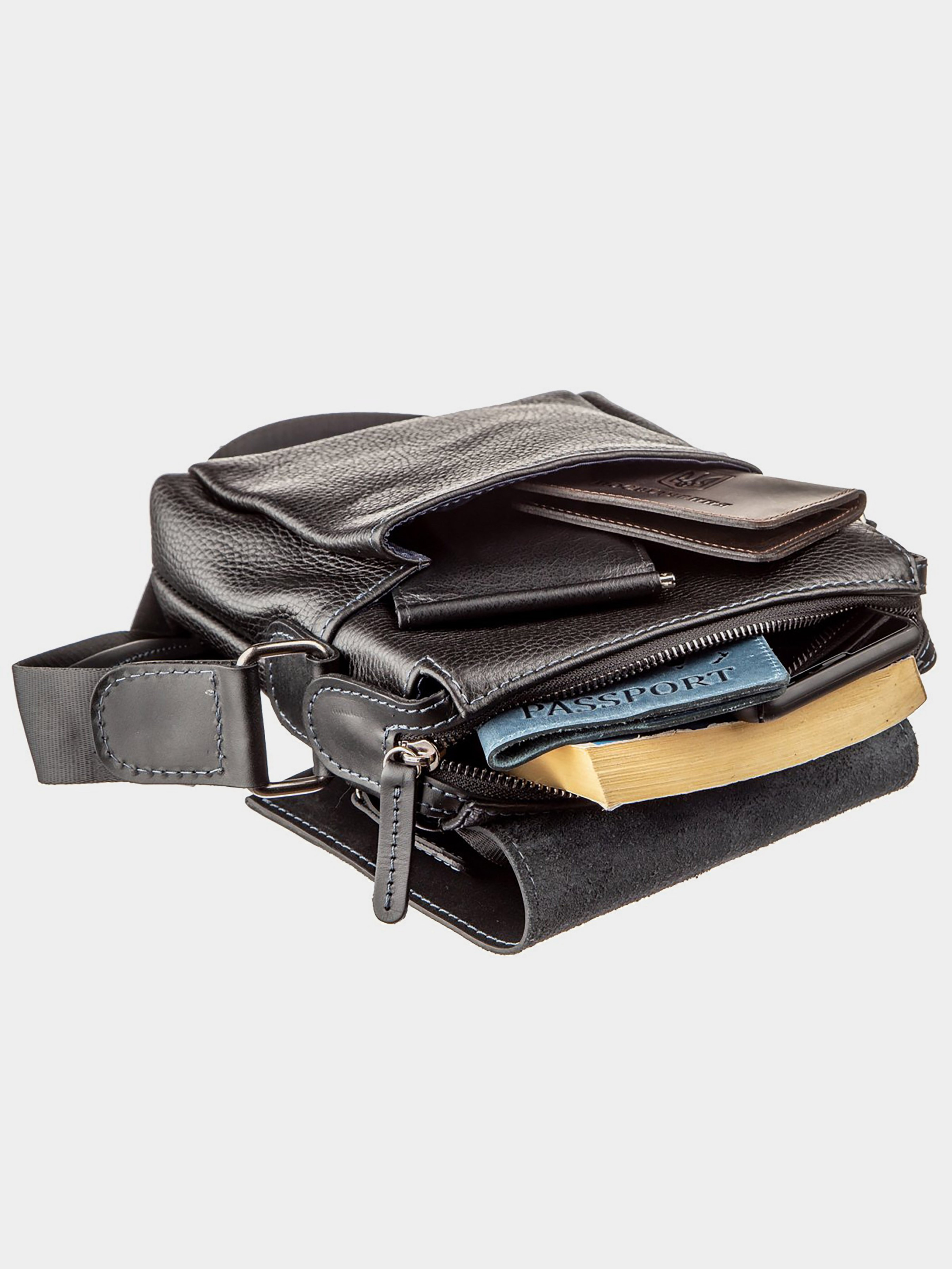 Матеріал: натуральна шкіра; Розміри (ШхВхГ, см): 19х23х6; Колір: чорний; Країна виробник: Україна. Всередині: - 2 відкритих накладних кишені для телефону; - ущільнене відділення з кишенею-перегородкою на змійці; - потайна кишеня на змійці; - незйомний текстильний ремінь; - шкіряна ручка для носіння в руці; - відкрита накладна кишеня під клапаном на зовнішній стороні всередині якої петля для ключів; - кишеня на змійці на зворотній стороні. Оригінальна сумка для самих впевнених в собі чоловіків. Модель виконана в комбінації шкіри флотар і матової. На таку сумку буде складно не звернути увагу. По краях аксесуар прошитий світлою синьою ниткою. Весь функціонал до дрібниць продуманий для сучасних чоловіків, які цінують якість і комфорт. Сумка доповнена ручкою, як на плече, так і в руку, що робить її ще більш зручною. Усередині синій якісний подклад з міцного текстилю. Якщо ви обираєте модель на подарунок невеликого розміру, ми впевнені - вона буде вірним рішенням, а власник такої сумки залишиться задоволений.