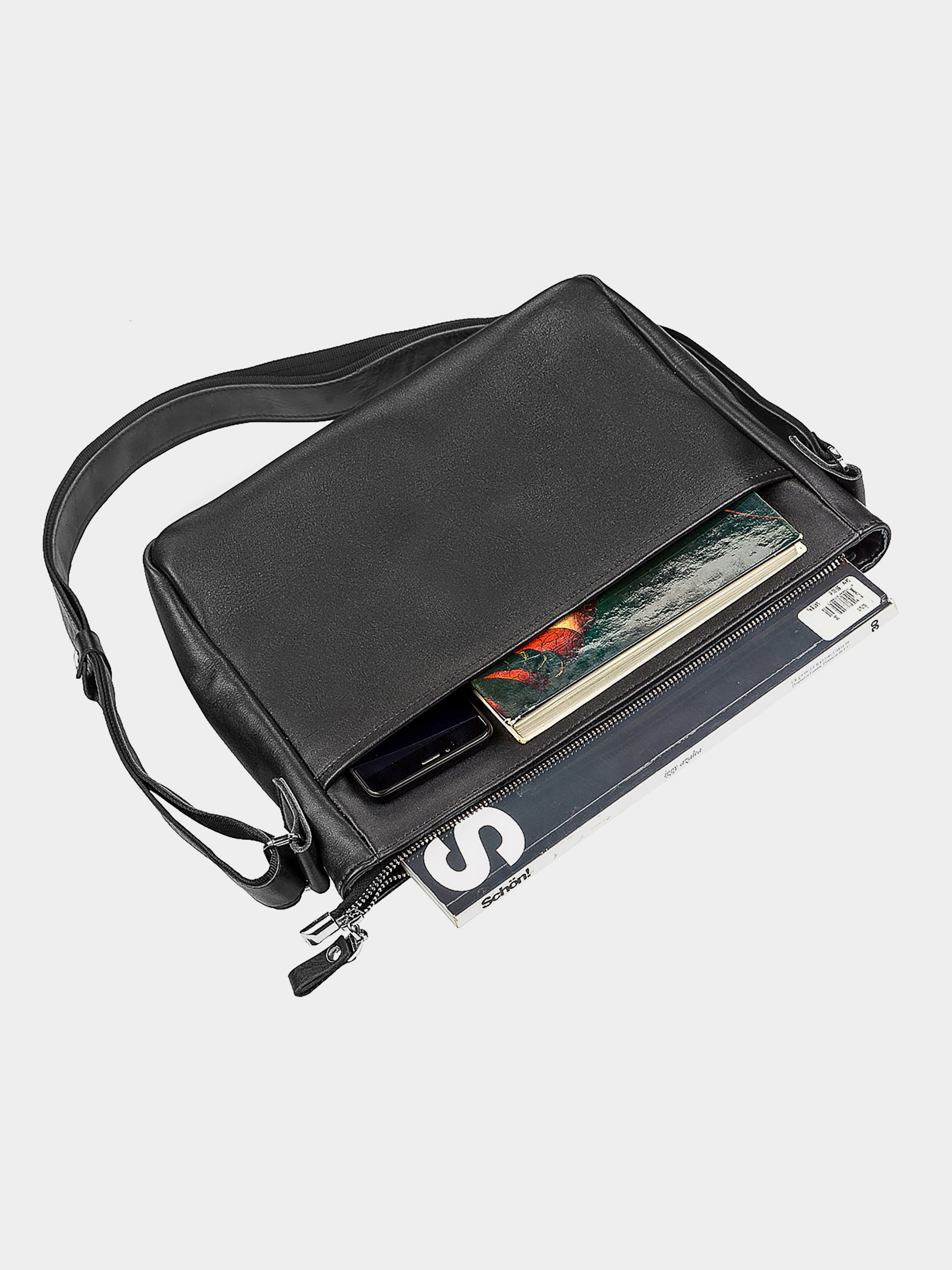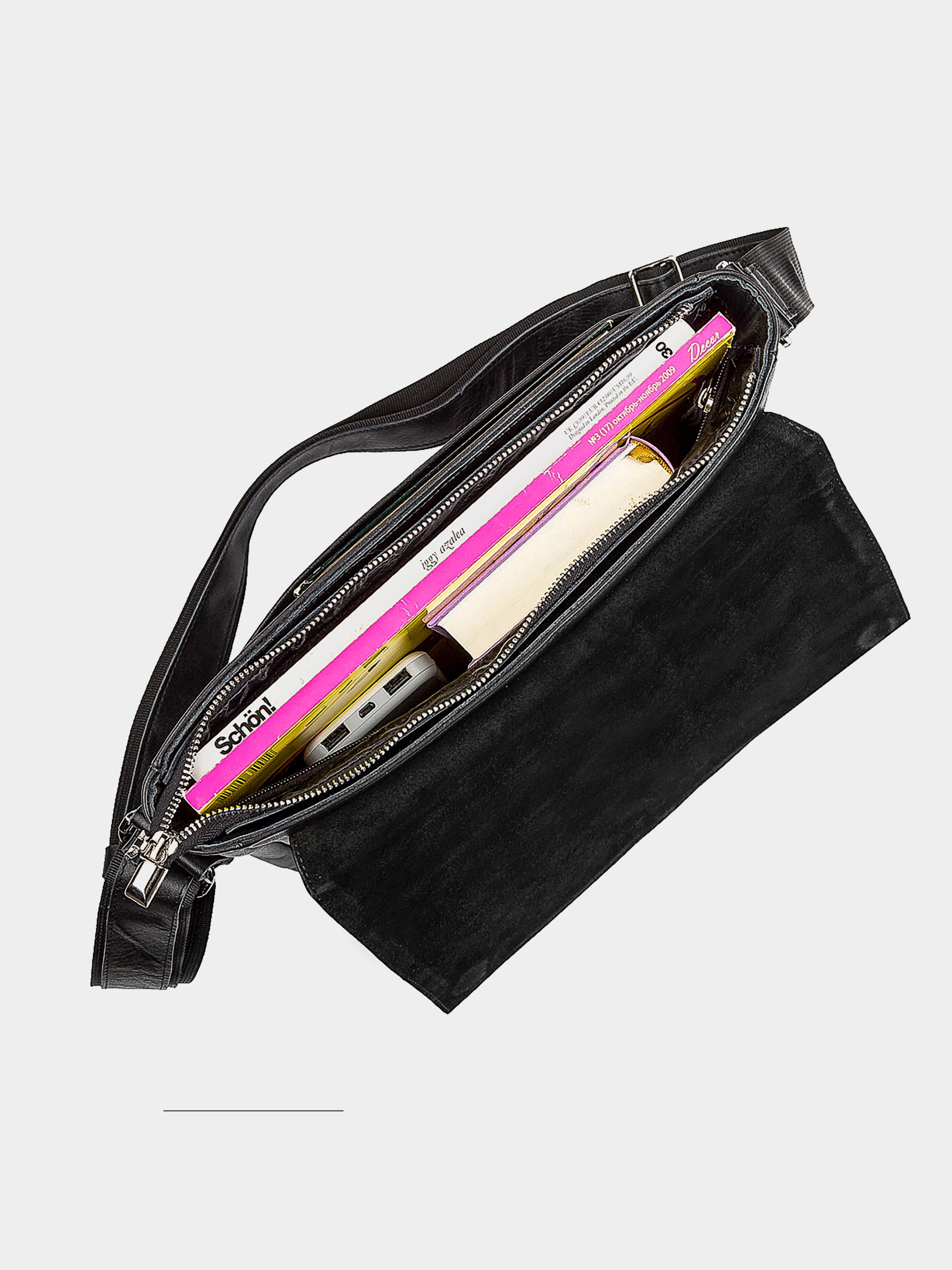 Матеріал: натуральна шкіра високої якості; Колір: чорний; Розміри (ШхВхГ, см): 29х22х8.5; Країна виробництва: Україна. Якщо Ви шукаєте особливу сумку, яка задовольнить Вас за такими параметрами, як - міцність, практичність, місткість, ексклюзивність, універсальність, то ця модель перед Вами. Вона володіє всіма перерахованими вище якостями і стане одним з Ваших улюблених аксесуарів. Особливості: - закривається блискавкою і клапаном з магнітною кнопкою; - одне основне відділення з прорізною кишенею на блискавці і накладною кишенькою; - з передньої сторони під клапаном накладна кишеня; - задня кишеня на блискавці; - текстильний регульований плечовий ремінь; - підкладка з чорної тканини. З цією сумкою Ви можете ходити на роботу, навчання, ділові зустрічі, або ж просто брати на прогулянку. Зручна і легка, ця сумка завжди буде під рукою і практично невагомою у Вас на плечі.