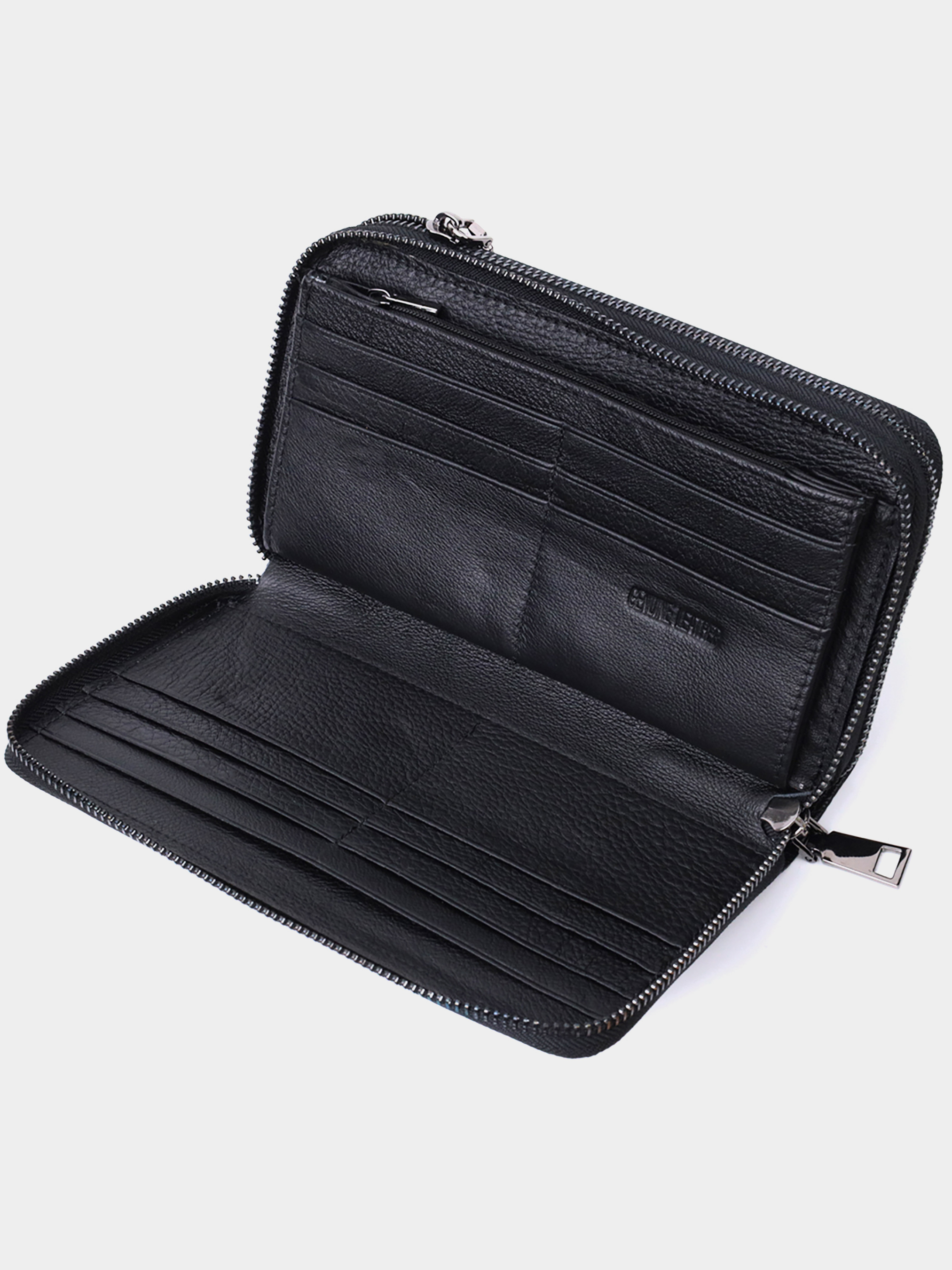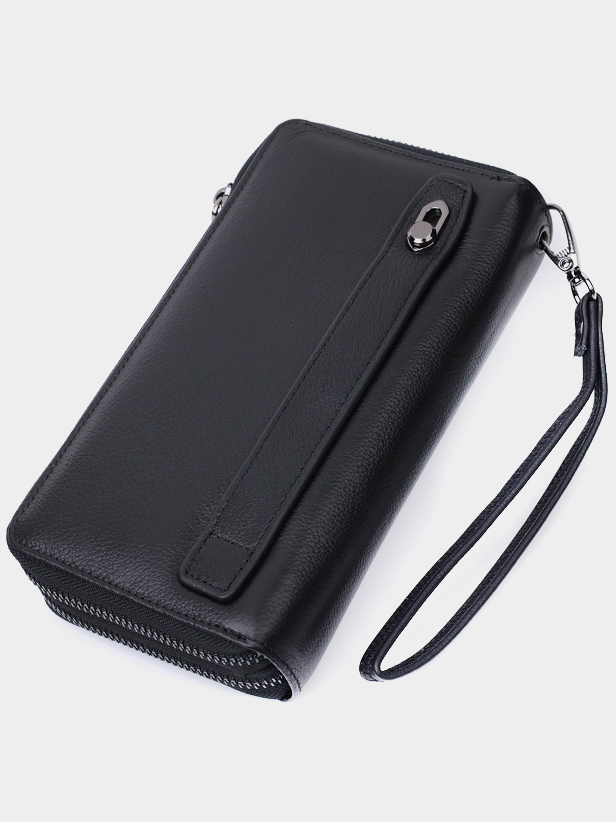 Матеріал: натуральна шкіра; Колір: чорний; Розміри (ШхВхГ): 20х11х4; Країна виробництва: Китай. Опис: - п'ять просторих відділень; - чотири прилеглі кишені; - дві кишені на блискавках; - двадцять чотири слоти для пластикових карток; - зовні на тильній стороні чоловічого клатчу розташована ручка для перенесення в руці; - знімний кистьовий ремінь із натуральної шкіри; - закривається на блискавки. Просторий чоловічий клатч на два автономні відділення з високоякісної шкіри чорного кольору для впевненого у собі ділового чоловіка. Має все необхідне, щоб стати Вам незамінним аксесуаром у повсякденному рутинному житті. Ви легко помістите в нього паперові купюри, телефон, монети, документи і картки. Цей клатч можна носити як у сумці чи портфелі, чи просто як самостійний аксесуар на зап'ястя за допомогою кистьового ремінця, чи просто в руці за допомогою ручки, яка знаходиться на тильній стороні. На лицьовій стороні, вгорі посередині, розташоване тиснення з логотипом виробника, що є запорукою якості виробу. Запакований аксесуар у білу щільну картонну коробку з фірмовим логотипом. Якщо Ви вирішите такий аксесуар подарувати близькій людині, то Вам гарантовано будуть дуже вдячні.