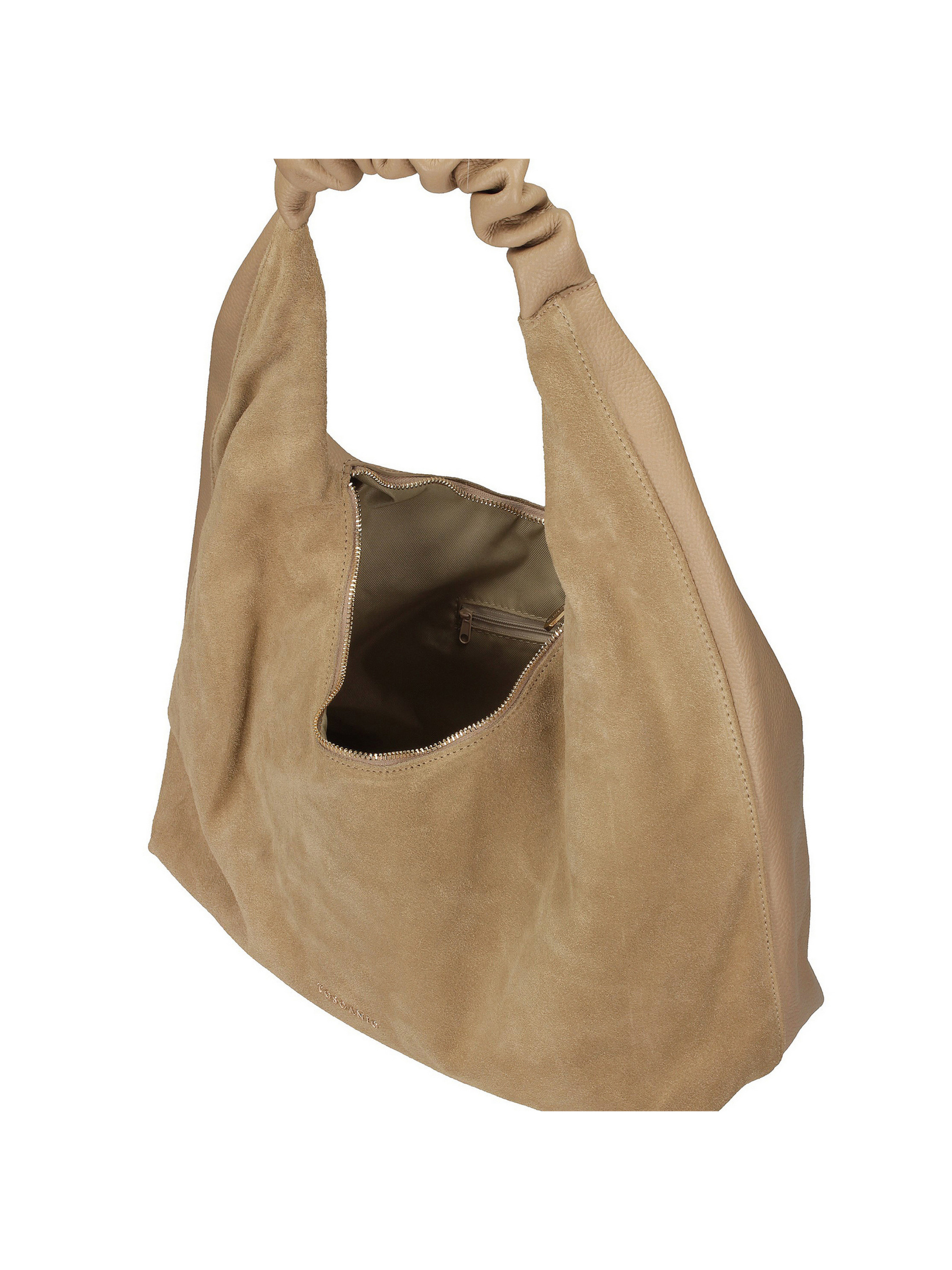 Бежева сумка-хобо італійського бренду Toscanio — елегантна модель з мінімалістичним, сучасним дизайном. Передня частина виготовлена з м’якої натуральної замші ніжного бежевого відтінку, що надає сумці легкості та вишуканості, а решта сумки виготовлена з цільнозернової натуральної шкіри, що забезпечує їй довговічність та практичність. Ця модель має одне основне відділення, що закривається міцною металевою блискавкою золотистого кольору. Внутрішня тканинна підкладка пропонує практичне місце для щоденних речей, зберігаючи при цьому чистий та функціональний дизайн. Сумка не вміщує файли формату А4, що робить її елегантною та пропорційною. Делікатно рифлена ручка надає моделі м’якого та витонченого динамічного відчуття, підкреслюючи її жіночний характер. Це ідеальний варіант для жінок, які цінують яскраві, універсальні аксесуари в мінімалістичному, але елегантному і сучасному дизайні. ВИСОТА 22 см ШИРИНА 50 см ГЛИБИНА 14 см