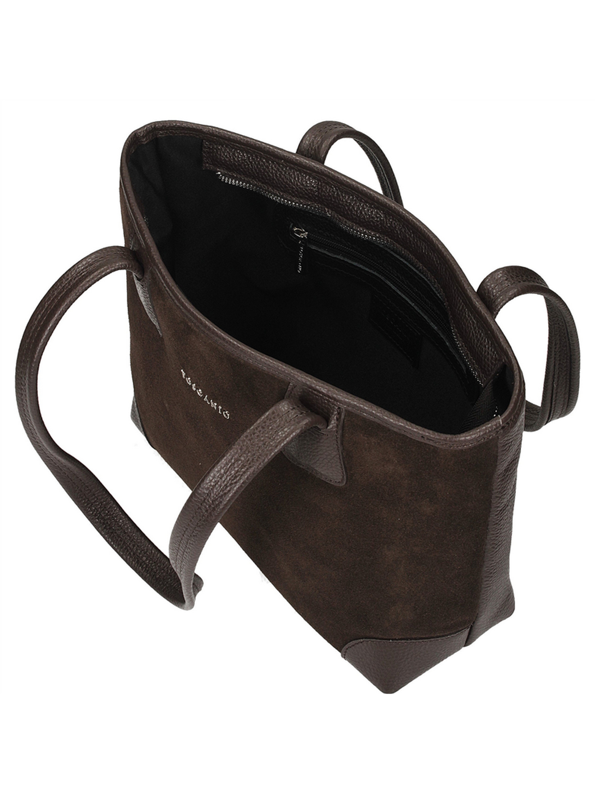 Елегантна, класична сумка італійського бренду Toscanio темно-коричневого кольору – це поєднання класичного стилю та повсякденної практичності. Виготовлена з високоякісної замші, вона вражає своєю ніжною текстурою та елегантним відтінком, ідеально доповнюючи осінні та зимові образи. Ця модель має одне відділення, що застібається на сріблясту металеву блискавку, та внутрішню кишеню, ідеальну для дрібних аксесуарів. Тканинна підкладка захищає внутрішню частину сумки, а шкіряні ручки довжиною 60 см забезпечують зручне носіння на плечі. З розмірами 21 × 27 × 10 см, сумка Toscanio ідеально підходить для щоденного використання – вона поєднує елегантність з функціональністю, створюючи стильний аксесуар, який підкреслить будь-який жіночний стиль.