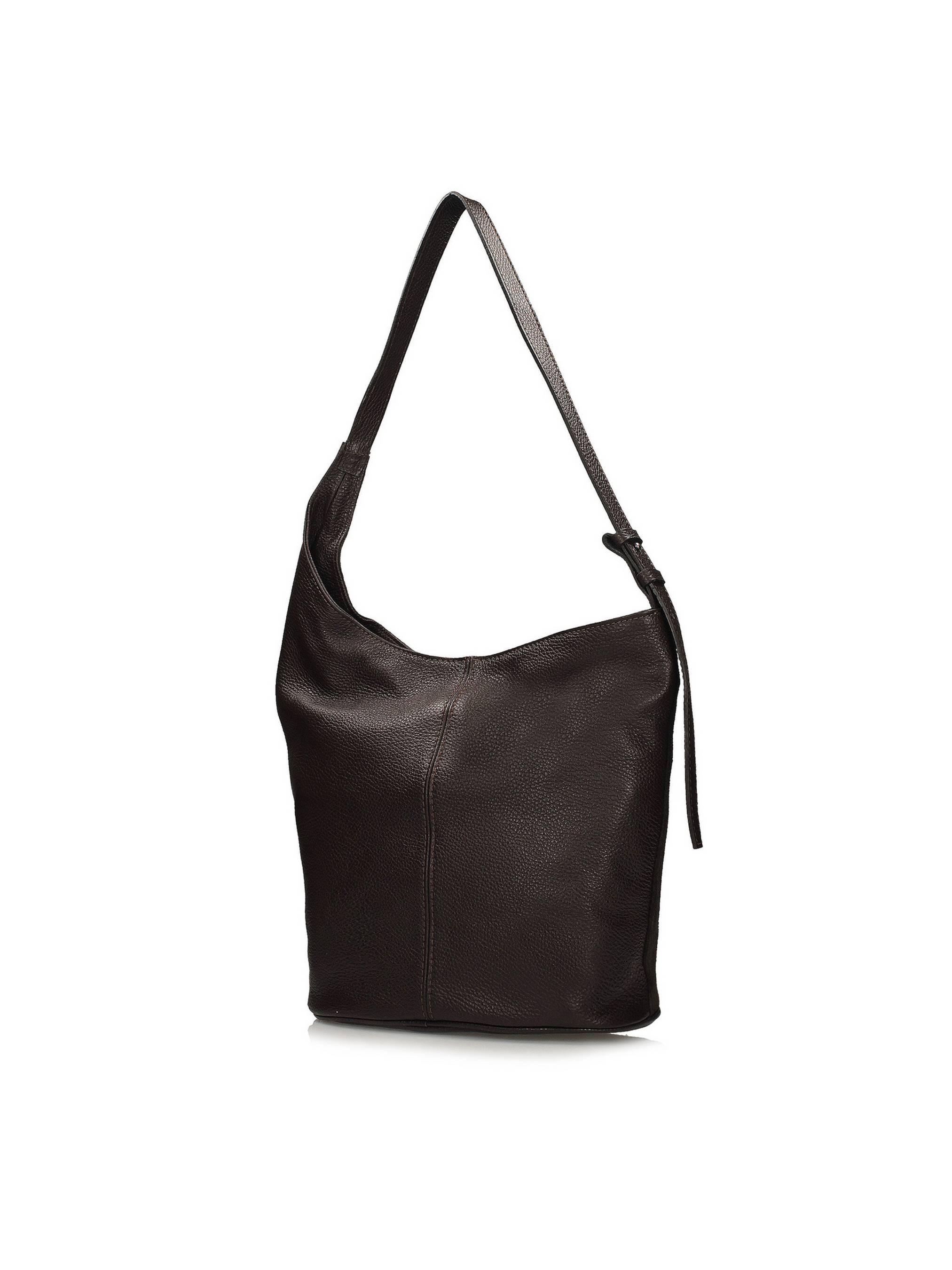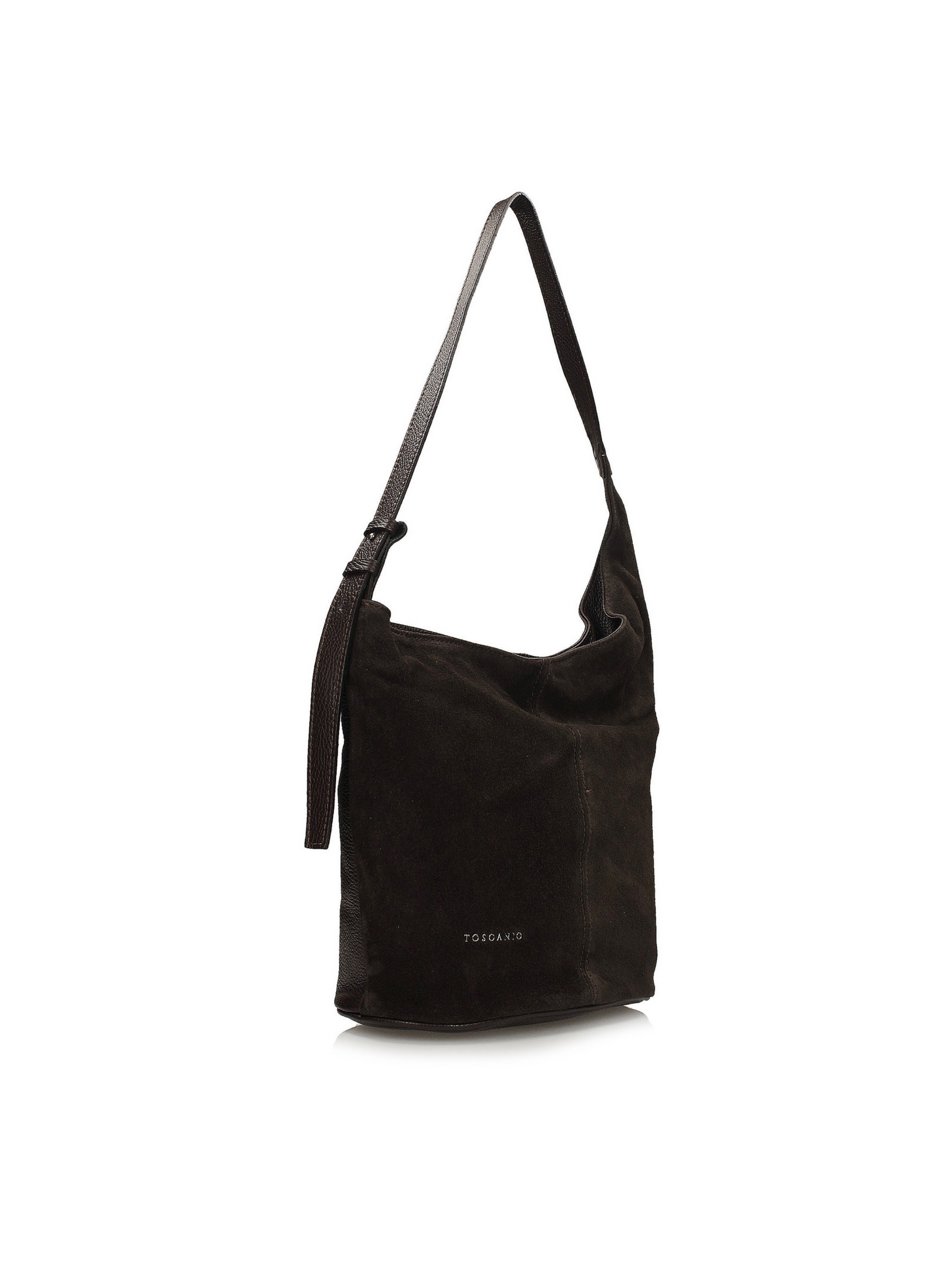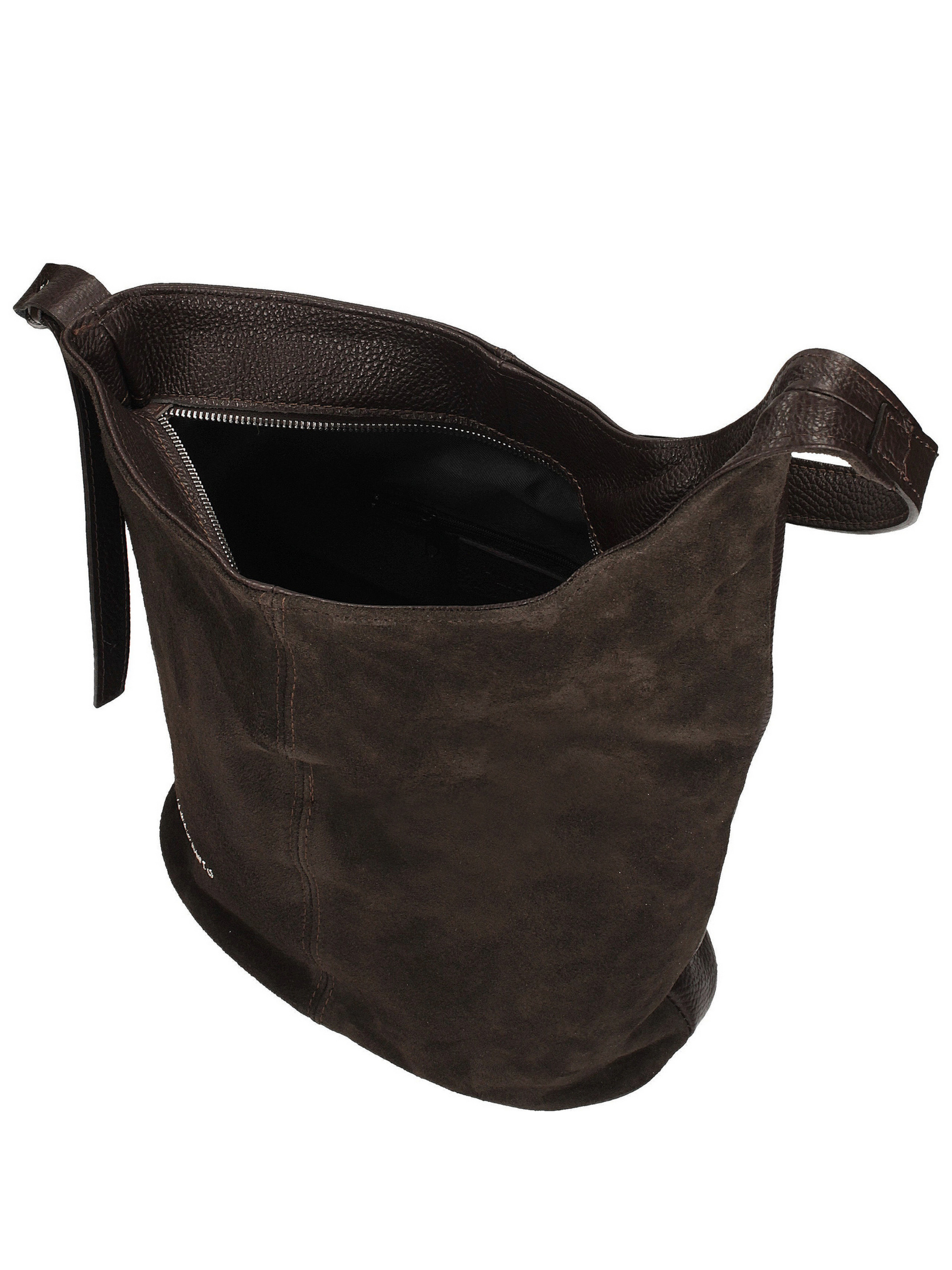 Елегантна сумка-відро італійського виробника Toscanio насиченого темно-коричневого кольору поєднує класичну форму з тонким відтінком сучасності. Її передня частина виготовлена з м'якої натуральної замші преміум якості, що надає сумці виняткової глибини та вишуканого вигляду, а решта — з цільнозернистої високоякісної натуральної шкіри, що забезпечує її елегантність та довговічність. Циліндрична форма надає сумці легкого та стильного вигляду, водночас залишаючись зручною для щоденного використання. Сумка має одне основне відділення на блискавці, а всередині є практична тканинна кишеня для зберігання необхідних речей. Ручка довжиною 70 см забезпечує комфортне носіння, як на плечі, так і в руці. Сріблясті металеві елементи підкреслюють елегантний характер моделі та делікатно контрастують із теплим відтінком коричневого. Сумка не вміщує формат А4, але з розмірами 30 x 35 x 15 см вона залишається достатньо місткою для щоденних речей першої необхідності.