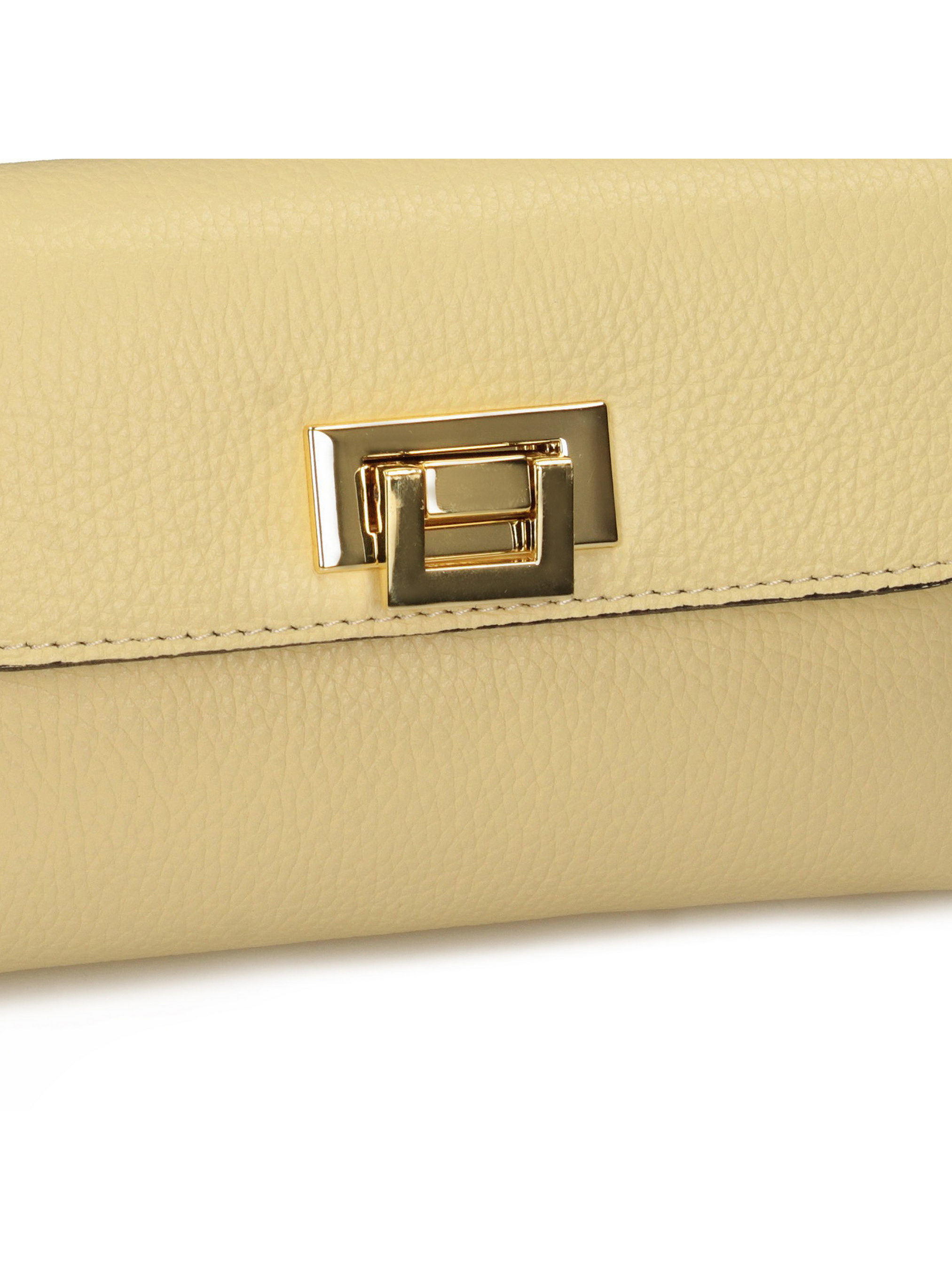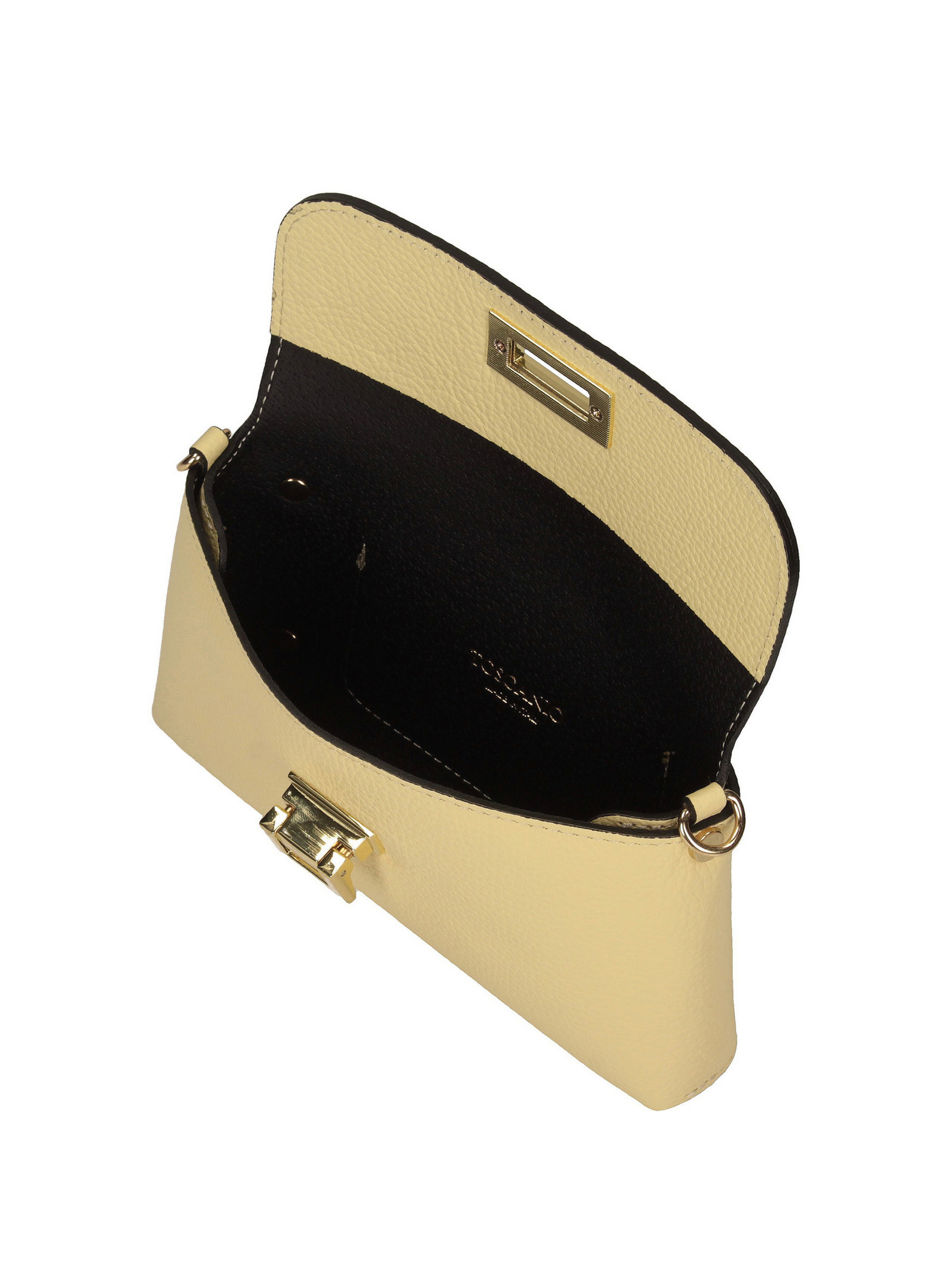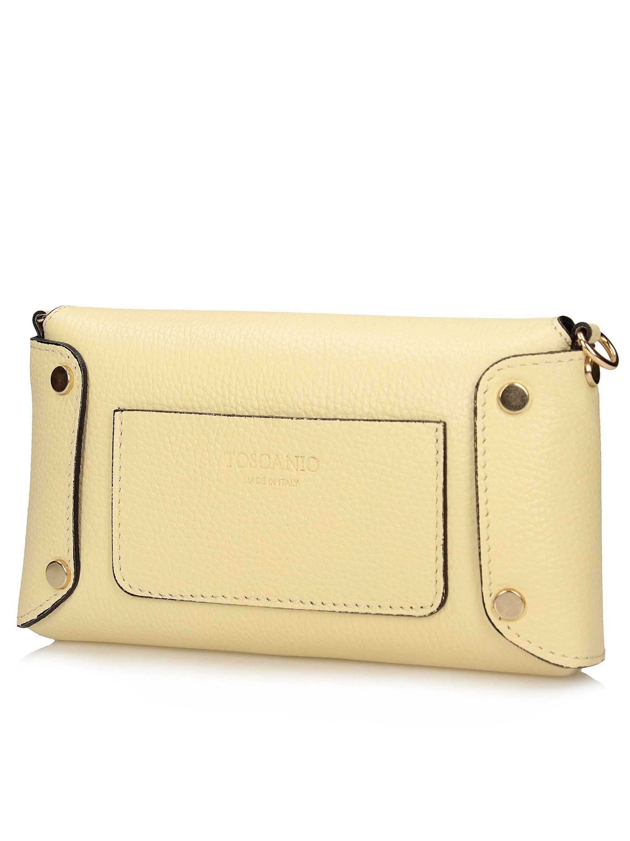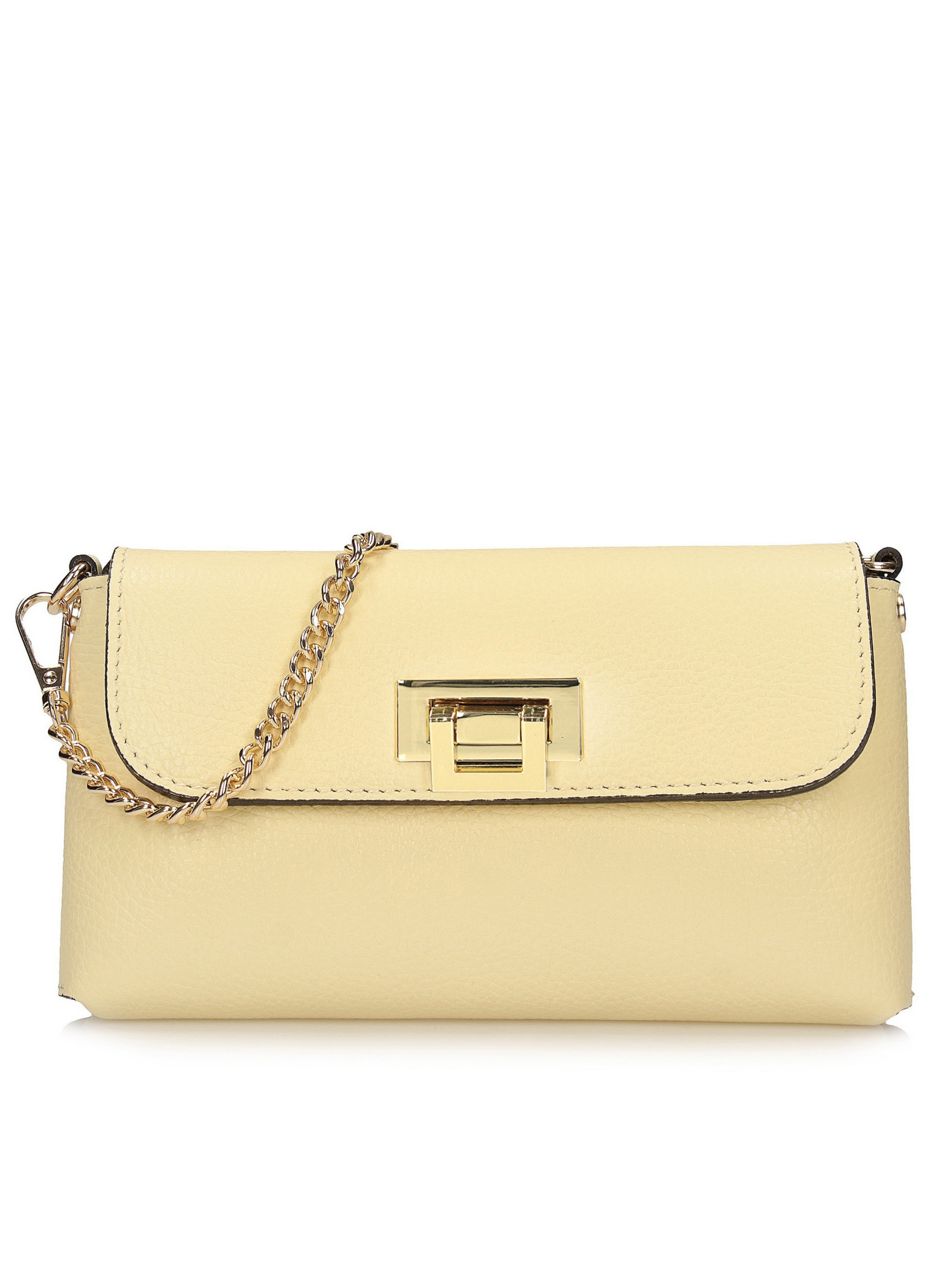 Цей світло-жовтий клатч італійського бренду Toscanio — елегантна модель, виготовлена з високоякісної натуральної шкіри, ідеально підходить для офіційних випадків, вечірок або вечірніх виходів. Ніжний, світлий відтінок жовтого кольору надає сумці витонченого, але елегантного характеру, що робить її ідеальним доповненням до багатьох образів. Модель застібається на металеву застібку золотистого кольору, що додає стильного завершального штриха та підкреслює елегантний вигляд сумки. Внутрішня частина, оброблена натуральною шкірою, має одне відділення для зручного зберігання необхідних речей. Клатч має витончений ланцюжок довжиною 120 см, що дозволяє носити його на плечі або через плече. Його розміри 21x12x4 см роблять його компактним, водночас забезпечуючи достатньо місця для таких необхідних речей, як телефон або невеликий гаманець.