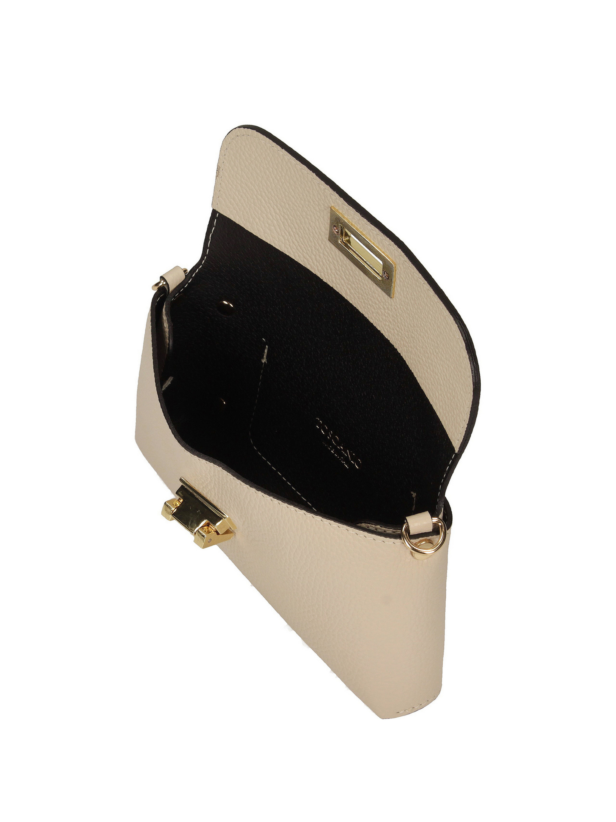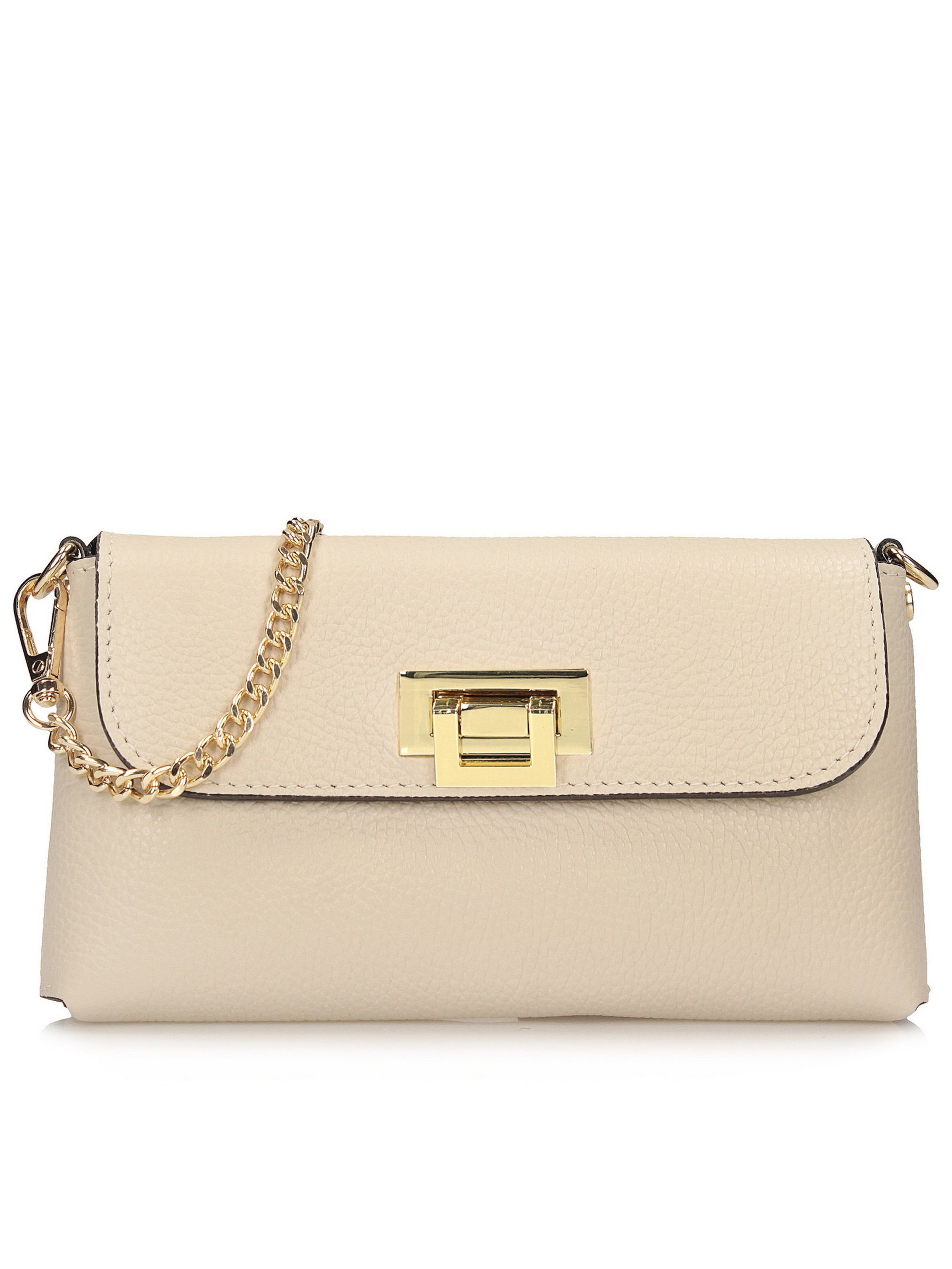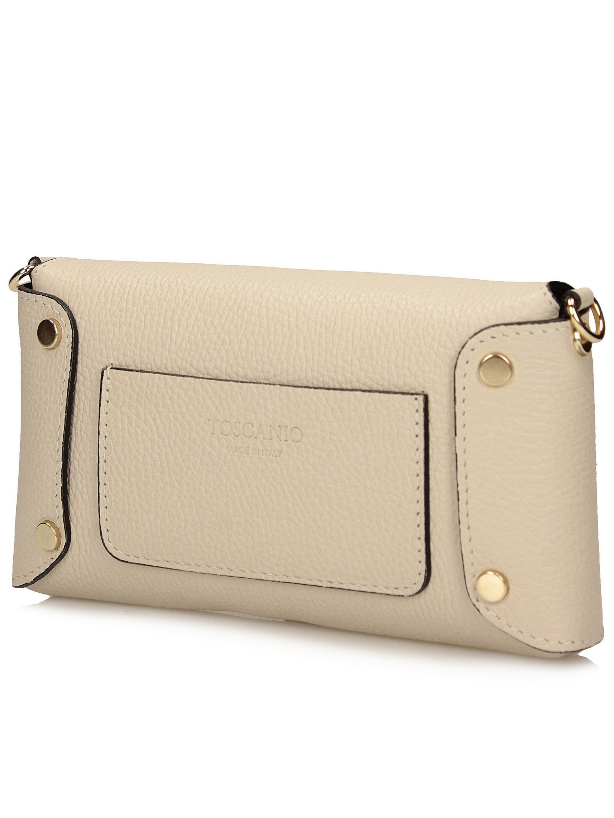 Цей кремовий клатч італійського бренду Toscanio — елегантна модель, виготовлена з високоякісної натуральної шкіри, ідеально підходить для офіційних випадків, вечірок або вечірніх виходів. Світлий кремовий колір надає сумці витонченого, але елегантного характеру, що робить її ідеальним доповненням до багатьох образів. Модель застібається на металеву застібку золотистого кольору, що додає стильного завершального штриха та підкреслює елегантний вигляд сумки. Внутрішня частина, оброблена натуральною шкірою, має одне відділення для зручного зберігання необхідних речей. Клатч має витончений ланцюжок довжиною 120 см, що дозволяє носити його на плечі або через плече. Його розміри 21x12x4 см роблять його компактним, водночас забезпечуючи достатньо місця для таких необхідних речей, як телефон або невеликий гаманець.