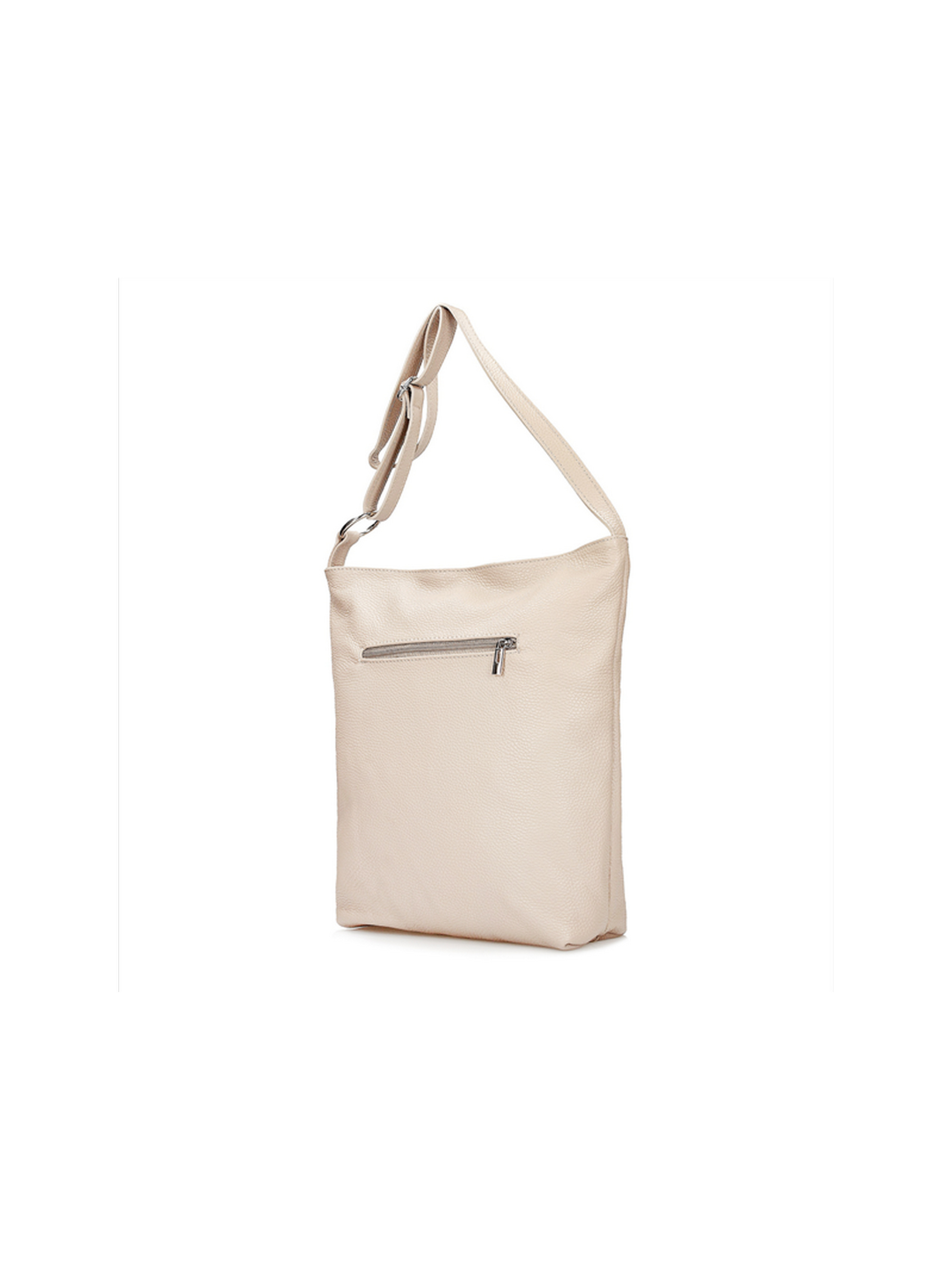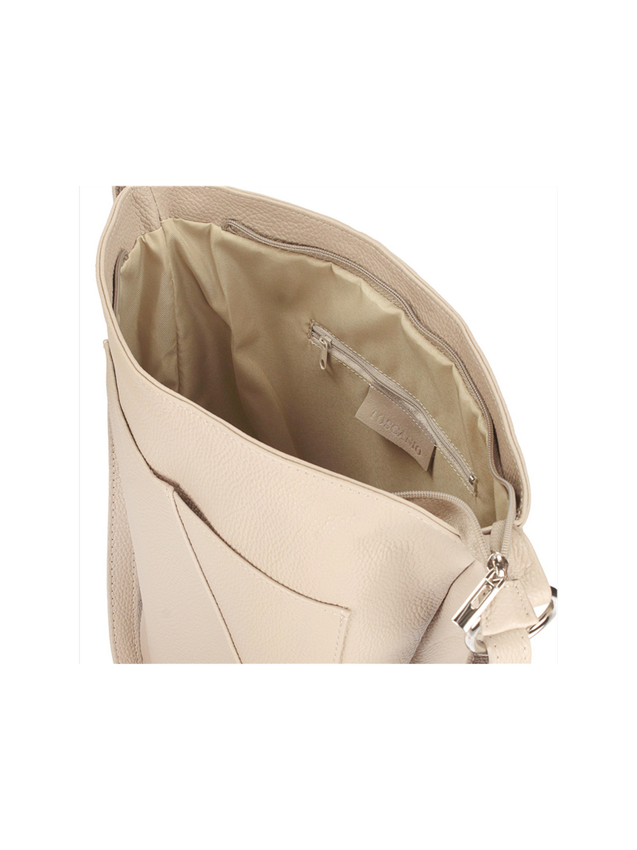 Шкіряна сумка італійського виробника TOSCANIO кремового кольору. Виконана із натуральної шкіри високої якості. Сумка великого розміру (вміщує формат А4). Виріб має 1 велике відділення з внутрішніми кишенями. Зовні велика і відкрита, але глибока кишеня з лицьової сторони та кишеня на блискавці з тильної сторони. Внутрішній матеріал – текстиль. Застібка – блискавка. Ручки немає, є регульований плечовий ремінець максимальною довжиною 115 см. Щоб уникнути помилок у своєму виборі, при замовленні обов'язково звертайте увагу на розмір виробу: Висота – 35 см, Ширина - 26 см, Глибина – 10 див.