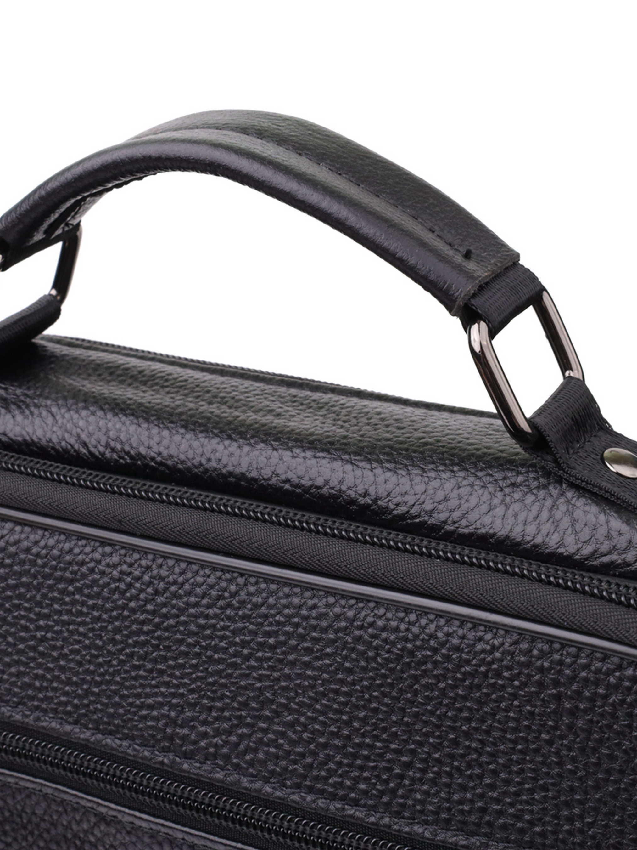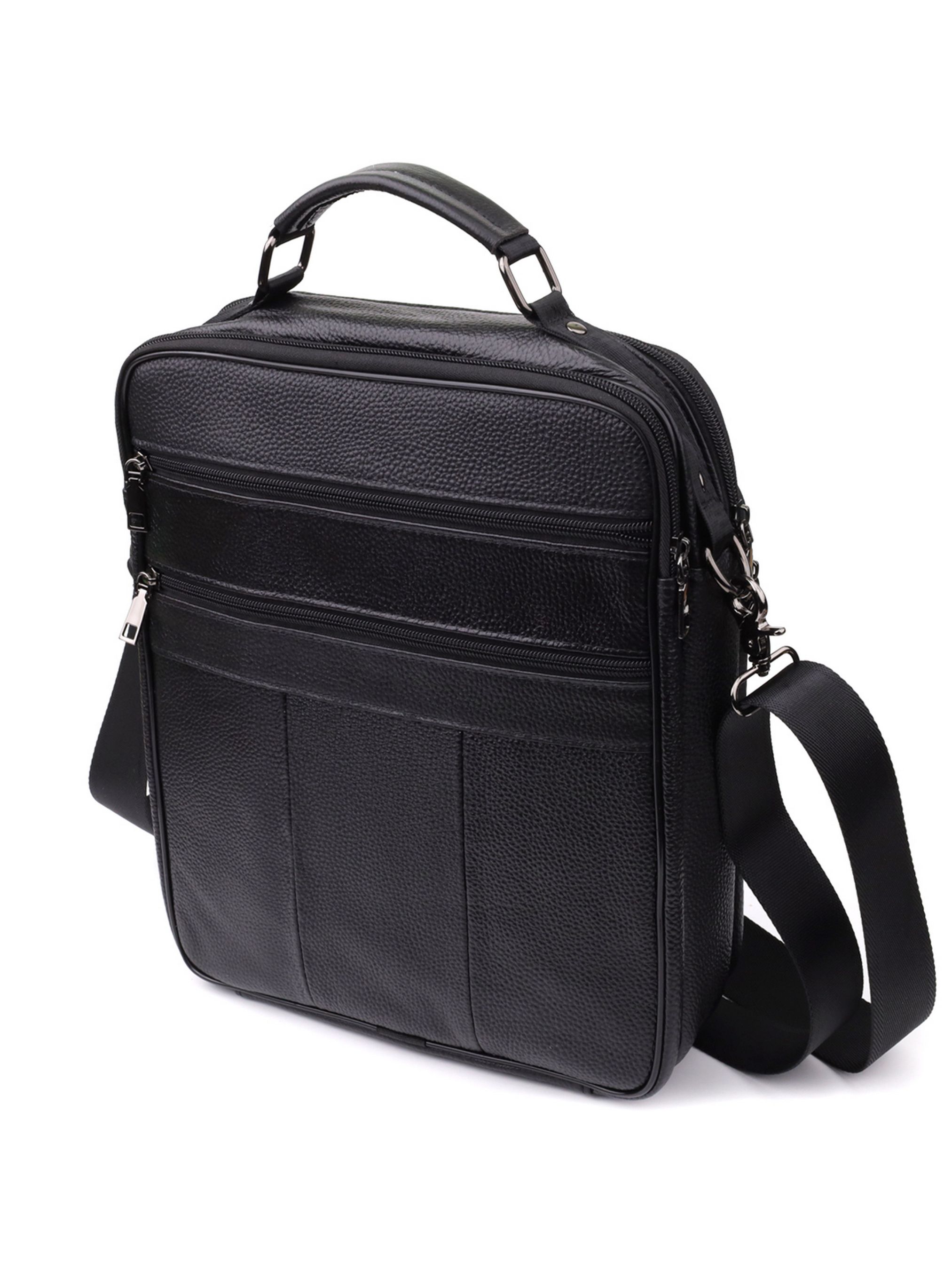 Колір: чорний; Матеріал: натуральна шкіра високої якості; Розмір (ШхВхГ, см): 27х33х9, 5 см; Країна виробник: Китай. Бренд: Vintage. Особливості: - два основні відділення на блискавці; - потайна кишеня на блискавці на задній стінці в одному відділенні; На лицьовій стороні: - накладна кишенька на блискавці та клапані на магнітах; - одна горизонтальна вбудована кишеня на блискавці; На тильній стороні: - дві кишені на блискавках; - Колір фурнітури: срібло; - Шкіряна ручка для перенесення в руці; - Знімний регульований текстильний ремінець на плече. Практична шкіряна сумка виконана з високоякісної натуральної шкіри та поєднує в собі функціональність та стиль. Модель оснащена двома основними відділеннями на блискавці, одне з яких включає таємну кишеню на блискавці на задній стінці для надійного зберігання важливих дрібниць. На лицьовій стороні сумки розташована накладна кишенька, яка закривається на блискавку і додатково захищена клапаном на магнітах, а також одна горизонтальна вбудована кишеня на блискавці - зручне рішення для швидкого доступу до необхідних речей. Тильна сторона обладнана двома кишенями на блискавках, що забезпечують додатковий простір для зберігання. Фурнітура виконана в срібному кольорі, що надає аксесуару сучасного та акуратного вигляду. Для зручності перенесення передбачена шкіряна ручка, а також регульований знімний текстильний ремінець, що дозволяє носити сумку на плечі. Ця сумка - ідеальний вибір для тих, хто цінує практичність, якість та лаконічний дизайн в одному аксесуарі.