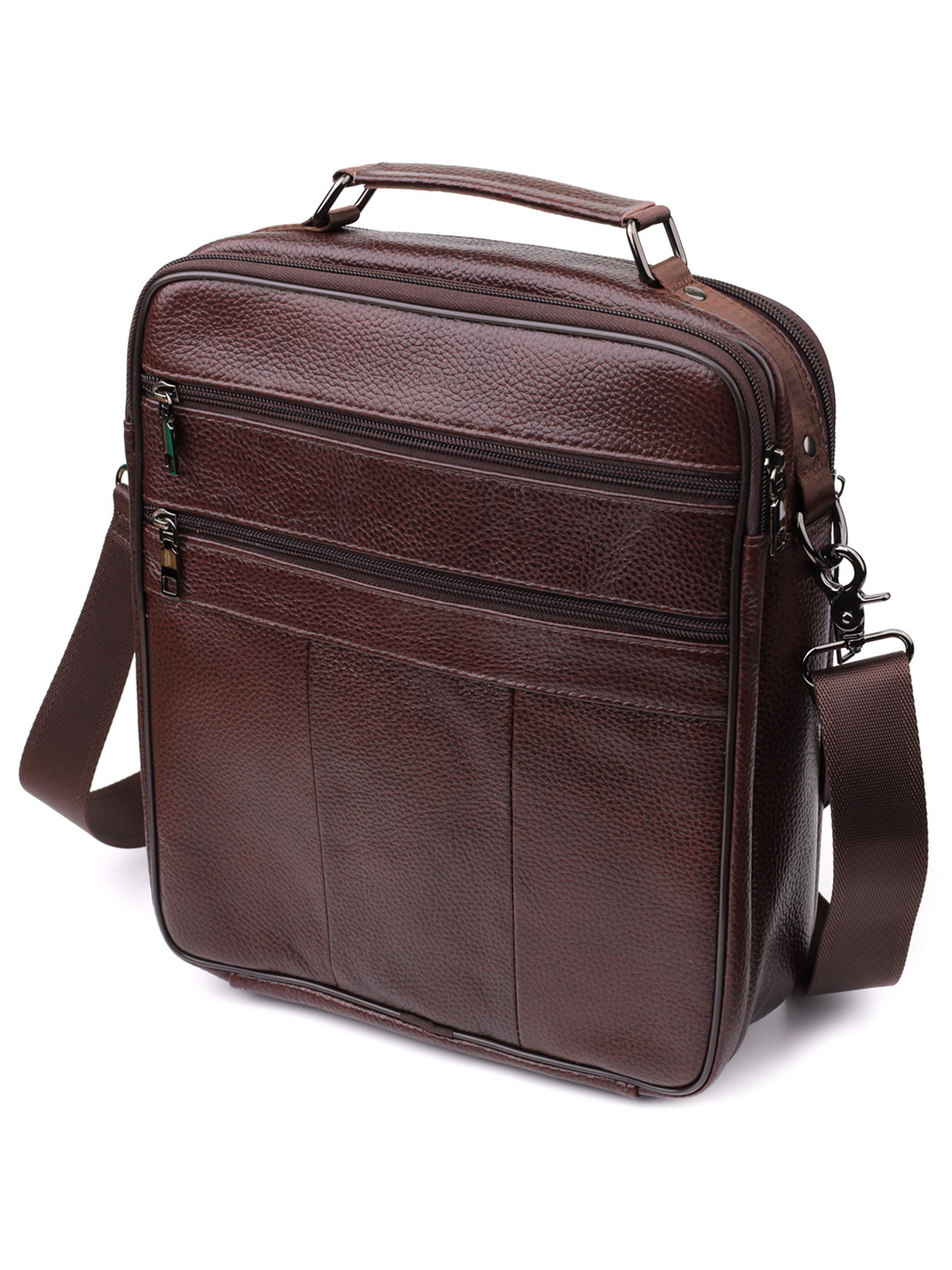Колір: коричневий; Матеріал: натуральна шкіра високої якості; Розмір (ШхВхГ, см): 27х35х9, 5 см; Країна виробник: Китай. Бренд: Vintage. Особливості: - два основні відділення на блискавці; - потайна кишеня на блискавці на задній стінці в одному відділенні; На лицьовій стороні: - накладна кишенька на блискавці; - дві горизонтальні вбудовані кишені на блискавках; На тильній стороні: - дві кишені на блискавках; - колір фурнітури: срібло; - шкіряна ручка для перенесення в руці; - знімний регульований текстильний ремінець на плече. Стильна чоловіча сумка виконана з міцної зернистої шкіри флотар, яка відрізняється вираженою текстурою і високою зносостійкістю. Сумка має два основні відділення на блискавці, що дозволяють зручно організувати вміст. На лицьовій стороні передбачена накладна кишенька на блискавці, а також дві горизонтальні вбудовані кишені на блискавках, що забезпечують швидкий доступ до часто використовуваних речей. На тильній стороні розташовані ще дві зручні кишені на блискавці. Сумка оснащена шкіряною ручкою для перенесення в руці і регульованим знімним текстильним ремінцем, який можна налаштувати по довжині і носити сумку через плече. Функціональна та стильна, ця модель стане чудовим вибором для чоловіків, які цінують практичність та надійність.