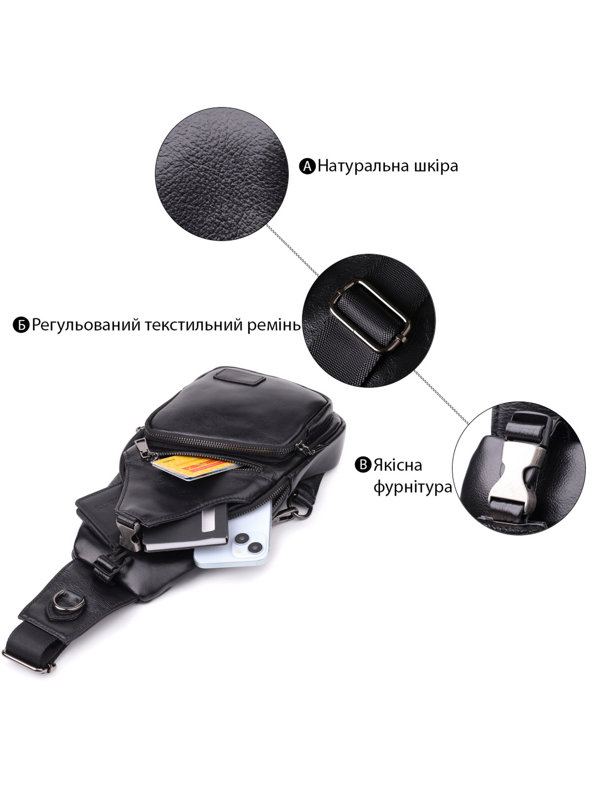 Колір: чорний; Матеріал: натуральна шкіра високої якості; Розмір (ШхВхГ, см): 19х32х8 см; Країна виробник: Китай. Бренд: Vintage. Особливості: - одне основне відділення на блискавці; - дві кишені всередині - одна на блискавці, інша відкритого типу; - накладна кишеня, що закривається на блискавку, на лицьовій стороні; - кишеню на механічній клямці на лицьовій стороні; - вбудована горизонтальна кишеня на блискавці, на лицьовій стороні; - кишеню на блискавці, на тильній стороні; - Колір фурнітури: темне срібло; - Регульований текстильний ремінець на дві сторони. Чорна шкіряна сумка через плече поєднує у собі вишуканий зовнішній вигляд та продуману функціональність. Одне основне відділення на блискавці забезпечує безпеку та зручність зберігання речей. Усередині розташовані дві кишені одна на блискавці для цінних дрібниць і одна відкритого типу для швидкого доступу. На лицьовій стороні сумки знаходяться кілька зручних відділень: накладна кишеня на блискавці, кишеня з механічним засувкою та вбудована горизонтальна кишеня на блискавці, що дозволяє раціонально організувати простір. На тильній стороні розташована додаткова кишеня на блискавці для важливих аксесуарів. Фурнітура темного срібла підкреслює стиль та якість виробу. Регульований текстильний ремінець забезпечує комфортну посадку та можливість носити сумку на обох сторонах для максимальної зручності.