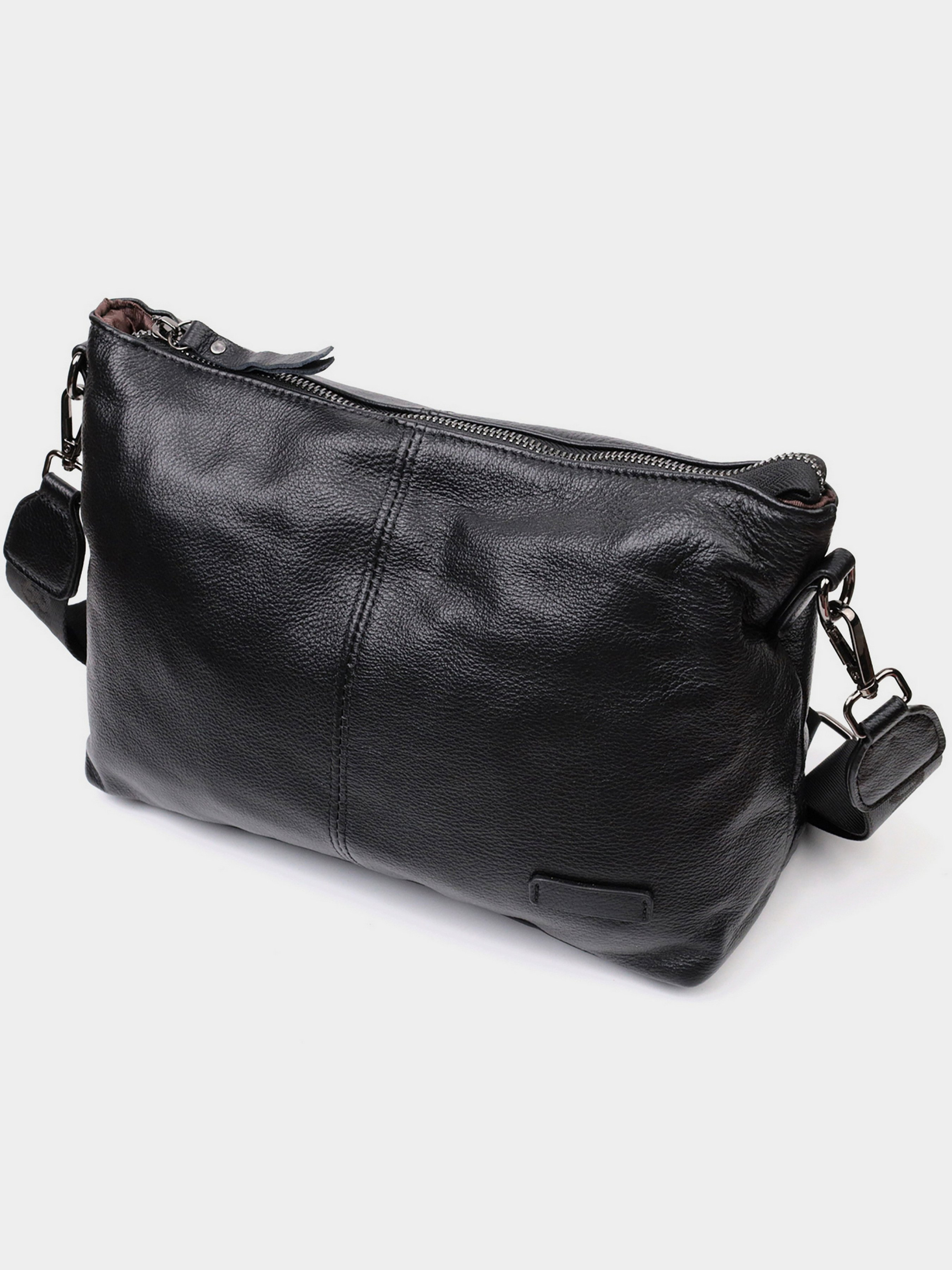 Колір: чорний; Матеріал: натуральна шкіра; Розмір (ШхВхГ, см): 28х21х11 см; Країна виробник: Китай. Бренд: Vintage. Особливості: - одне основне відділення, що закривається на блискавку; - усередині: потайна кишеня на блискавці та кишеня відкритого типу; - знімний текстильний ремінь; - знімний шкіряний ремінь. Модна та зручна жіноча сумка на кожен день з м'якої натуральної шкіри, яка чудово носиться та не втрачає свого первісного вигляду. Аксесуар складається з одного основного відділення, потайної кишені на блискавці та кишені відкритого типу. Носити сумку можна в руках, на плечі і через плече, для цього є шкіряний і текстильний ремінці, що знімаються. У виробі використано якісну фурнітуру кольору темного срібла. Відмінний варіант як сумочка на кожен день.