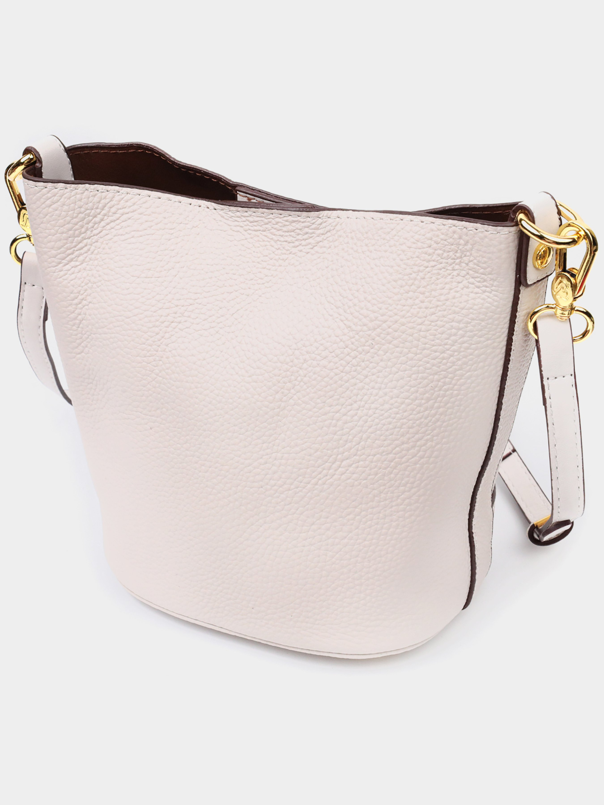 Колір: білий; Матеріал: натуральна шкіра; Розмір (ШхВхГ, см): 22х18х12 см; Країна виробник: Китай. Бренд: Vintage. Особливості: - закривається навпіл на магніт; - широке основне відділення; - знімна косметичка всередині; - металеві ніжки для захисту дна сумки; - знімний шкіряний ремінь. Зручна жіноча сумка з твердим дном, без підкладки та з косметичкою всередині. Виріб пошитий з якісної натуральної шкіри, яка довго носиться і не втрачає свого первісного вигляду. Аксесуар складається з одного відділення, в якому пристібається косметичка, що закривається на блискавку. Носити сумку можна на плечі і через плече, для цього є шкіряний ремінь, що знімається. У виробі використано якісну фурнітуру кольору жовтого золота. Універсальний варіант сумки як на вечір так і як сумочка на кожен день.