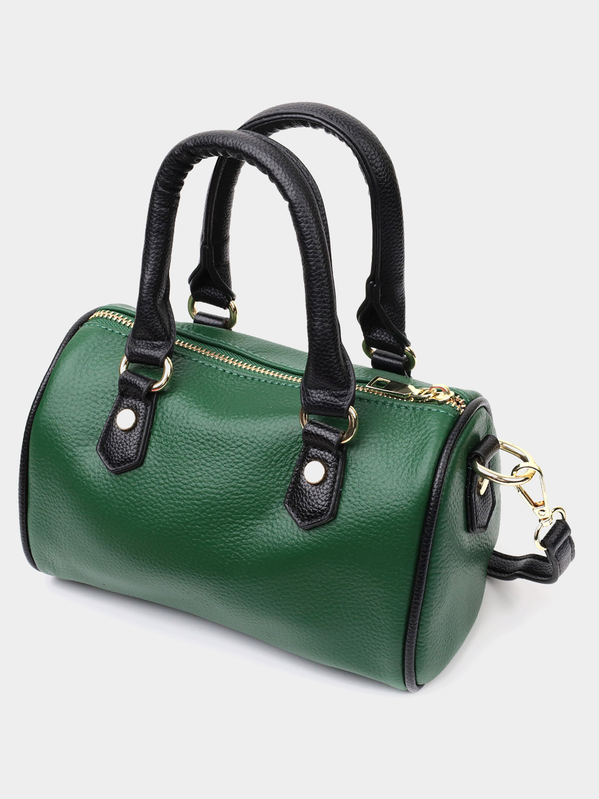 Колір: зелений; Матеріал: натуральна шкіра; Розмір (ШхВхГ, см): 19,5х14х11 см; Країна виробник: Китай. Бренд: Vintage. Особливості: - закривається на блискавку; - одне відділення в якому потайна кишеня на блискавці; - металеві ніжки для захисту дна сумки; - знімний шкіряний ремінь. Цікава жіноча сумка-бочонок з натуральної шкіри. Виріб представлений у поєднанні двох кольорів зеленого та чорного. Аксесуар складається з одного відділення в якому потайна кишеня на блискавці. Носити сумку можна в руці, для цього передбачені шкіряні ручки, а також на плечі та через плече, для цього є шкіряний ремінь, що знімається. В аксесуарі використано якісну фурнітуру кольору жовтого золота. Відмінний варіант сумки для жінок, які люблять якісні та стильні речі.