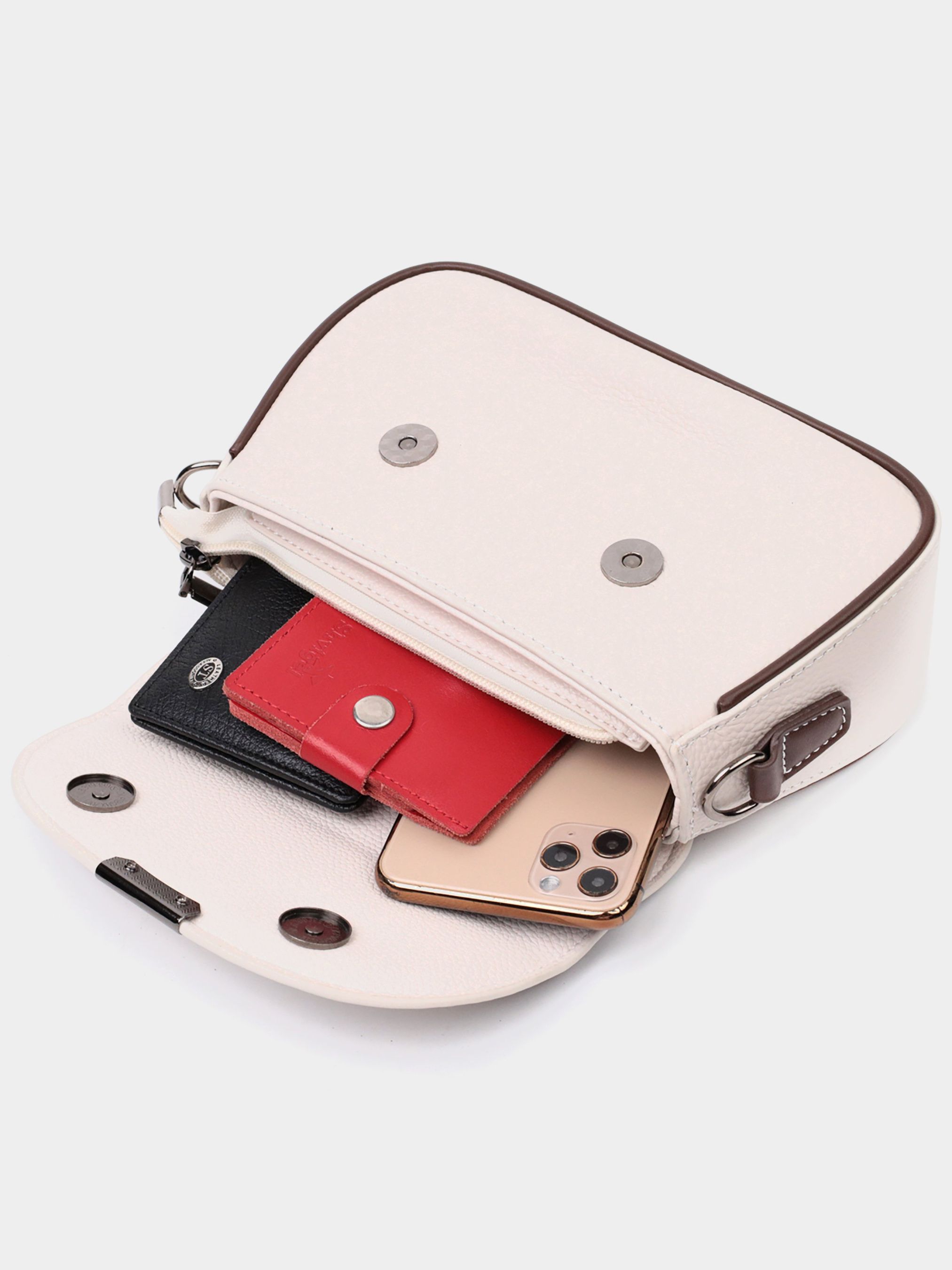 Колір: білий; Матеріал: натуральна шкіра; Розмір (ШхВхГ, см): 22х14х6,5 см; Країна виробник: Китай. Бренд: Vintage. Особливості: - закривається на блискавку та клапан із двома магнітами; - усередині: два відділення, кишеня-перегородка, потайна кишеня на блискавці та кишеня відкритого типу; - знімний шкіряний ремінь. Каркасна жіноча сумка з натуральної шкіри флотар, яка невибаглива у догляді та довго носиться. У виробі використана шкіра білого та коричневого кольору. Аксесуар складається з двох основних відділень, кишені-перегородки, потайної кишені на блискавці та кишені відкритого типу. Носити сумку можна в руці, під рукою, на плечі і через плече, для цього є шкіряний ремінь, що знімається. В аксесуарі використано якісну фурнітуру кольору срібла. Універсальний варіант сумки на вечір, щодня, а також відмінно поєднуватиметься з діловим стилем.